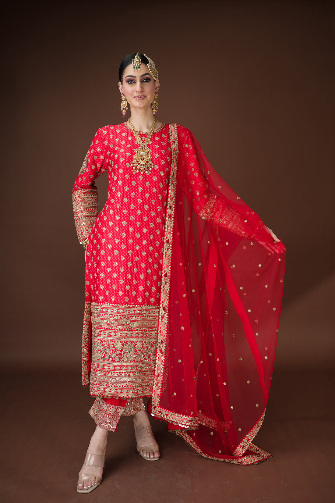 A classic sindoori red raw silk suit intricately embroidered with zardozi, sequins, and resham threadwork....