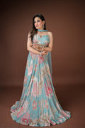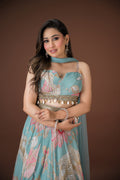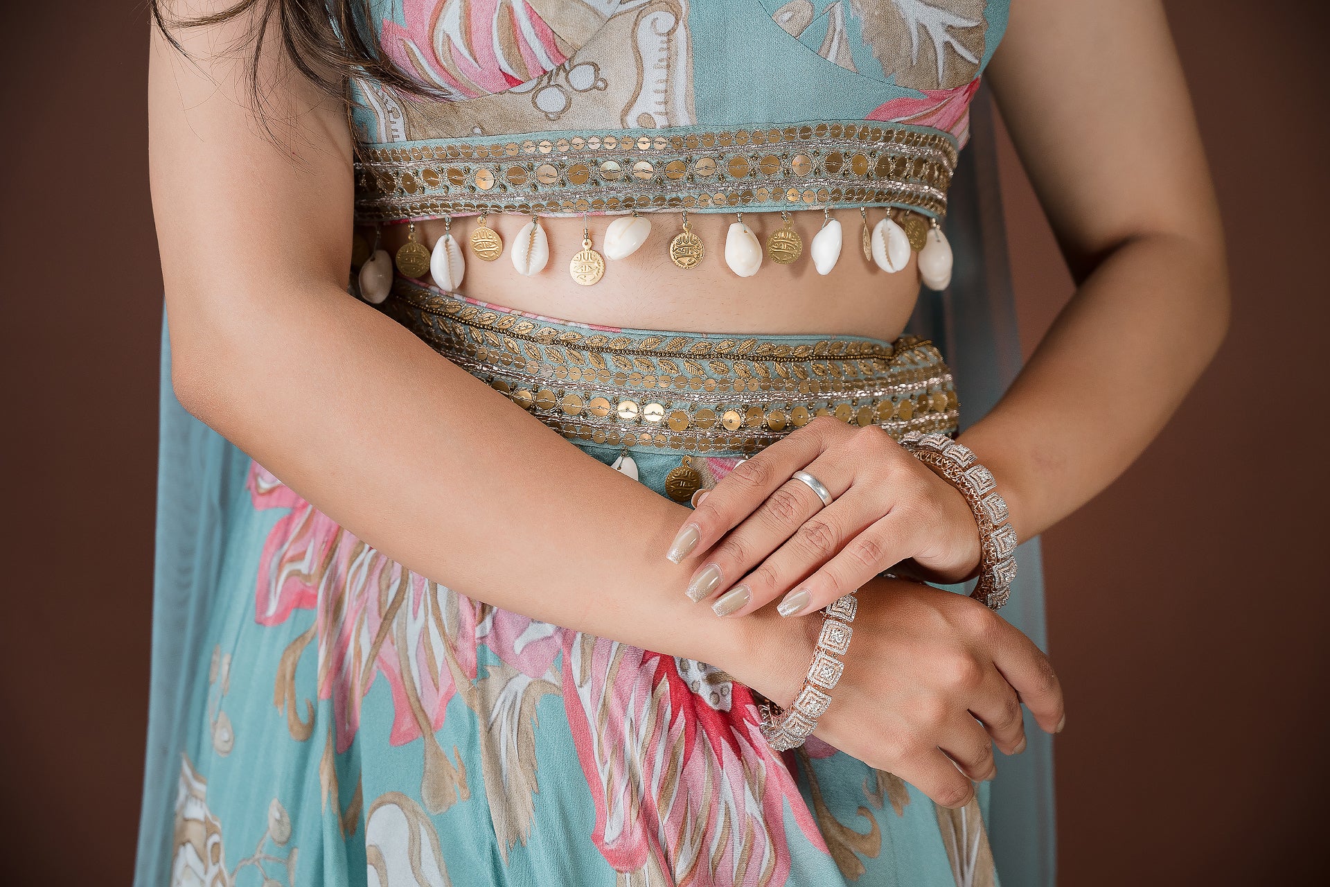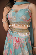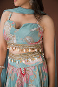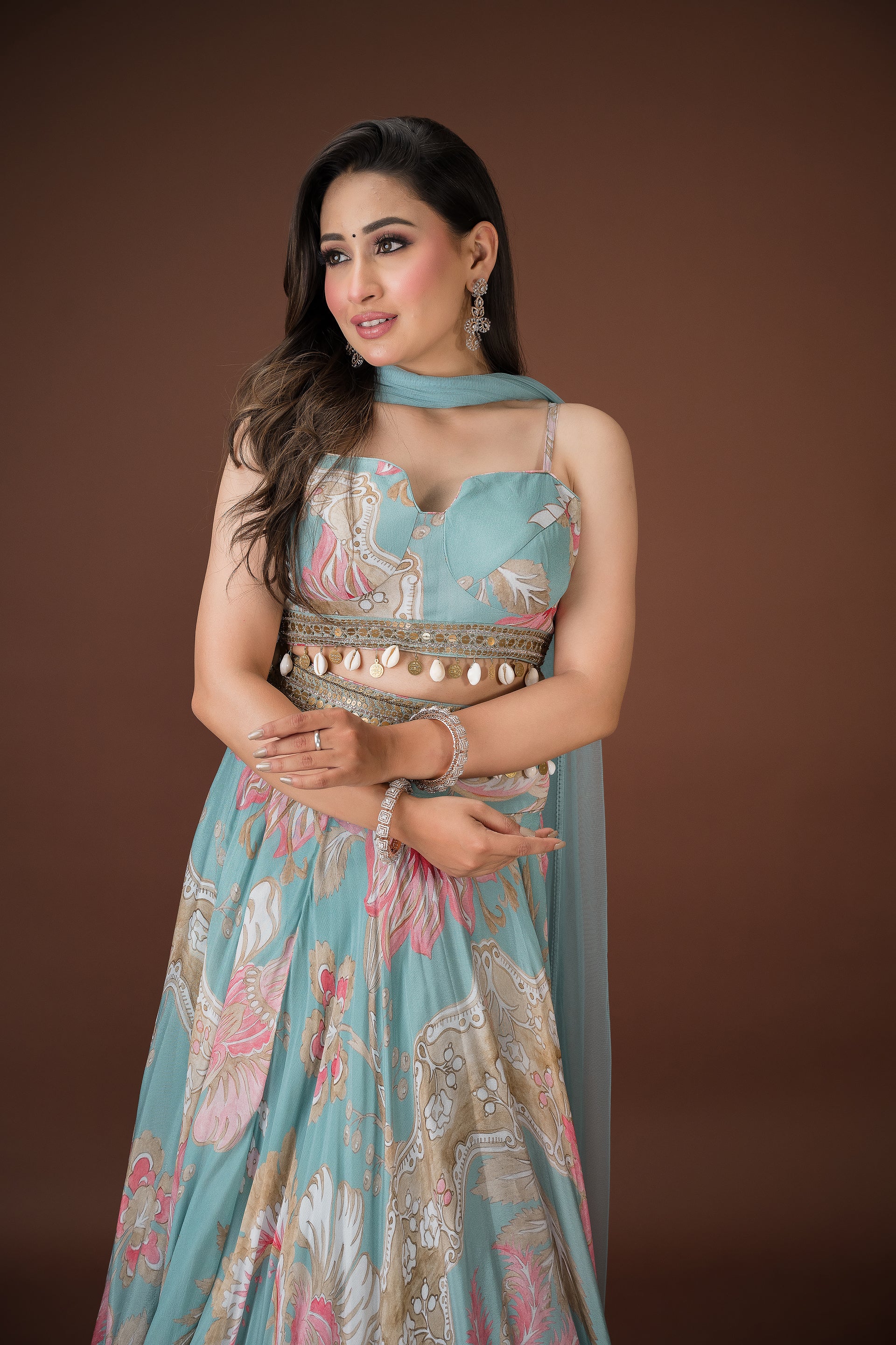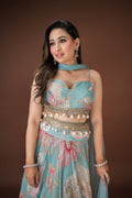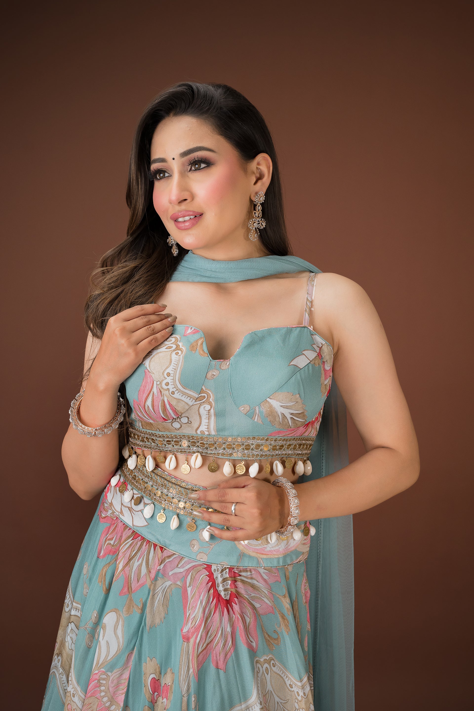 This elegant lehenga choli features a soft aqua blue hue with intricate floral embroidery in pink, gold, and ivory. The fitted choli has a deep V-neckline and is accented with a golden embellished belt. The flowing lehenga skirt with hand embroidery on the prints and the seashell tassels creates a graceful silhouette, complemented by a sheer aqua blue dupatta.