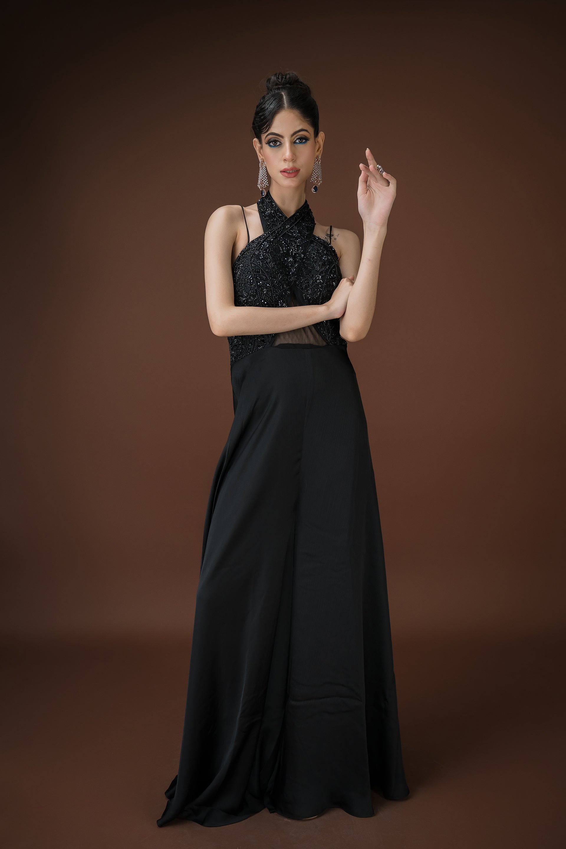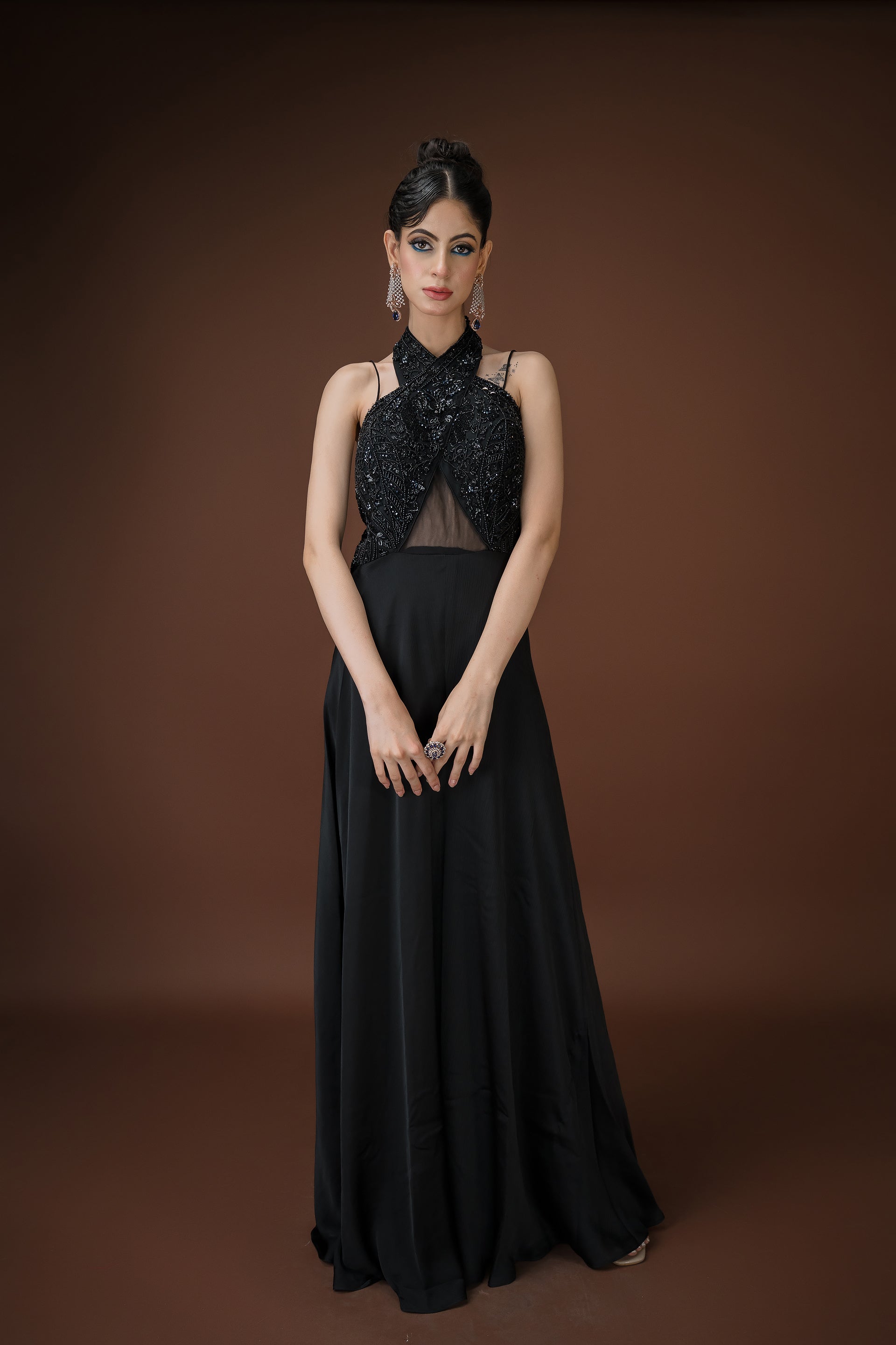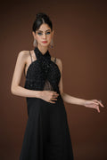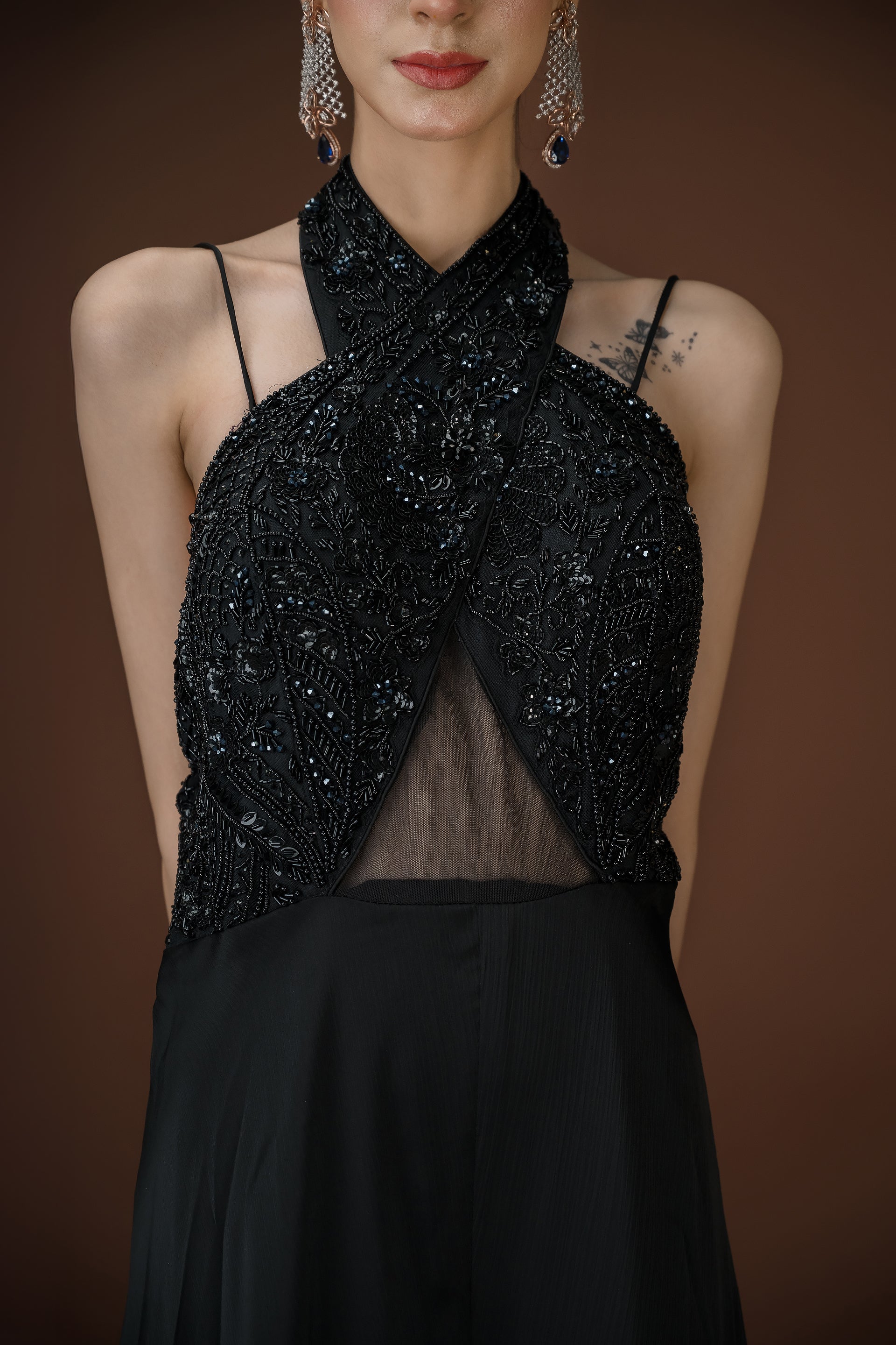 this outfit boasts a smooth, rich texture that drapes beautifully, creating a flattering silhouette. The stunning black hue of the garment is enhanced by the application of black pearl cut dana, adding a touch of glamour and sophistication. The top features a delicate, beaded halter neckline with a mesh panel, providing a modern, yet graceful, aesthetic. The beaded embellishments shimmer subtly, creating a mesmerizing play of light as you move. The skirt flows effortlessly to the floor, offering a dramatic and graceful movement with each step, further elevating the ensemble’s regal appeal