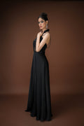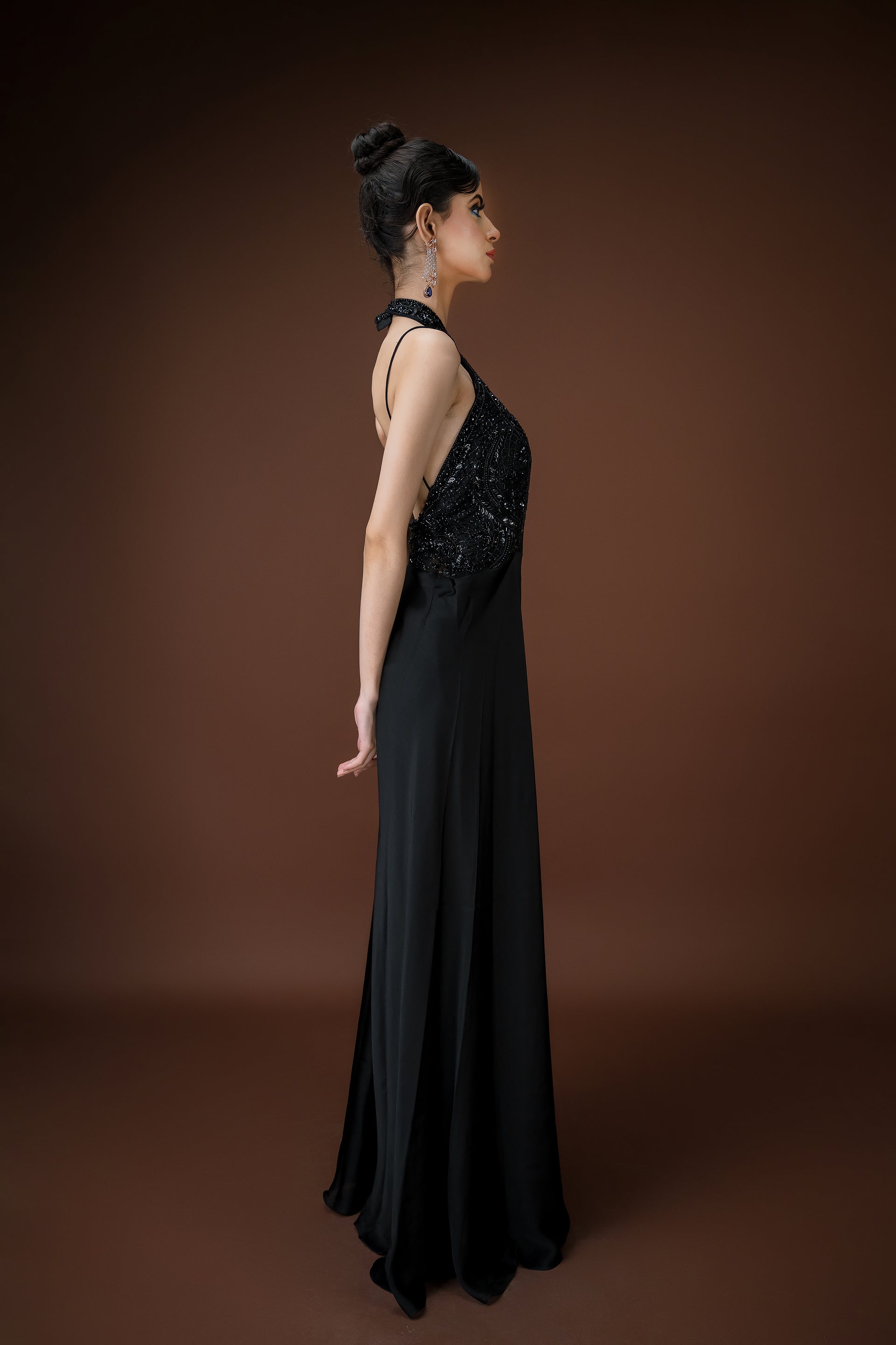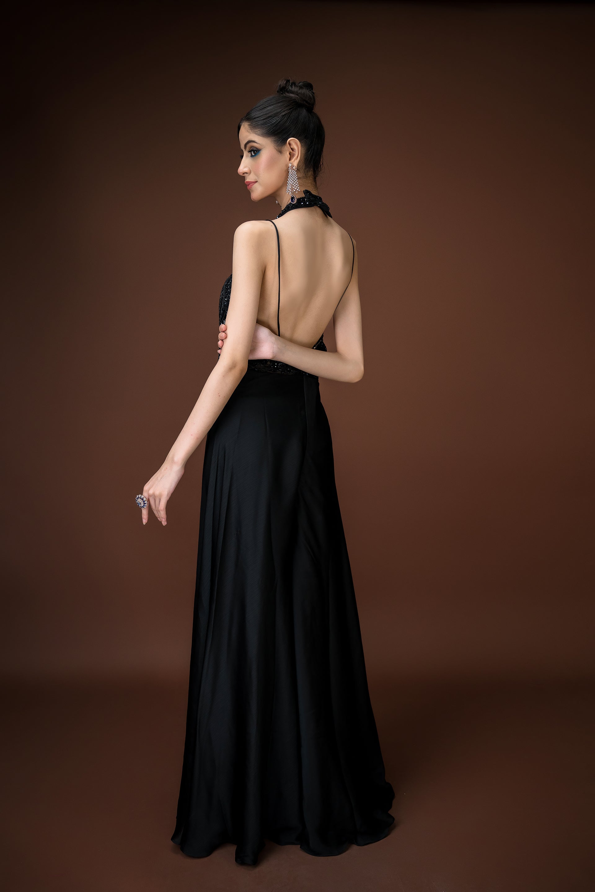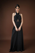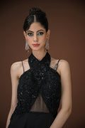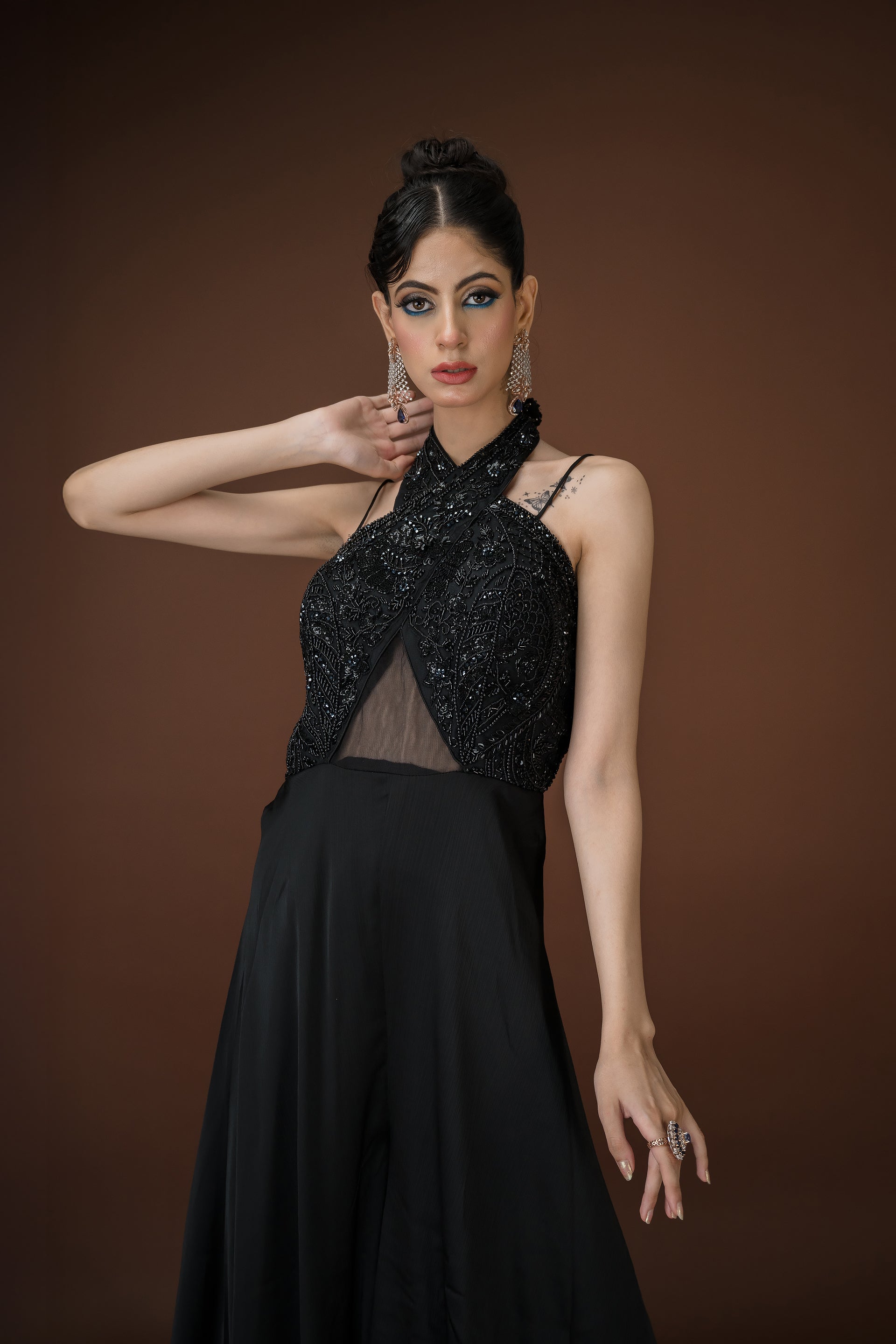 this outfit boasts a smooth, rich texture that drapes beautifully, creating a flattering silhouette. The stunning black hue of the garment is enhanced by the application of black pearl cut dana, adding a touch of glamour and sophistication. The top features a delicate, beaded halter neckline with a mesh panel, providing a modern, yet graceful, aesthetic. The beaded embellishments shimmer subtly, creating a mesmerizing play of light as you move. The skirt flows effortlessly to the floor, offering a dramatic and graceful movement with each step, further elevating the ensemble’s regal appeal