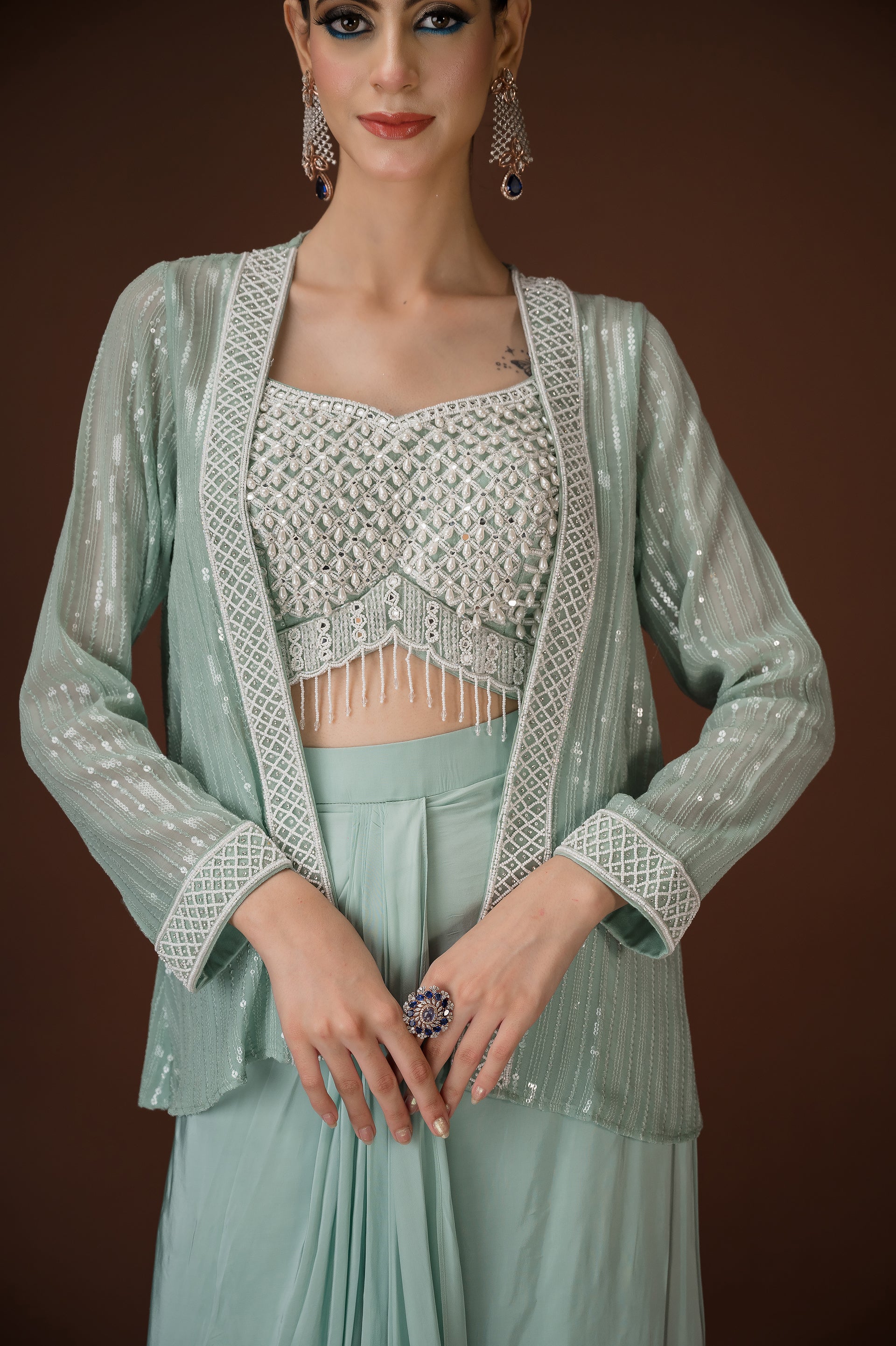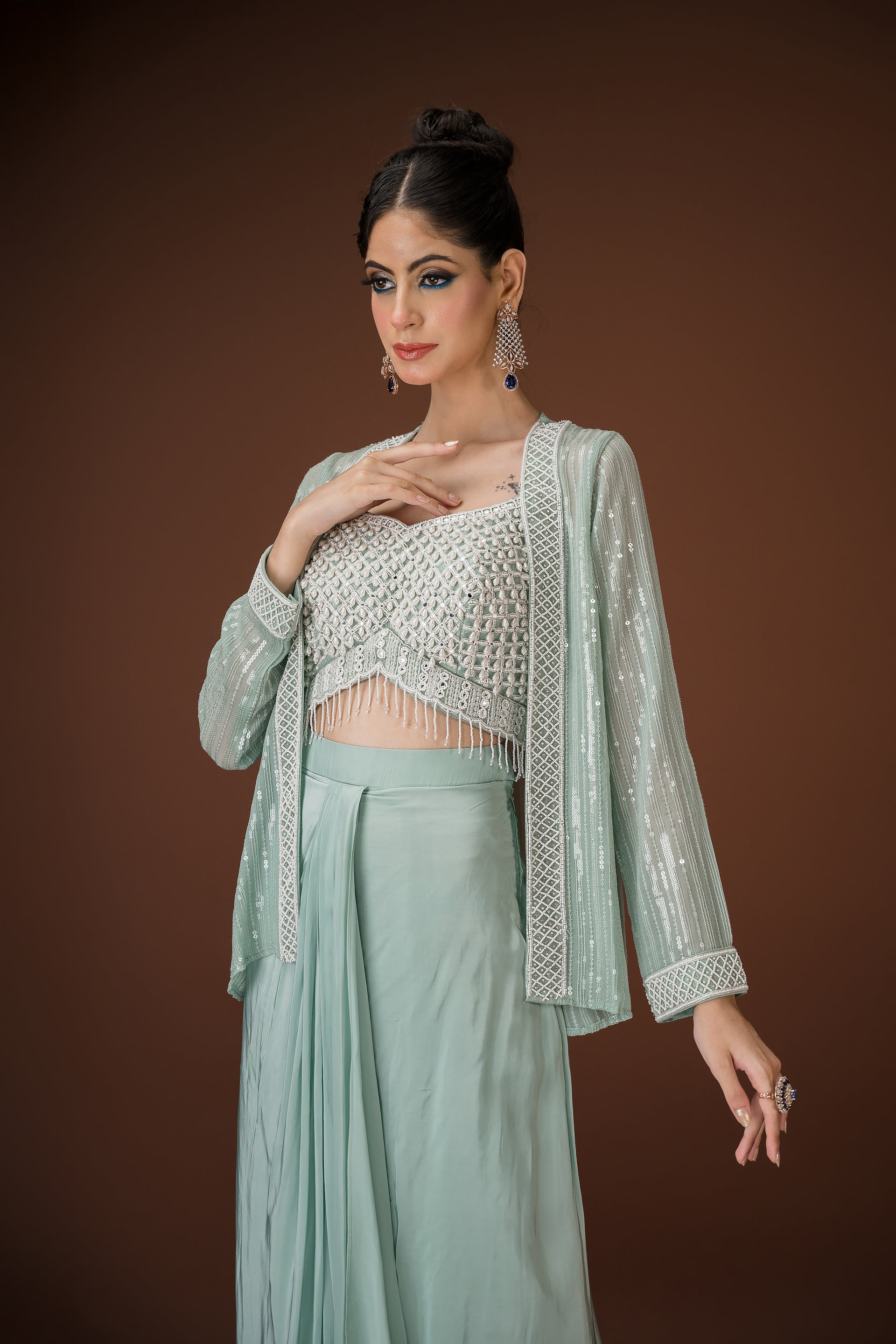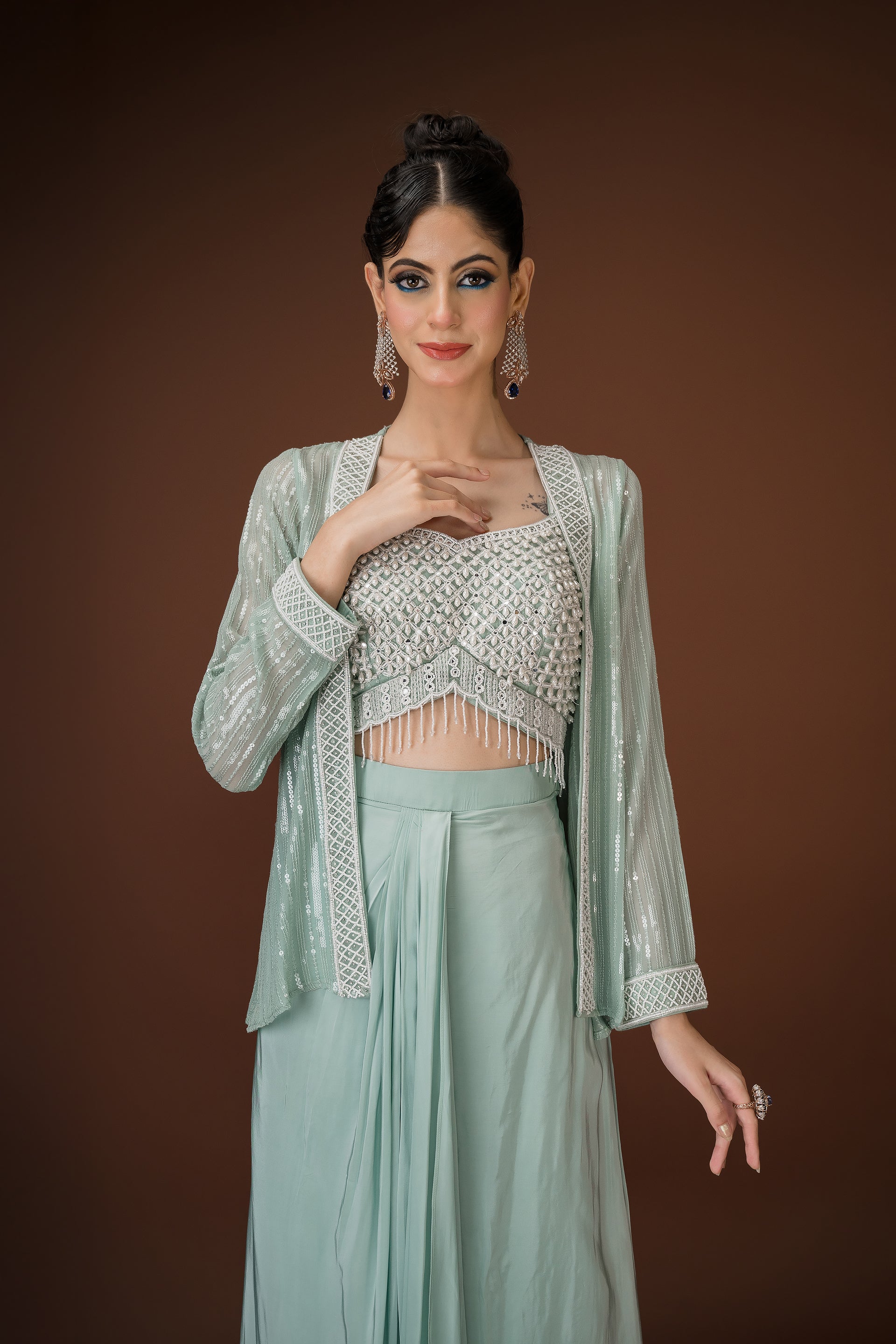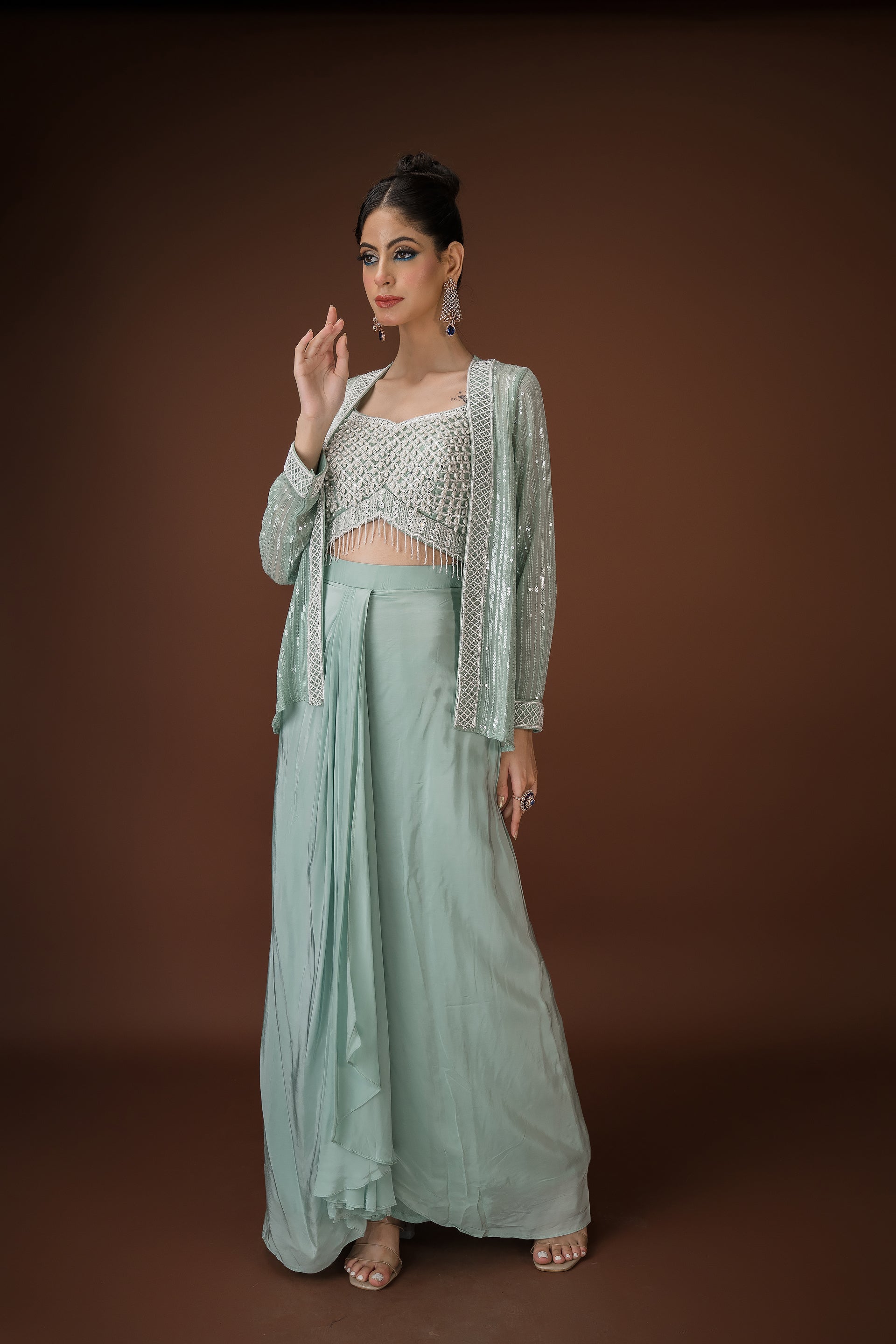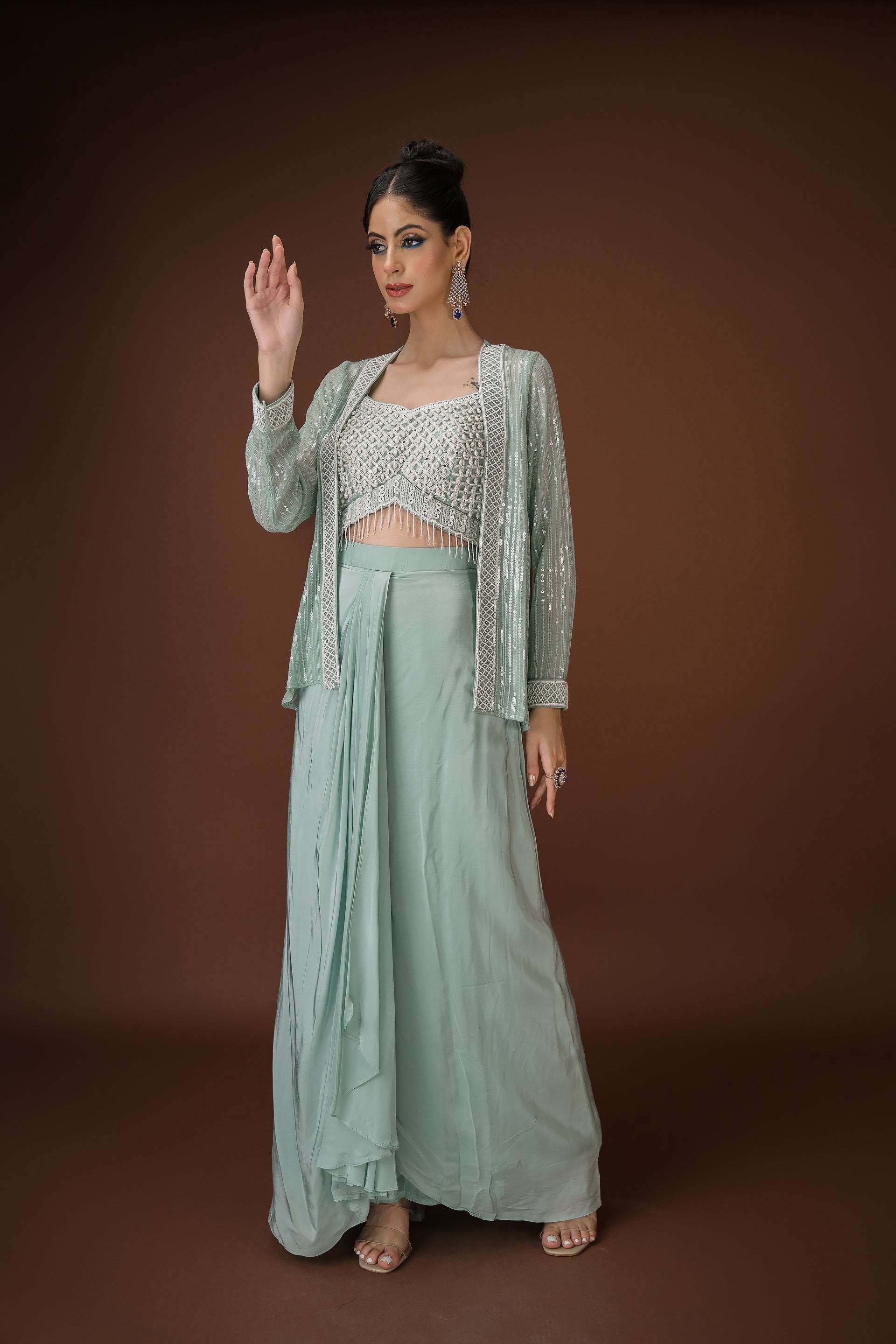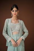 Mint Drape Palazzo Set with Hand-Embellished Blouse A statement in soft glamour, this mint three-piece ensemble balances structure and fluidity with effortless charm. The draped palazzo pants offer a saree-inspired silhouette, while the cropped blouse is hand-embellished with pearls, sequins, and mirror work. Paired with a coordinated sheer jacket featuring sequin detailing, this look is perfect for cocktail events, mehendi soirées, or intimate celebrations.