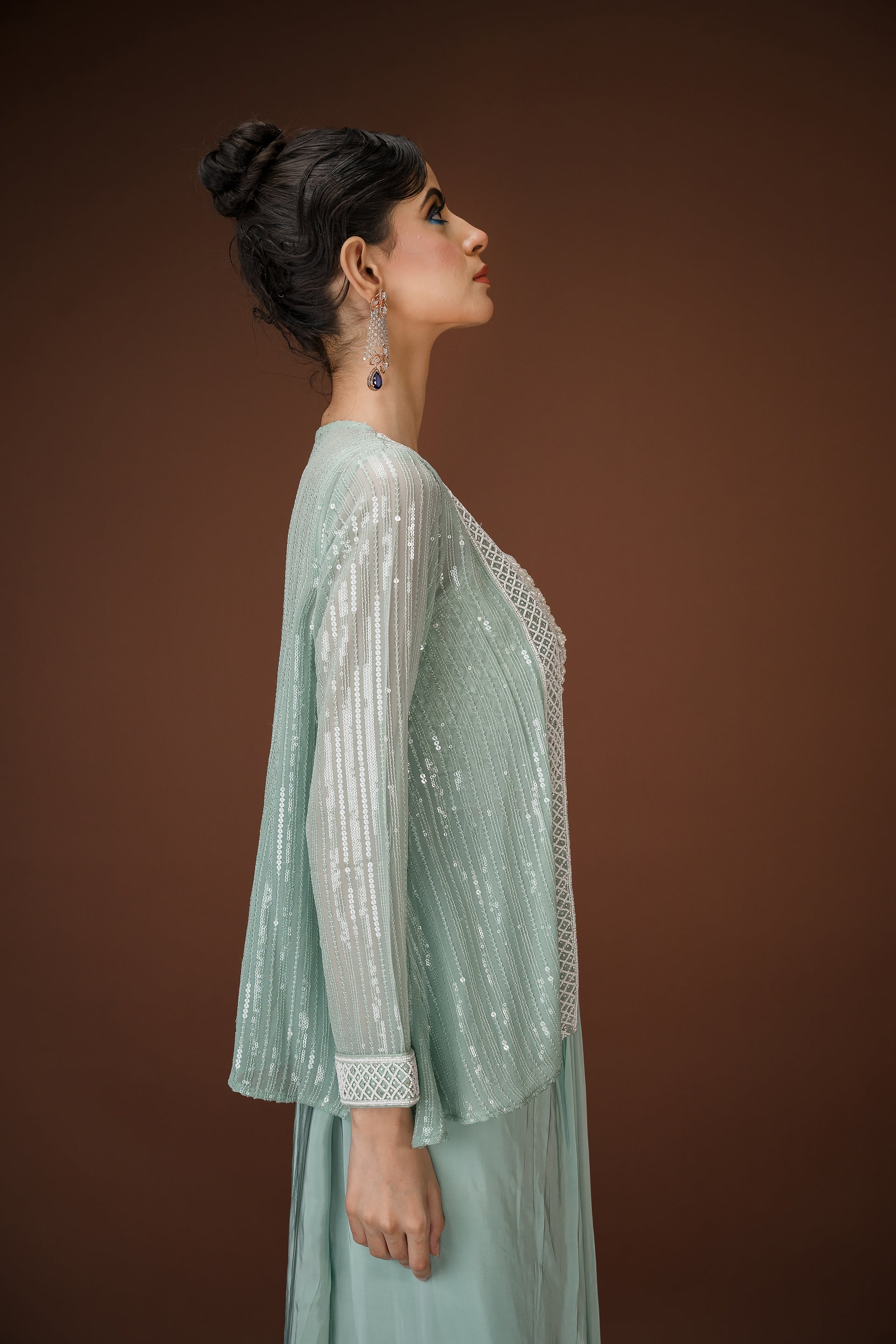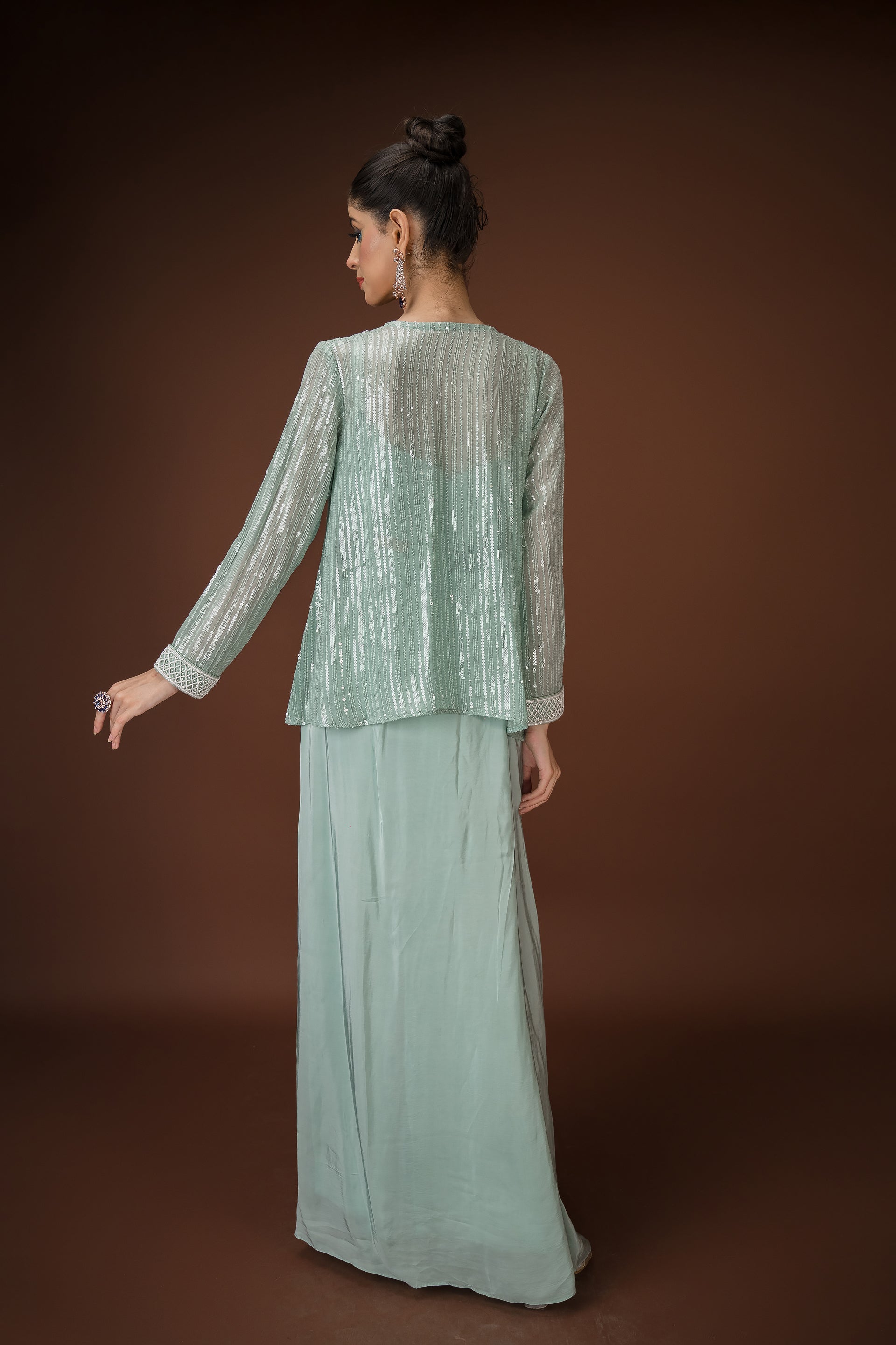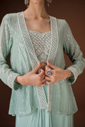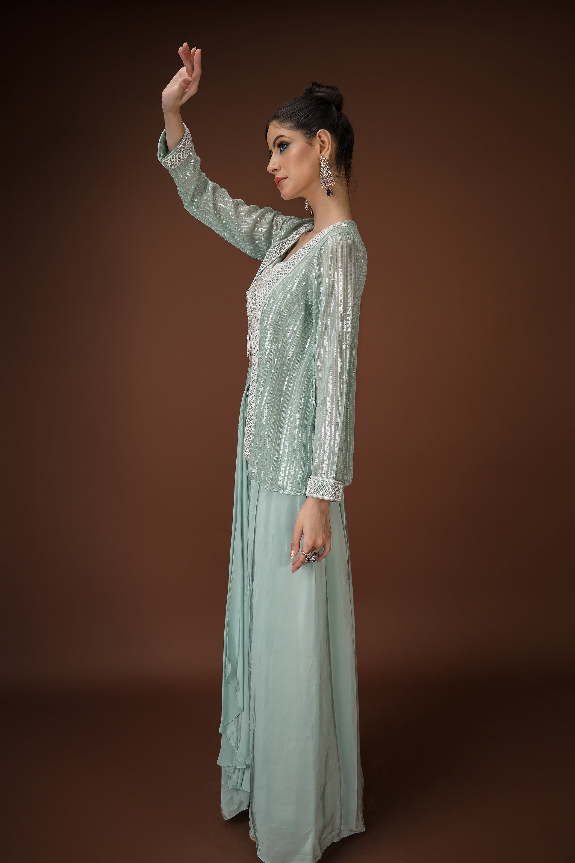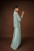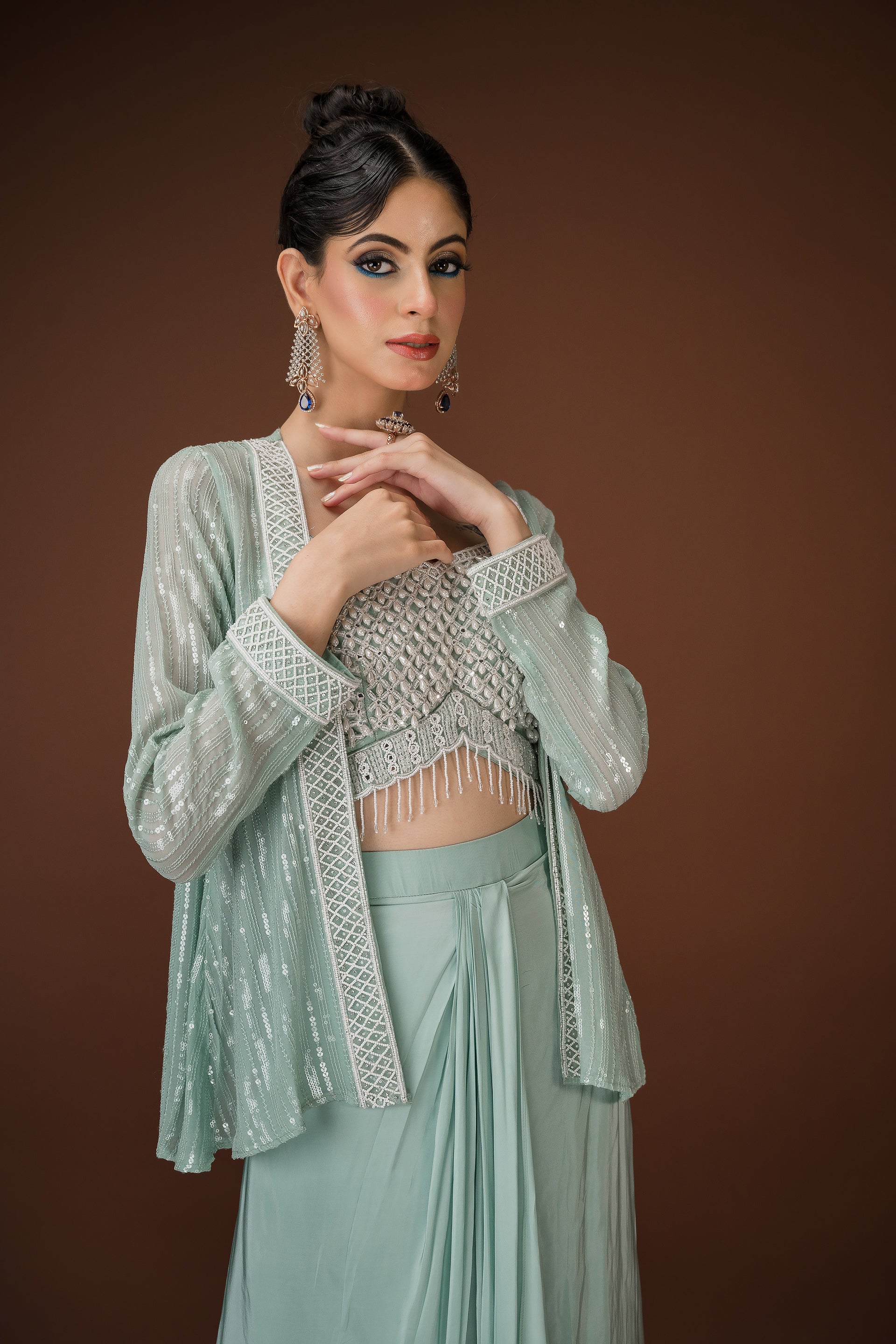 Mint Drape Palazzo Set with Hand-Embellished Blouse A statement in soft glamour, this mint three-piece ensemble balances structure and fluidity with effortless charm. The draped palazzo pants offer a saree-inspired silhouette, while the cropped blouse is hand-embellished with pearls, sequins, and mirror work. Paired with a coordinated sheer jacket featuring sequin detailing, this look is perfect for cocktail events, mehendi soirées, or intimate celebrations.