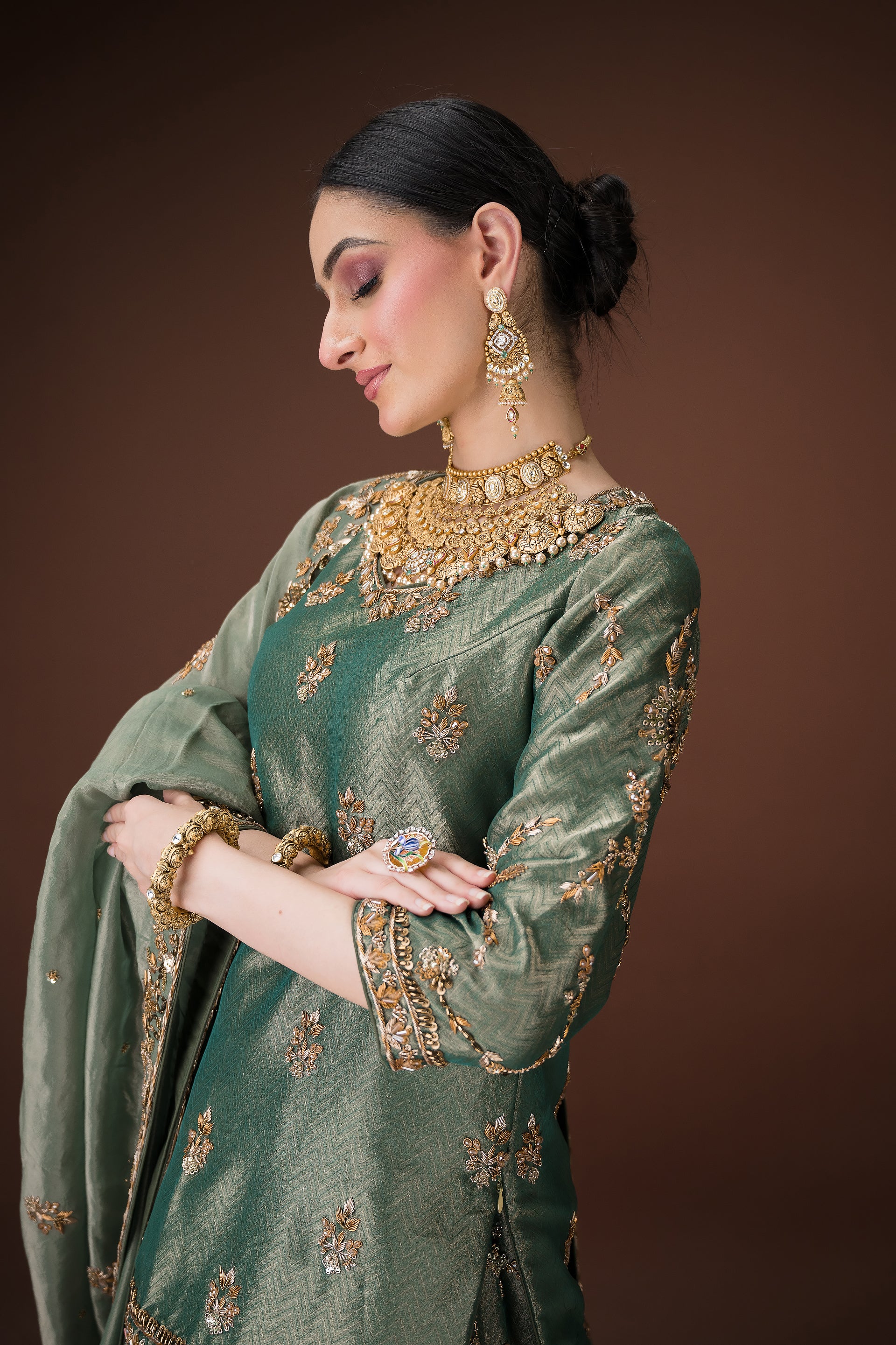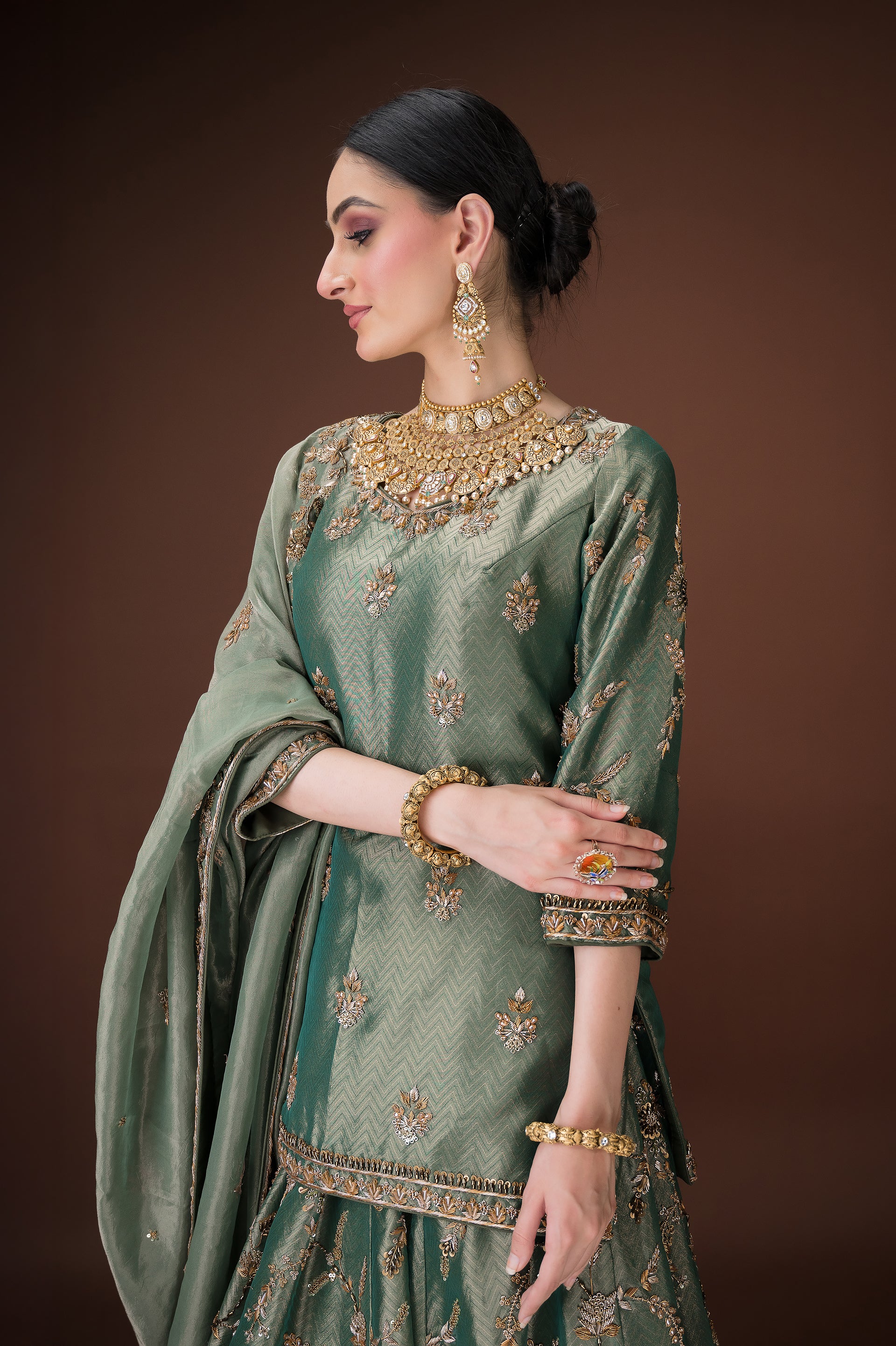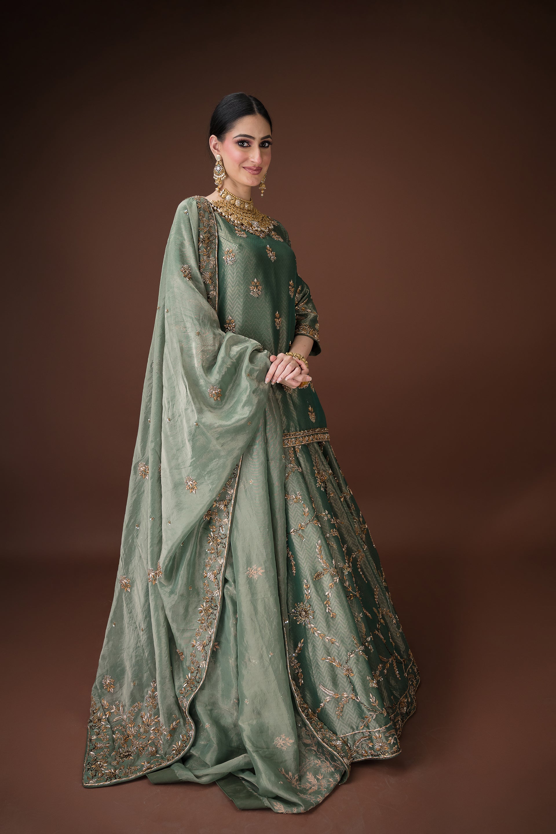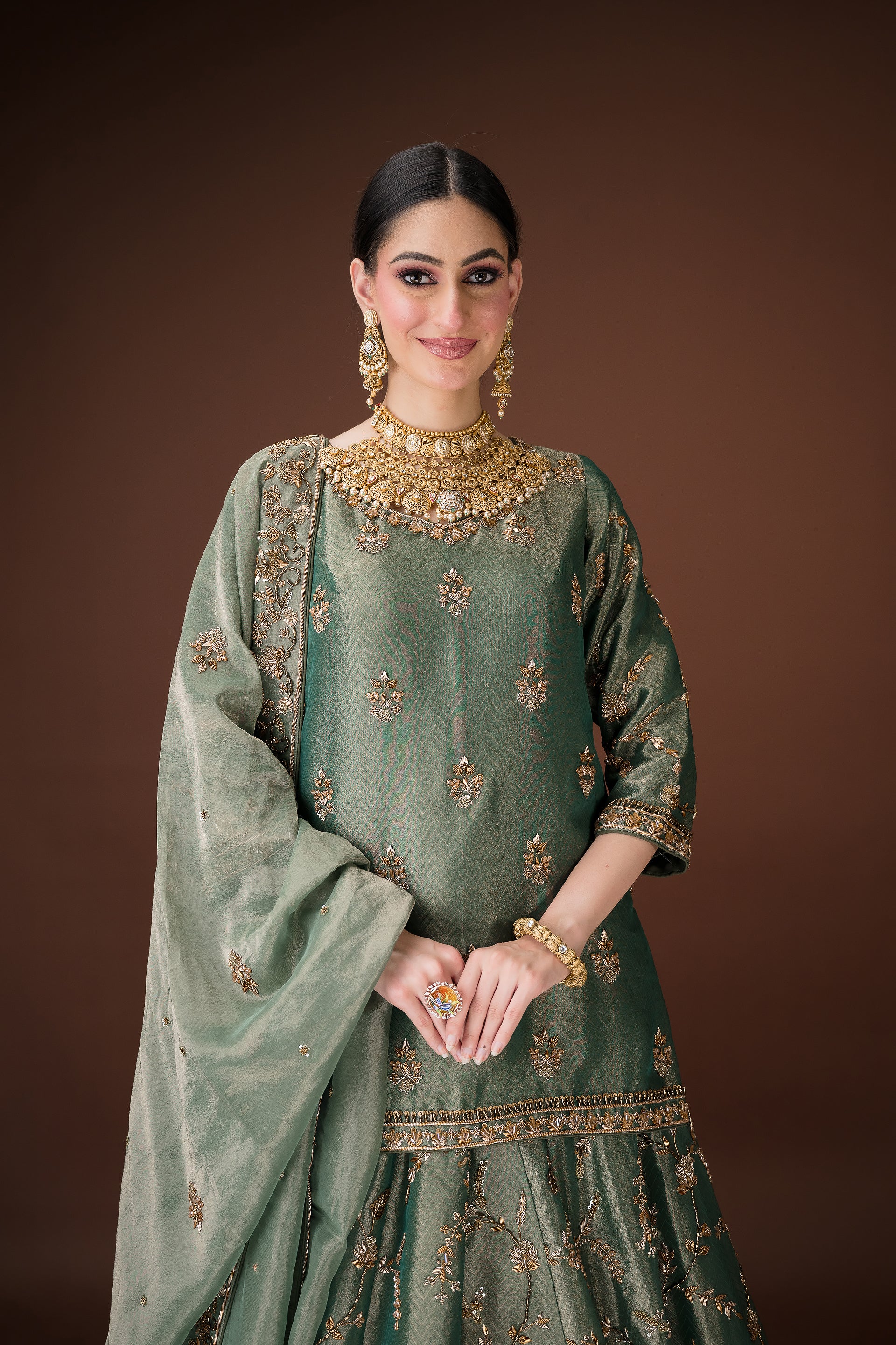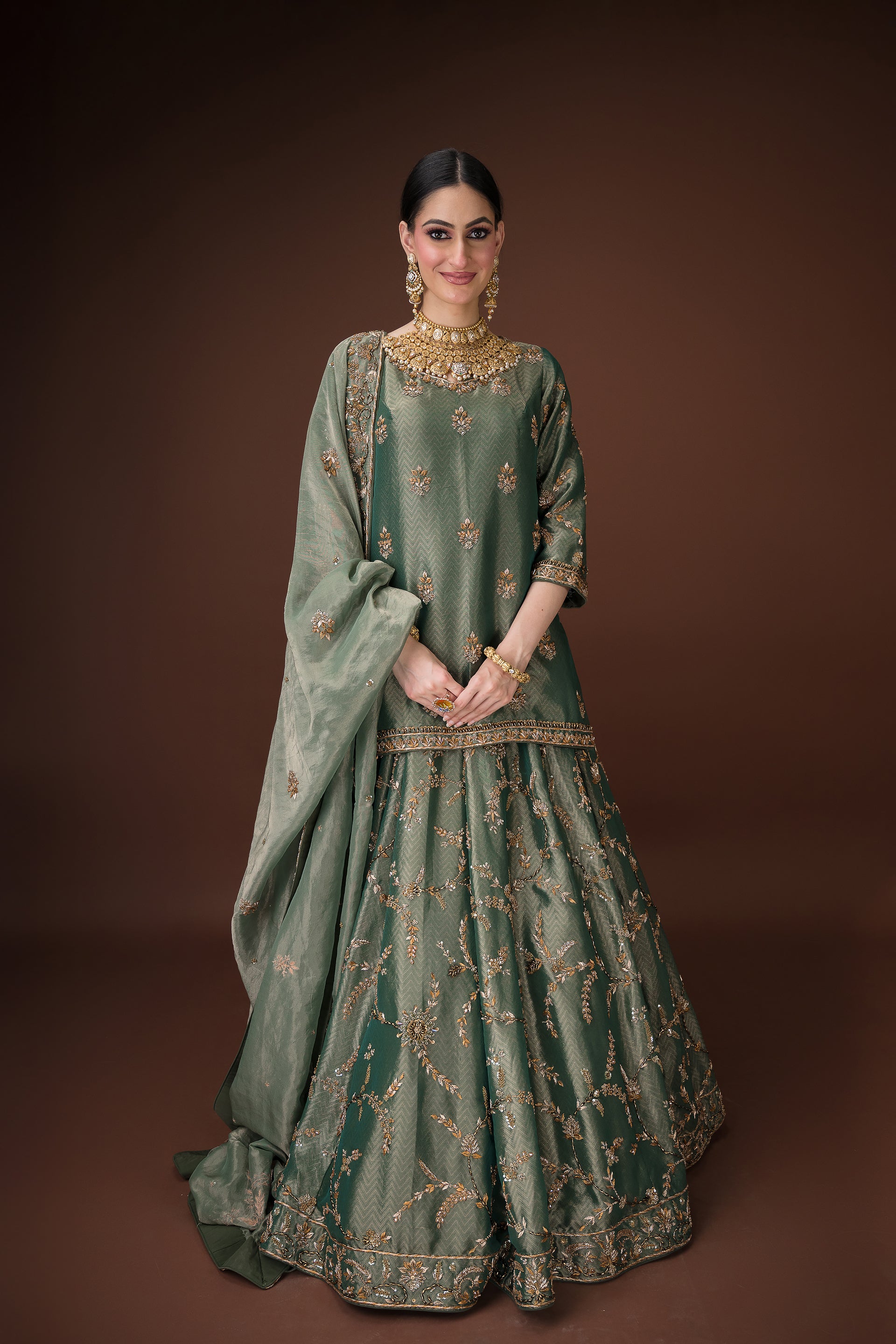 This exquisite ensemble features a long, elegantly tailored shirt paired with a flowing lehenga, both crafted from kanjiwaram fabric. The piece is intricately adorned with antique dabka embroidery, a traditional technique that adds a timeless, opulent touch. The delicate yet detailed work of the dabka is highlighted across the fabric, creating a stunning contrast with the soft, muted green base. The ensemble is further enhanced by a matching dupatta that drapes gracefully over the shoulders, adding depth and sophistication. The overall design exudes a sense of royalty, perfect for weddings, festive events, or special occasions, offering a blend of traditional craftsmanship with modern elegance