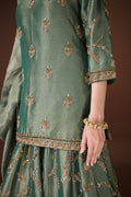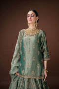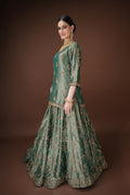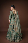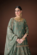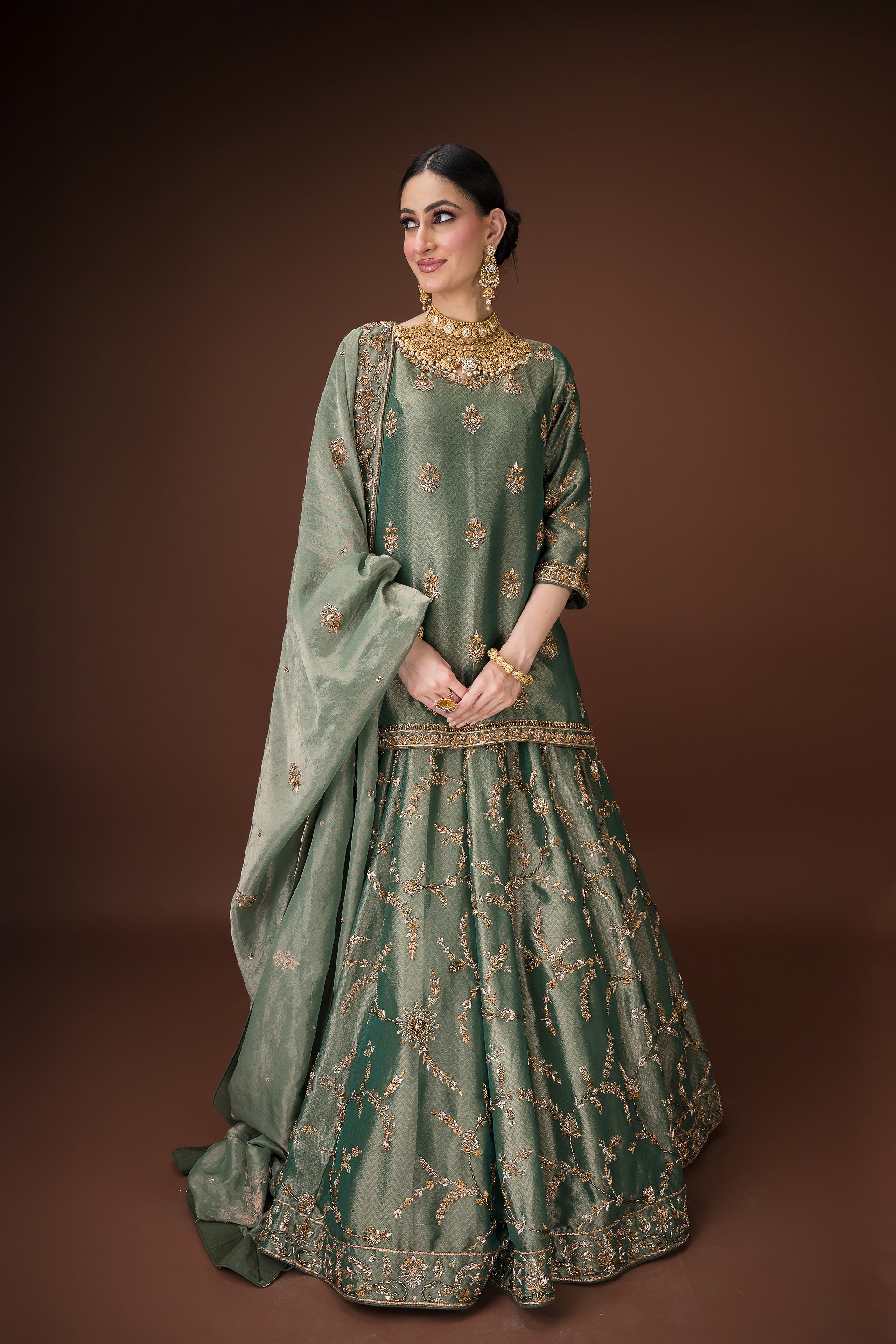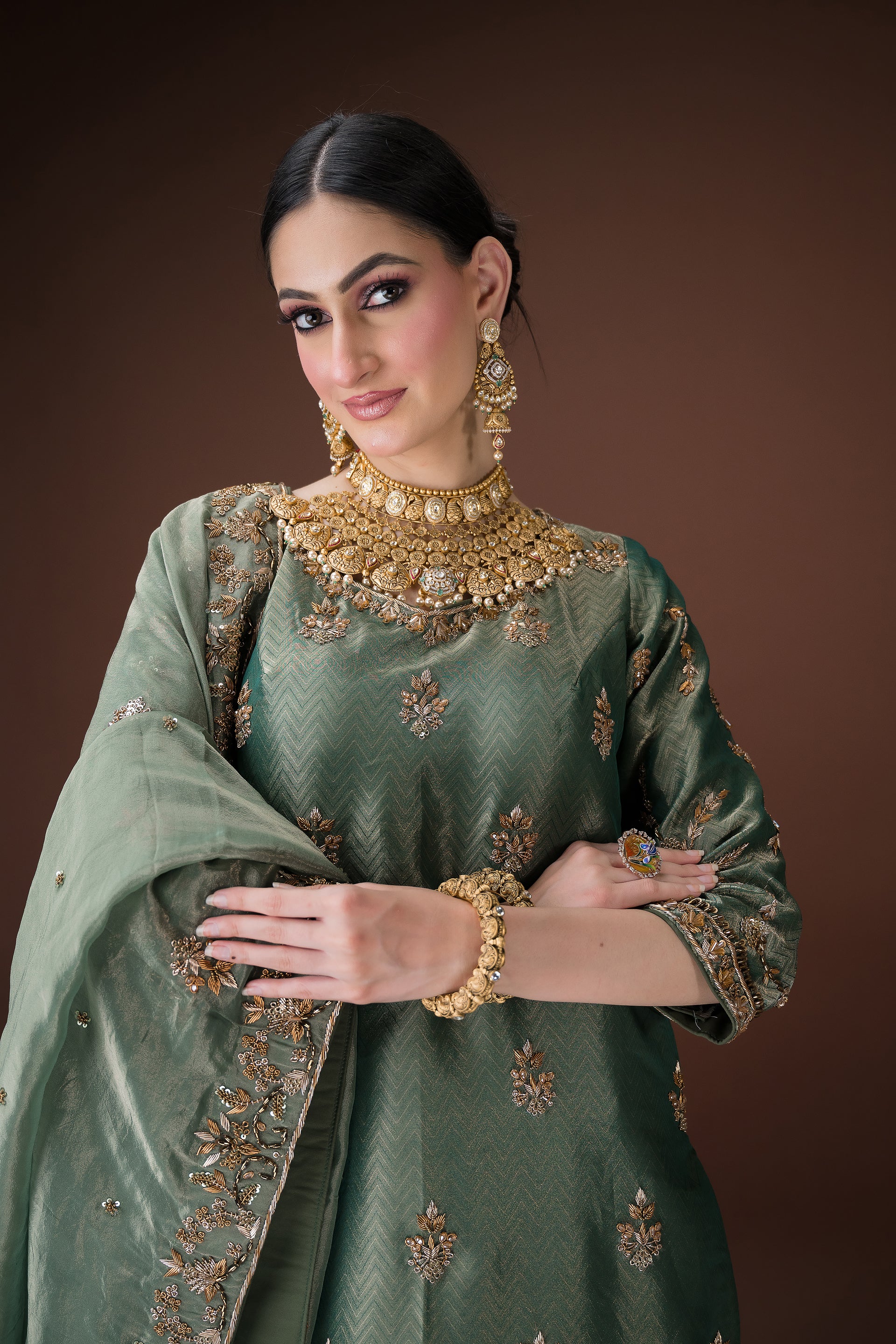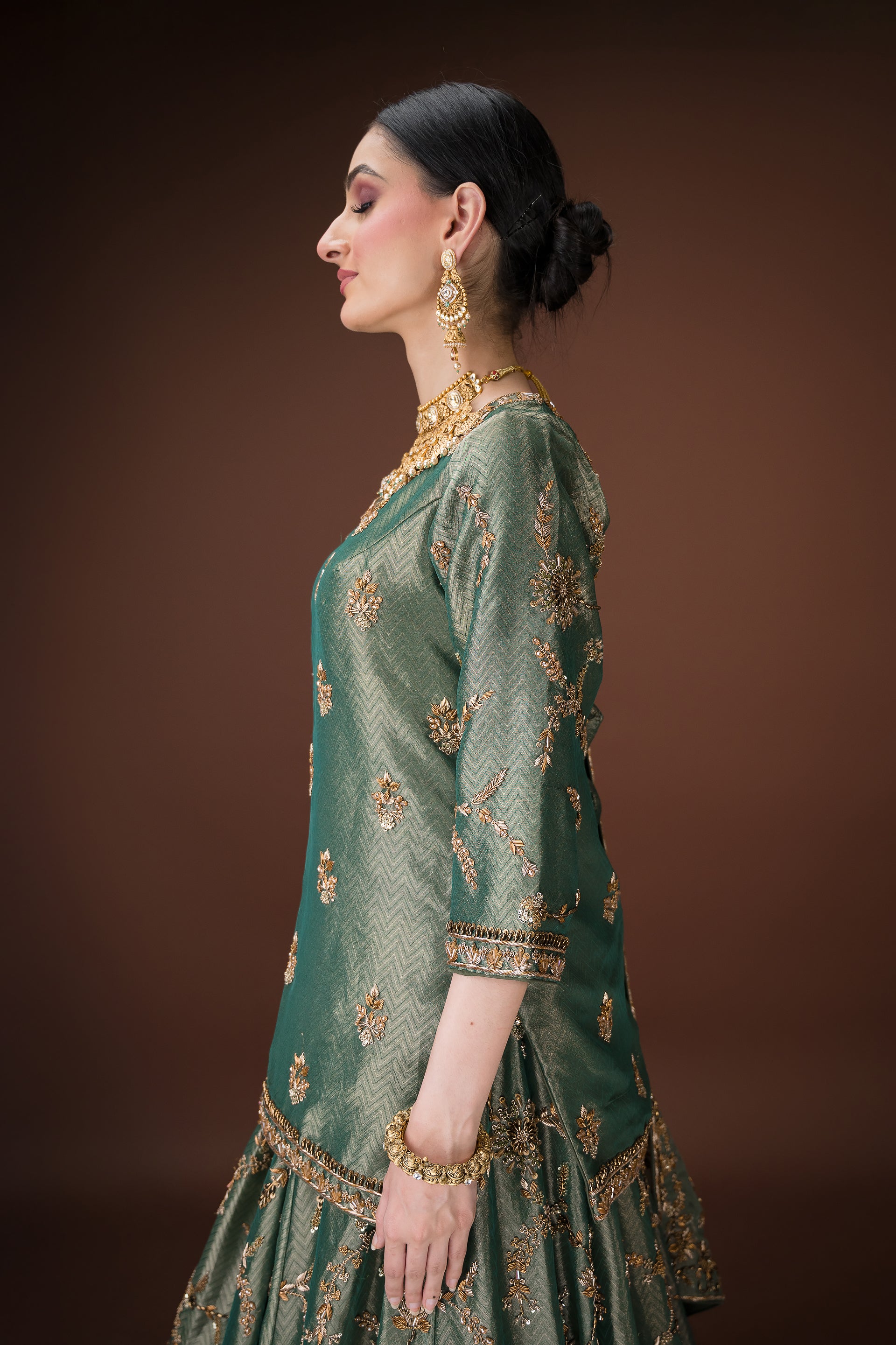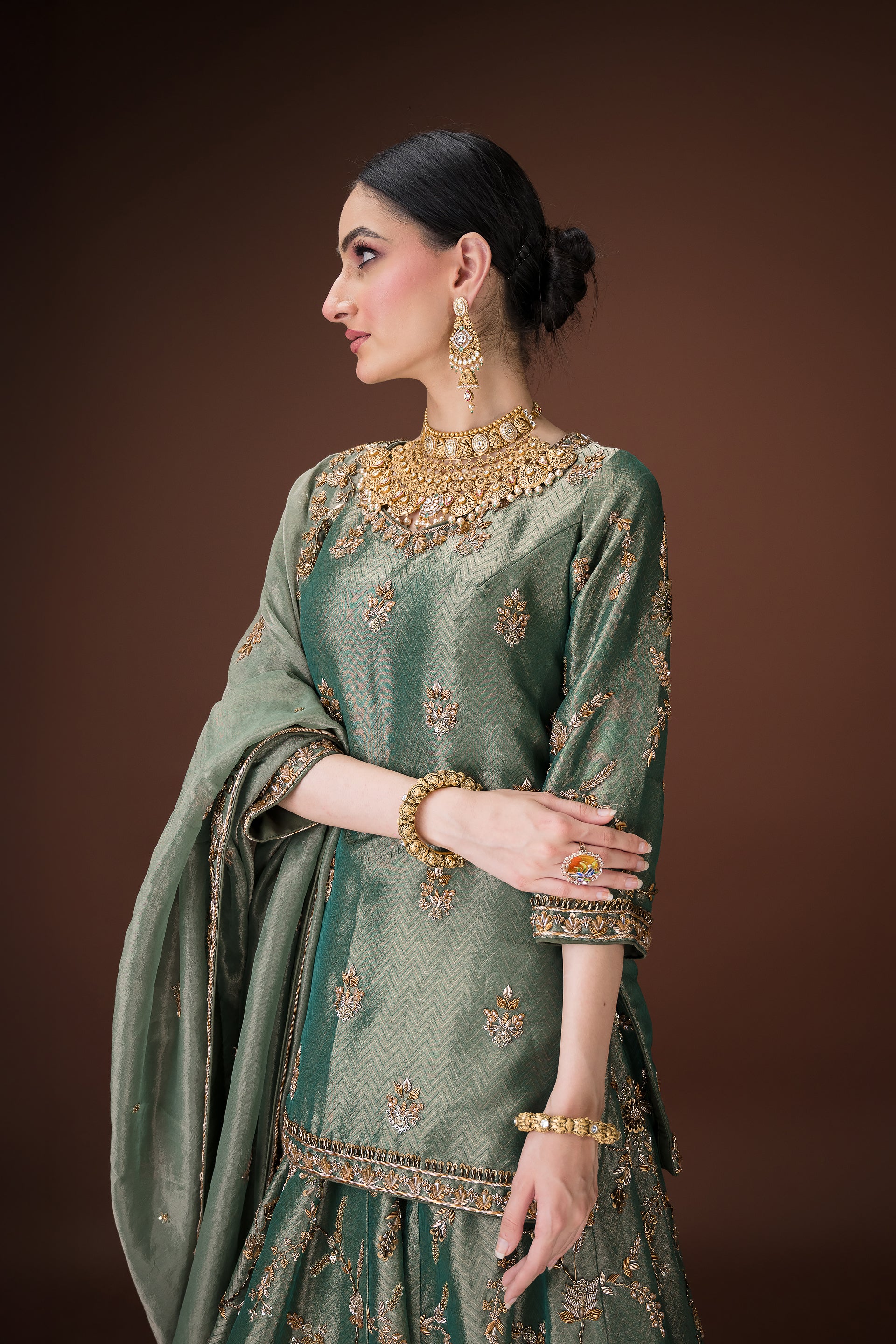 This exquisite ensemble features a long, elegantly tailored shirt paired with a flowing lehenga, both crafted from kanjiwaram fabric. The piece is intricately adorned with antique dabka embroidery, a traditional technique that adds a timeless, opulent touch. The delicate yet detailed work of the dabka is highlighted across the fabric, creating a stunning contrast with the soft, muted green base. The ensemble is further enhanced by a matching dupatta that drapes gracefully over the shoulders, adding depth and sophistication. The overall design exudes a sense of royalty, perfect for weddings, festive events, or special occasions, offering a blend of traditional craftsmanship with modern elegance