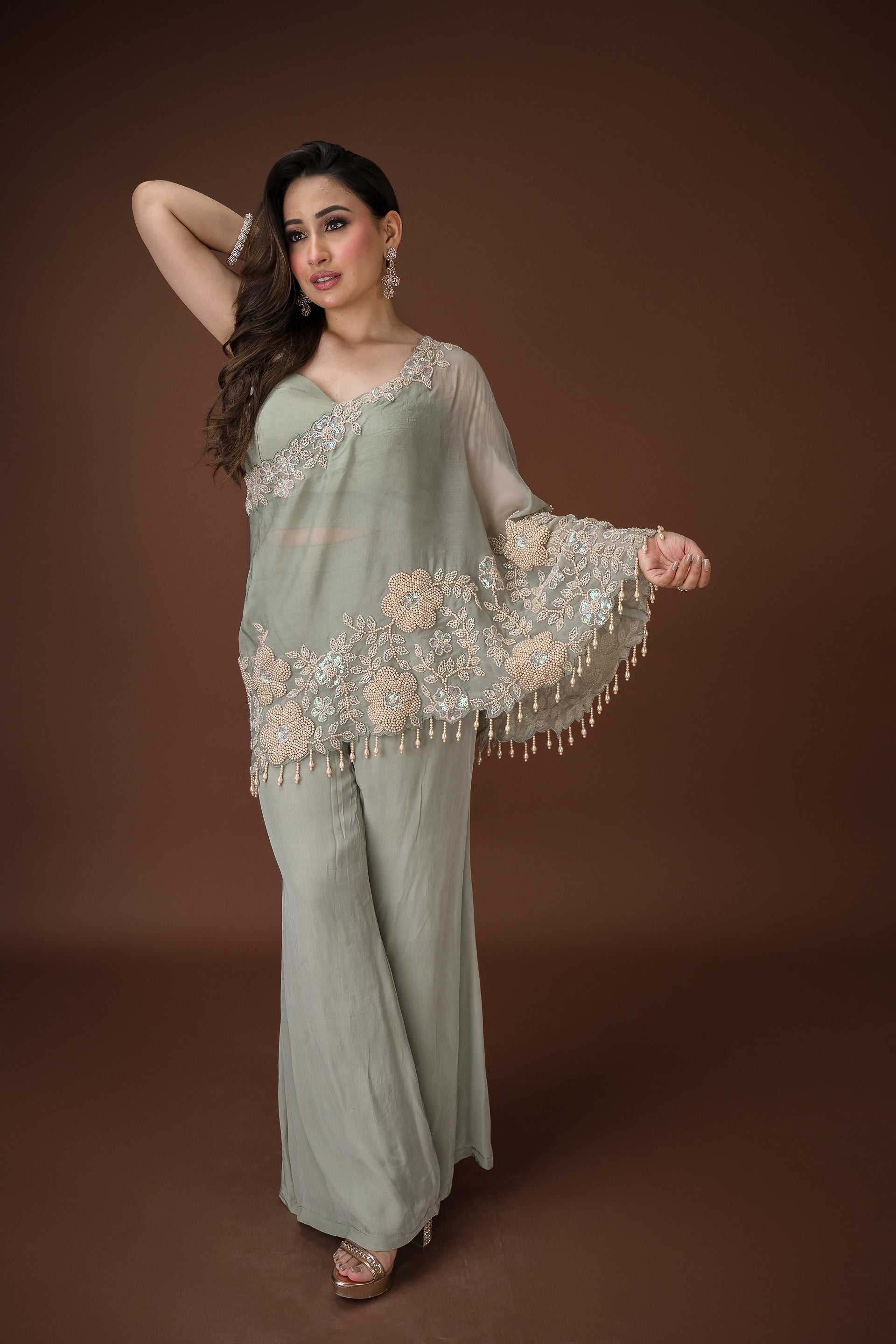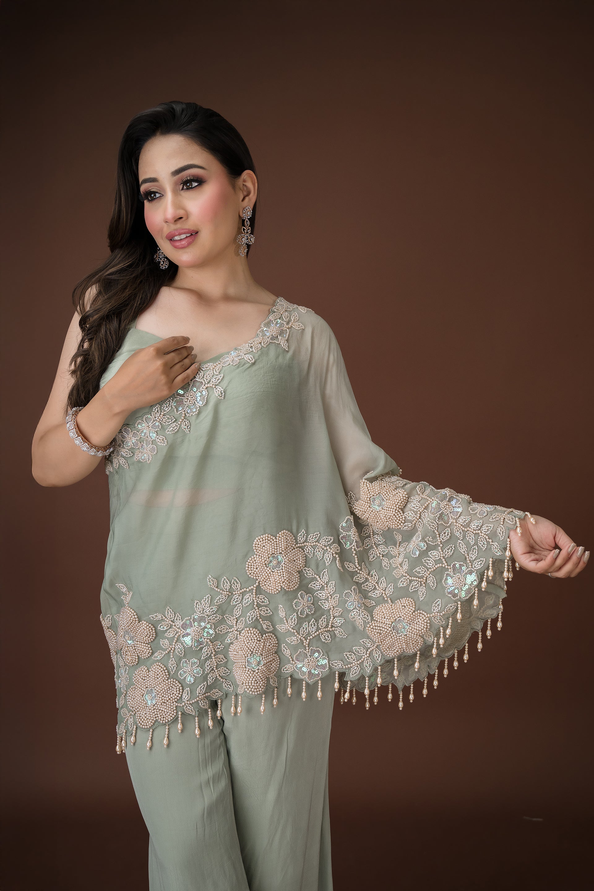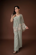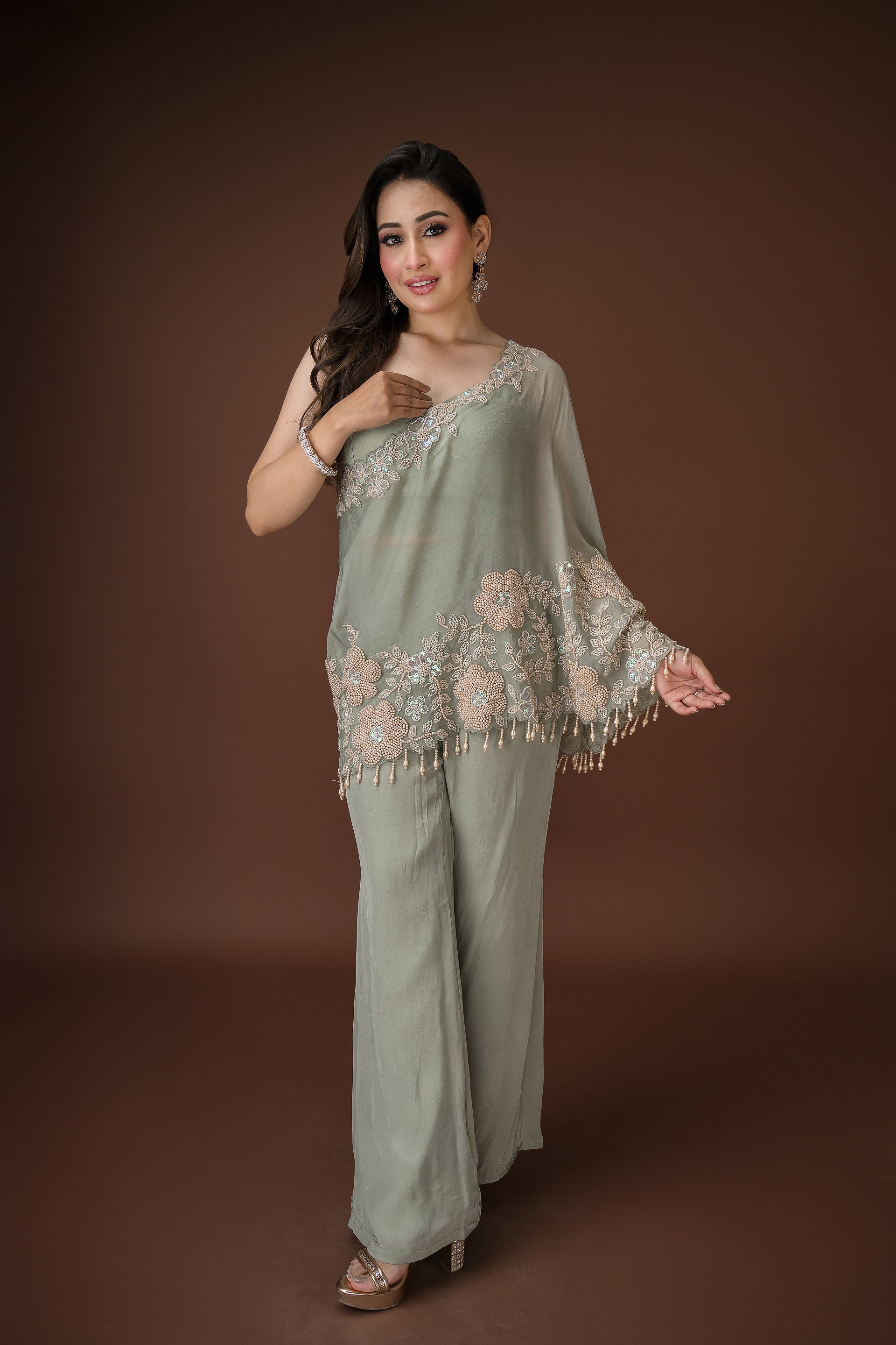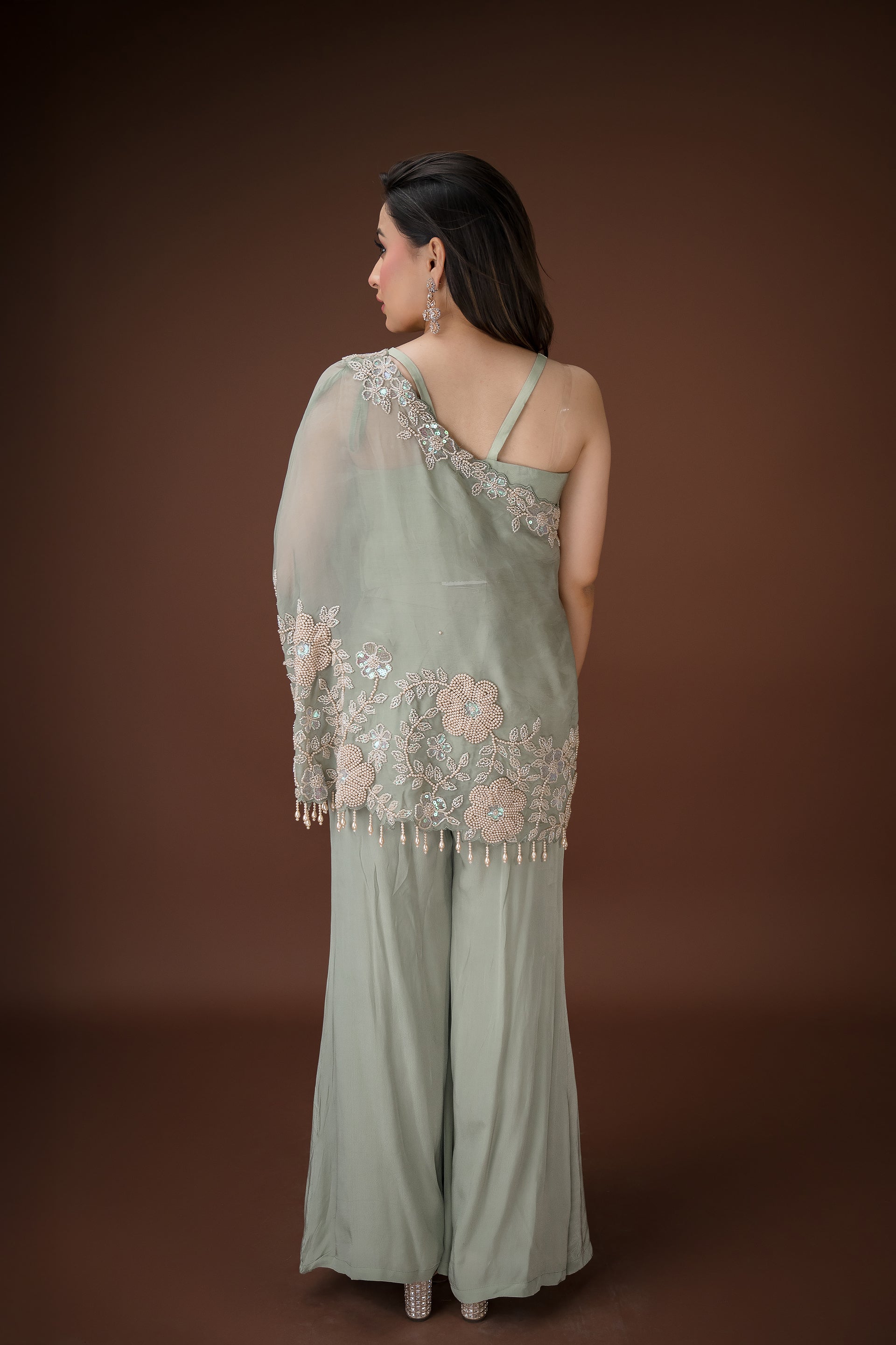 this outfit features a chic one-shoulder asymmetrical top adorned with intricate floral embroidery and delicate beadwork along the hem and sleeve. The soft pastel hue enhances the feminine silhouette, while the relaxed-fit palazzo pants provide comfort and graceful movement. Perfect for festive occasions, weddings, or evening soirees, this ensemble is designed for the modern woman who values effortless style and sophistication