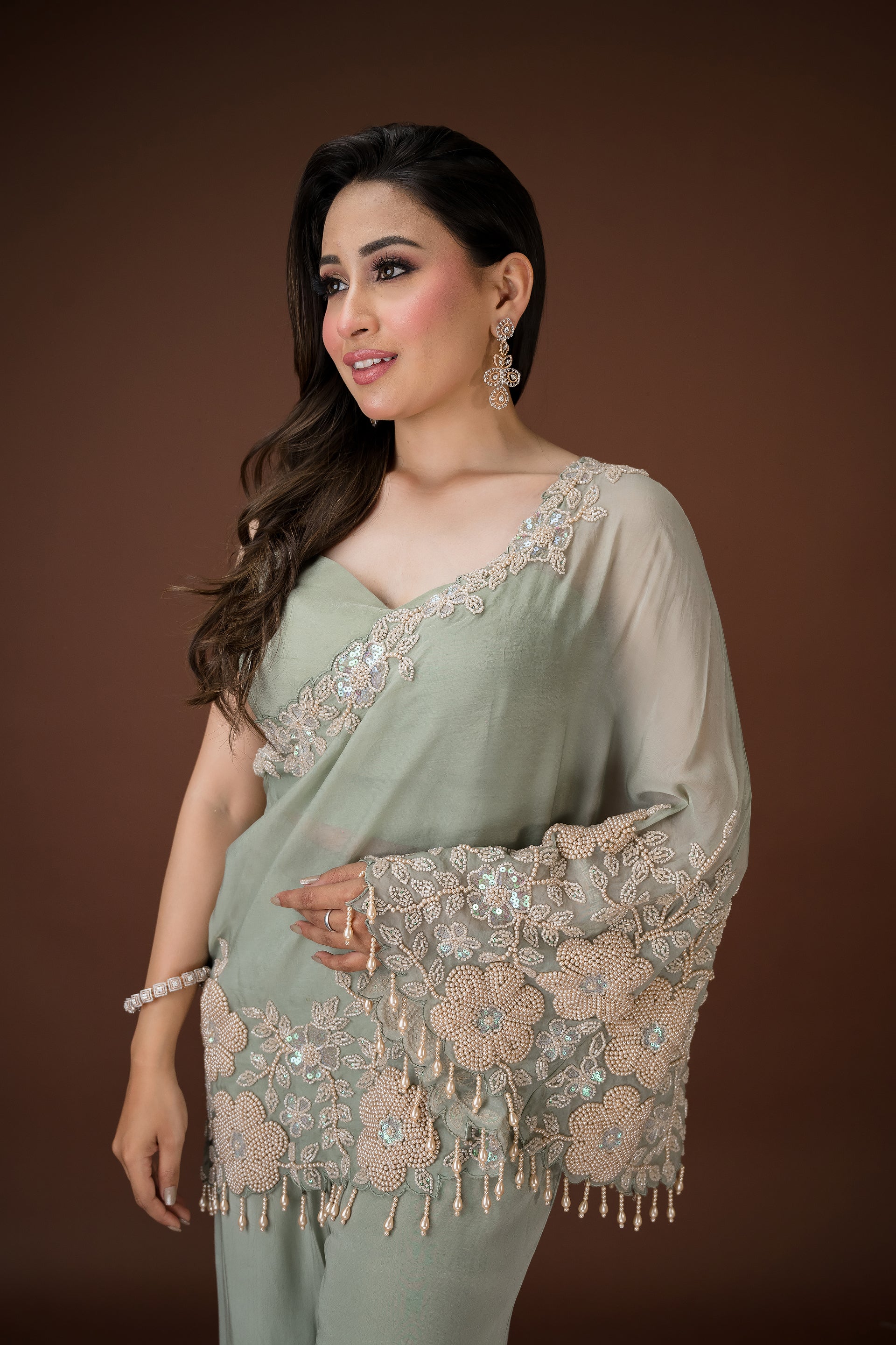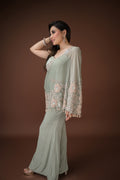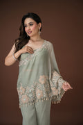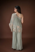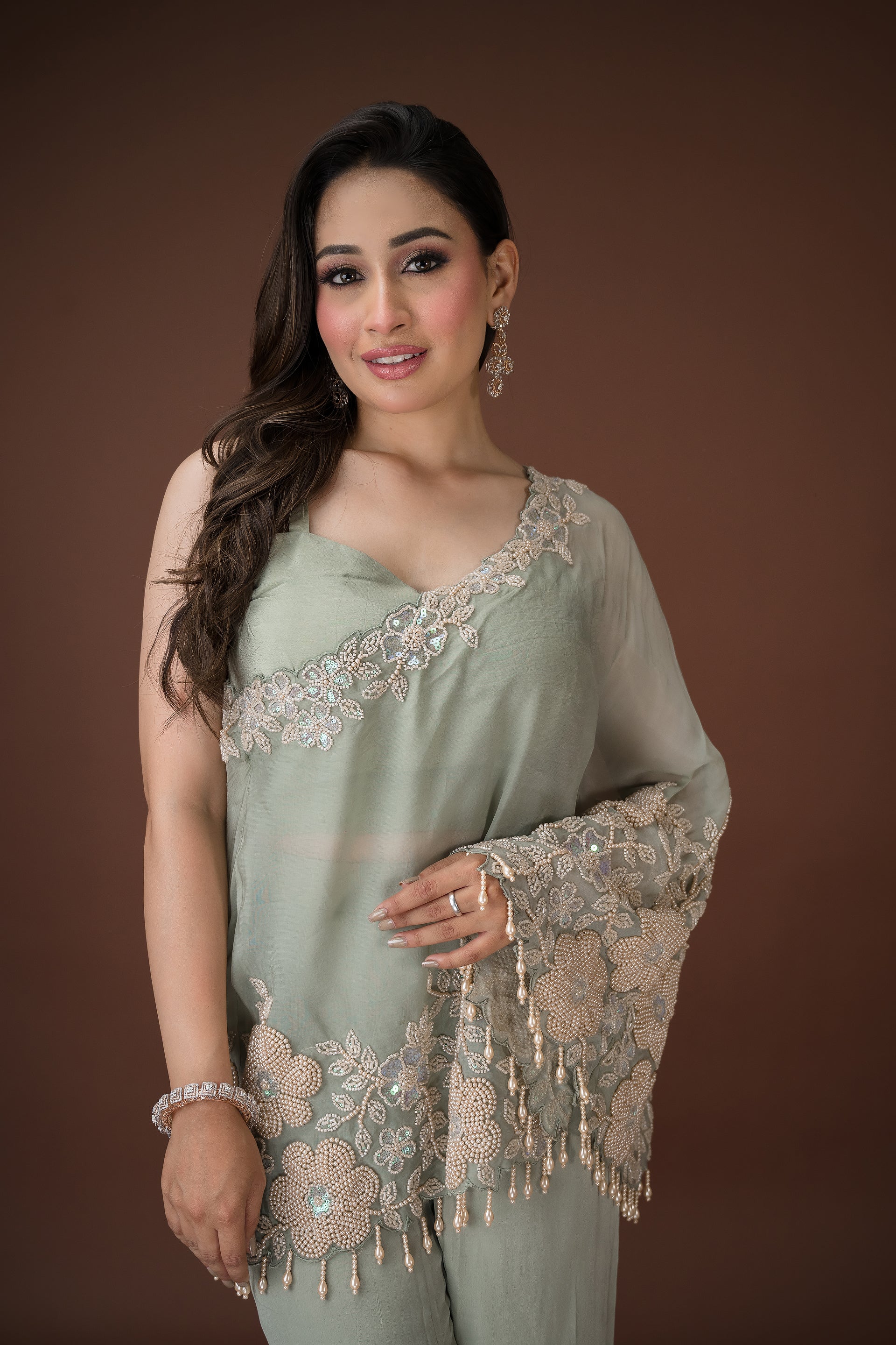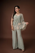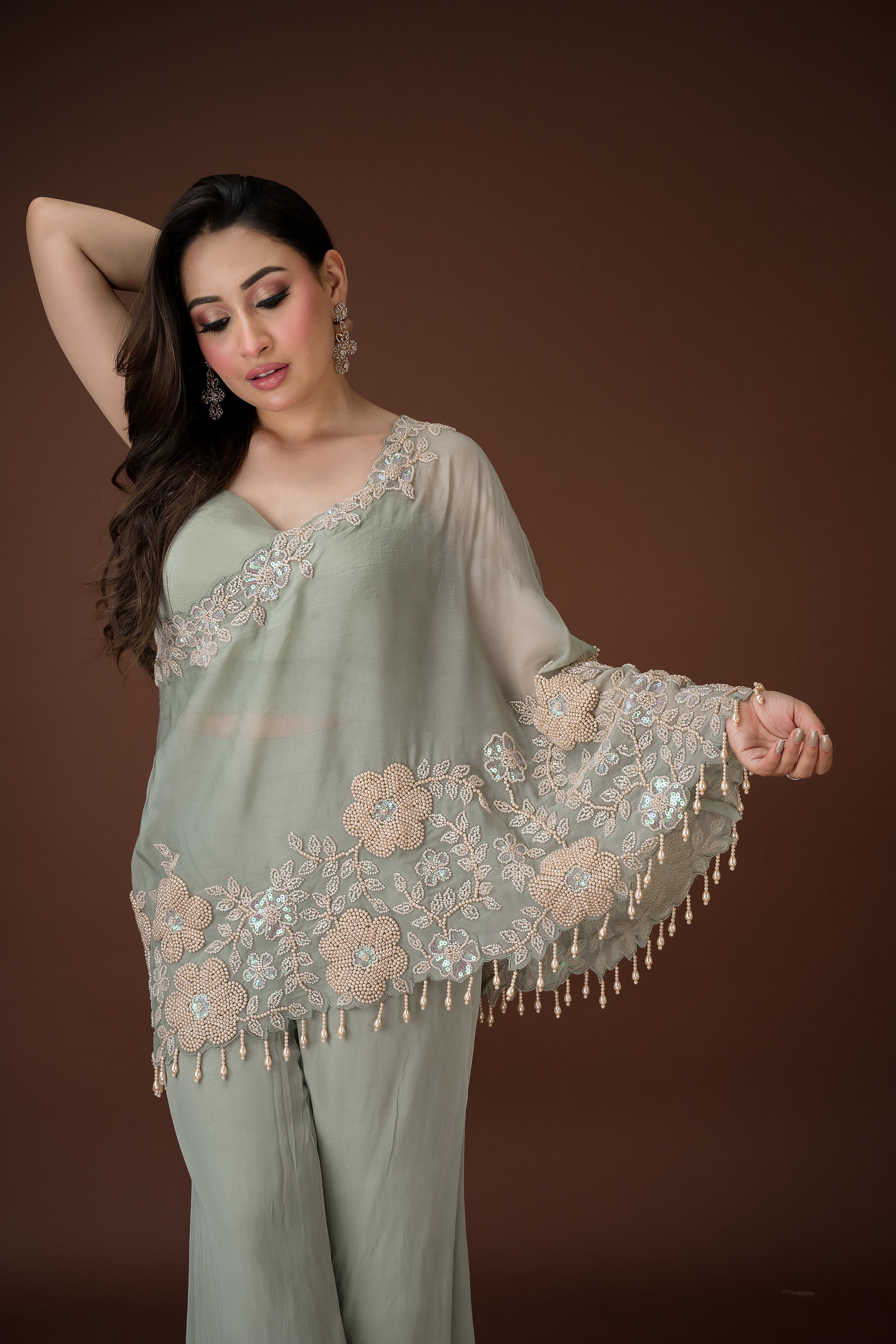 this outfit features a chic one-shoulder asymmetrical top adorned with intricate floral embroidery and delicate beadwork along the hem and sleeve. The soft pastel hue enhances the feminine silhouette, while the relaxed-fit palazzo pants provide comfort and graceful movement. Perfect for festive occasions, weddings, or evening soirees, this ensemble is designed for the modern woman who values effortless style and sophistication