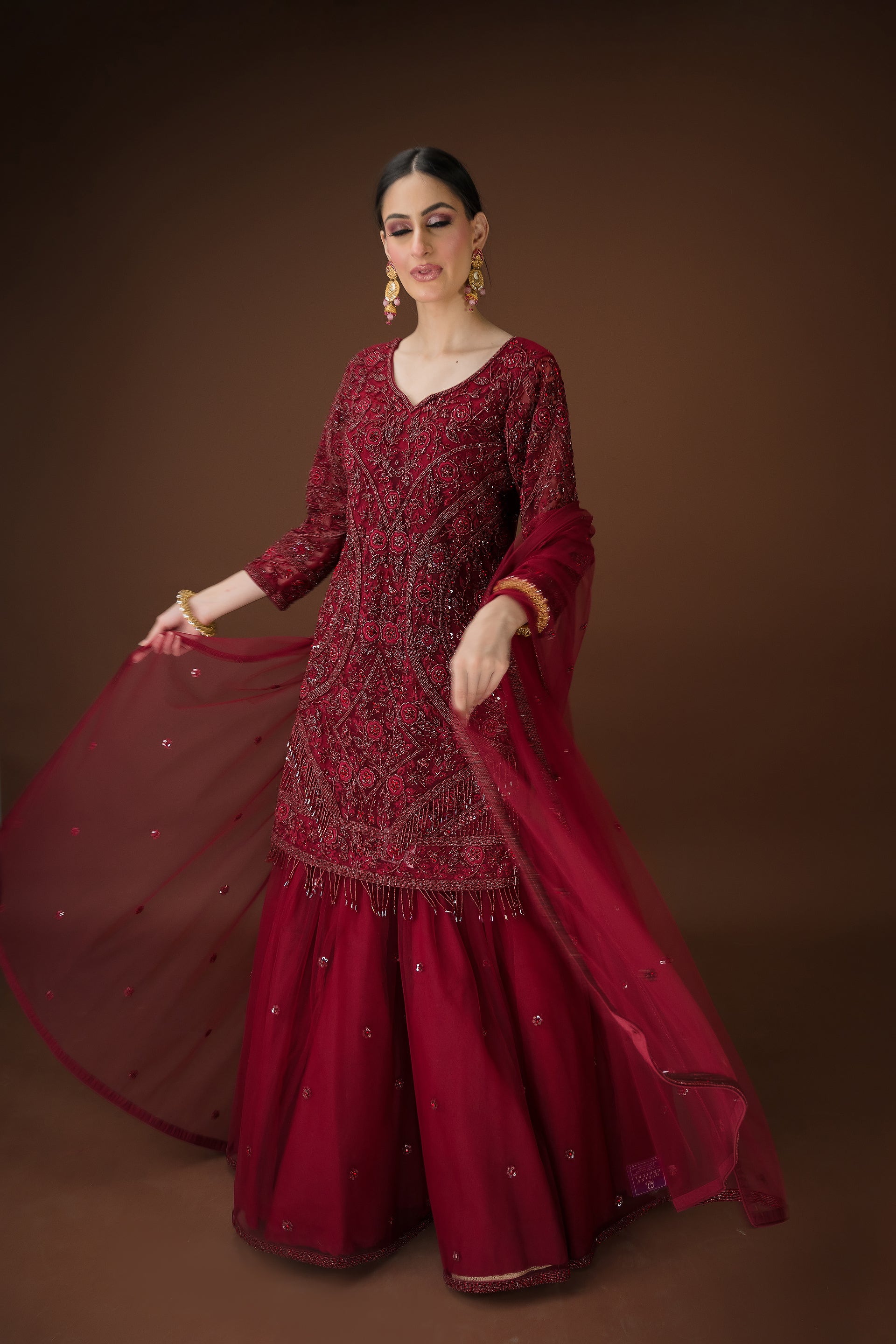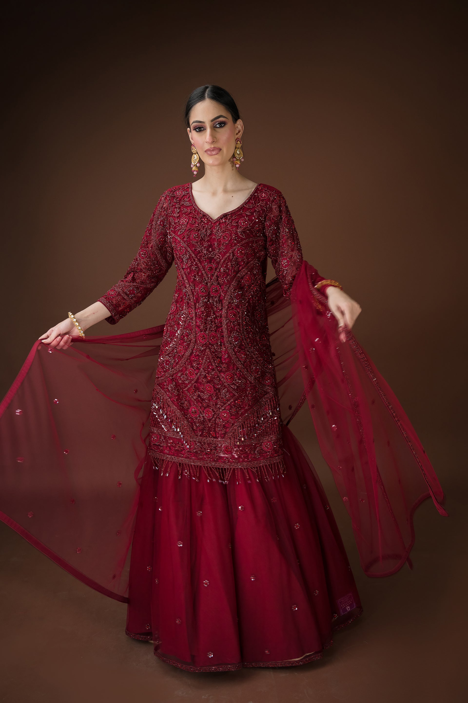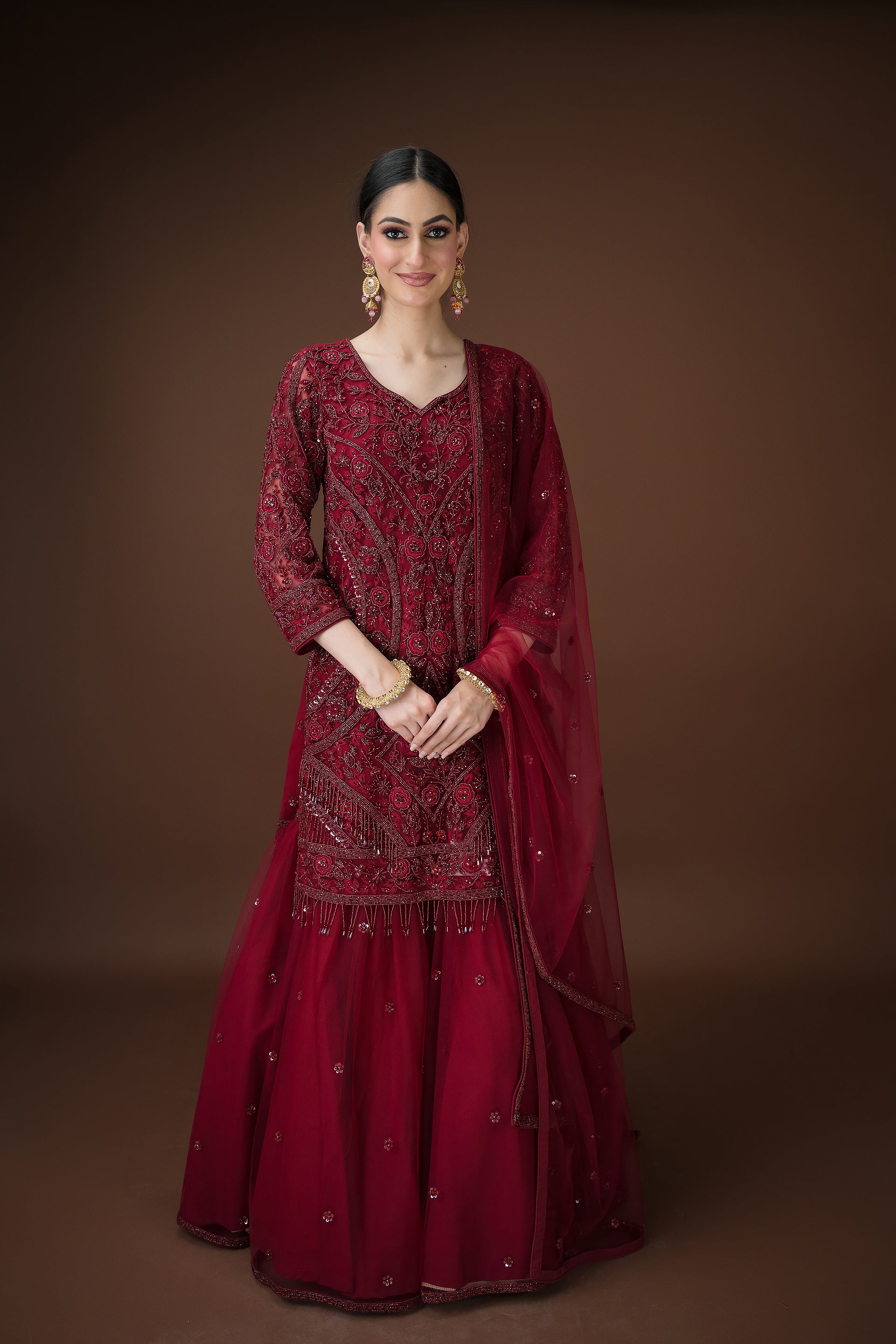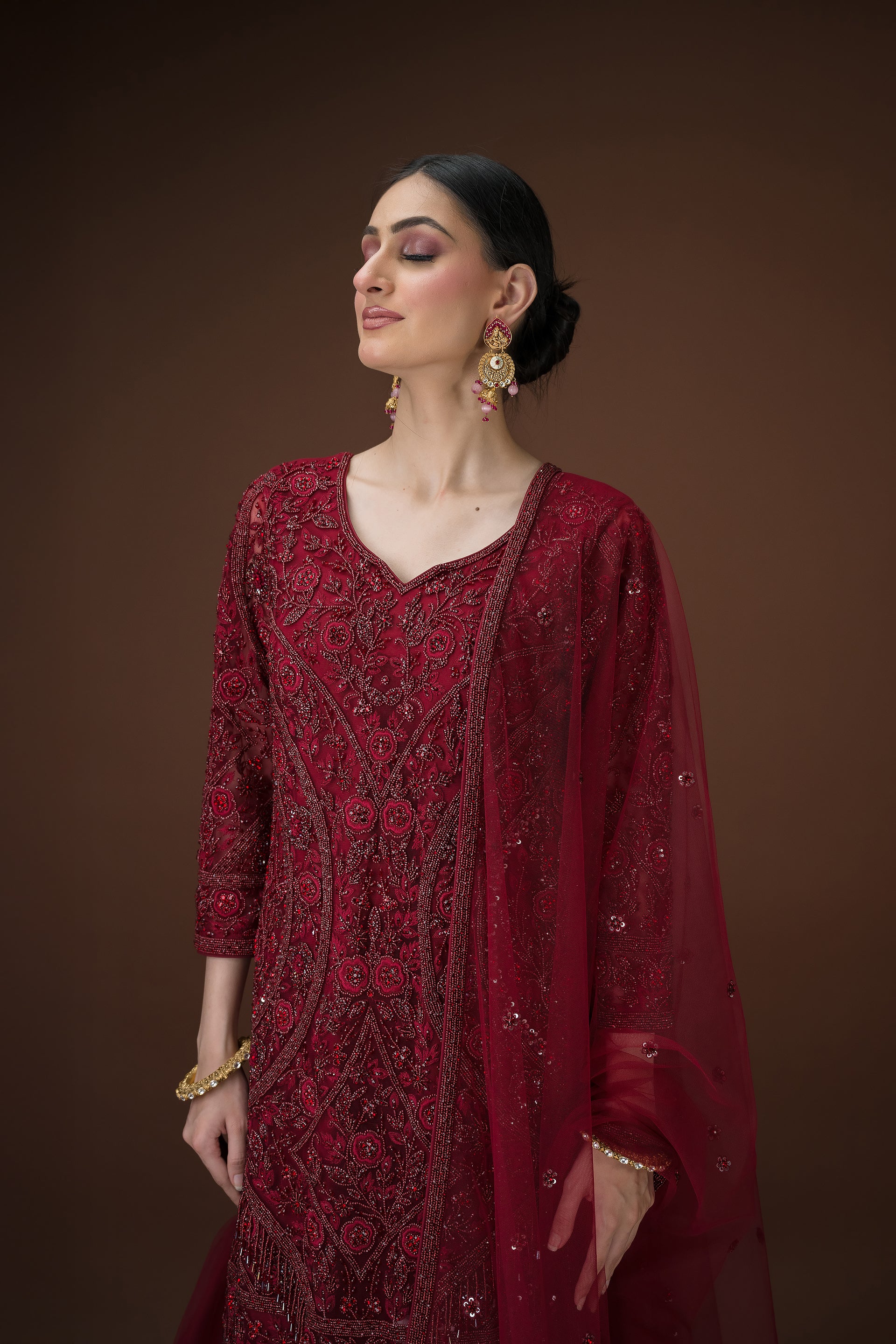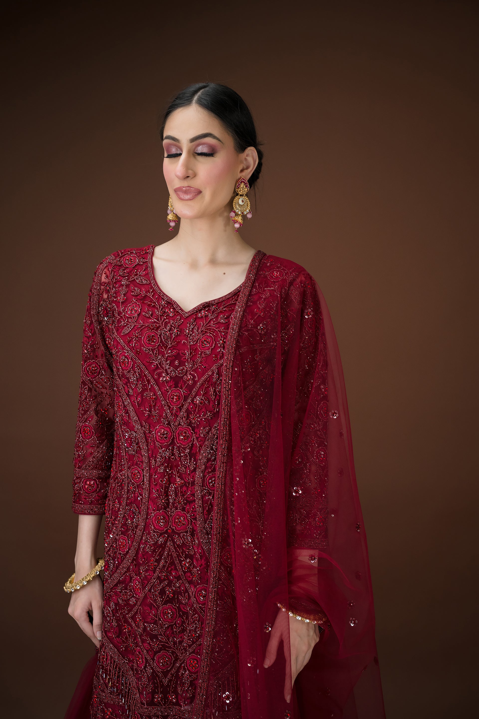 the outfit features a beautifully hand-embroidered straight-cut kurta adorned with intricate zari, sequin, and beadwork, lending it a regal and timeless charm. The three-quarter sleeves and scalloped hem enhance the silhouette, while the flared sharara pants provide graceful movement and comfort. Paired with a matching net dupatta, delicately embellished with scattered sequins and a finely detailed border, this ensemble strikes the perfect balance between tradition and sophistication. Ideal for weddings, festive occasions, or formal gatherings, this ensemble ensures you make a statement with effortless elegance