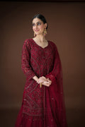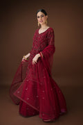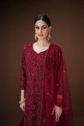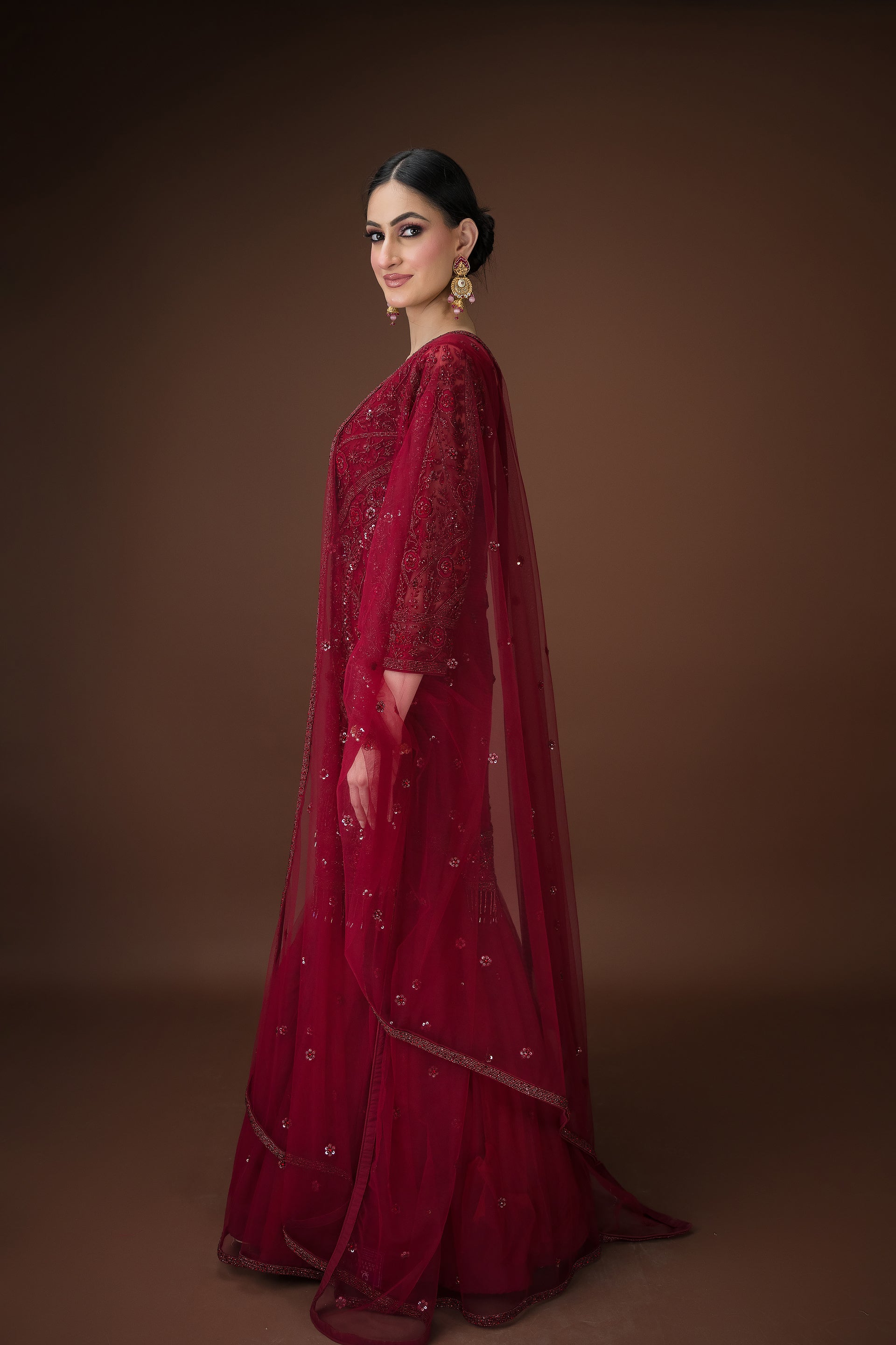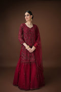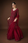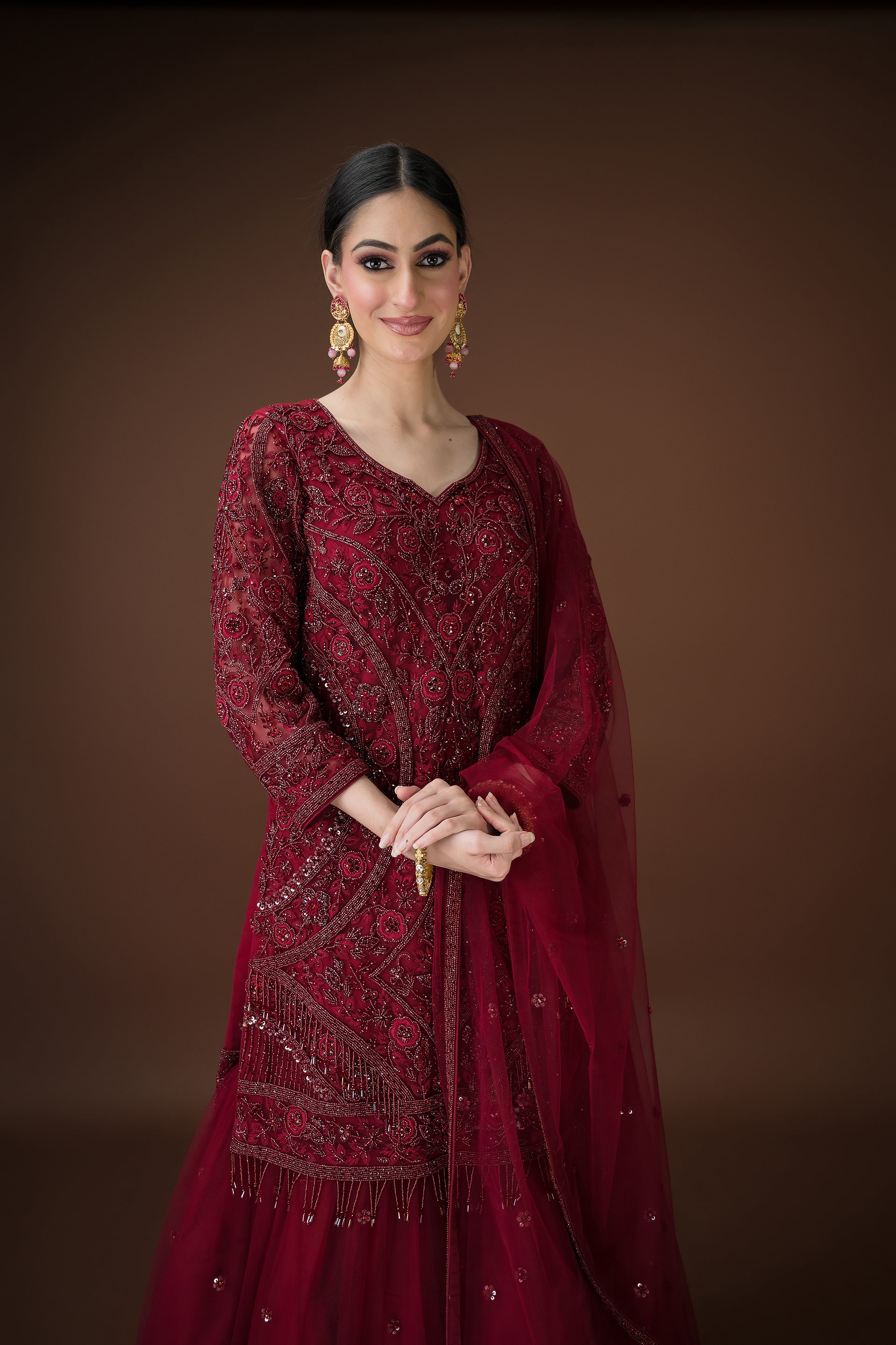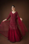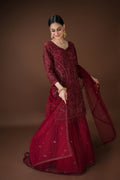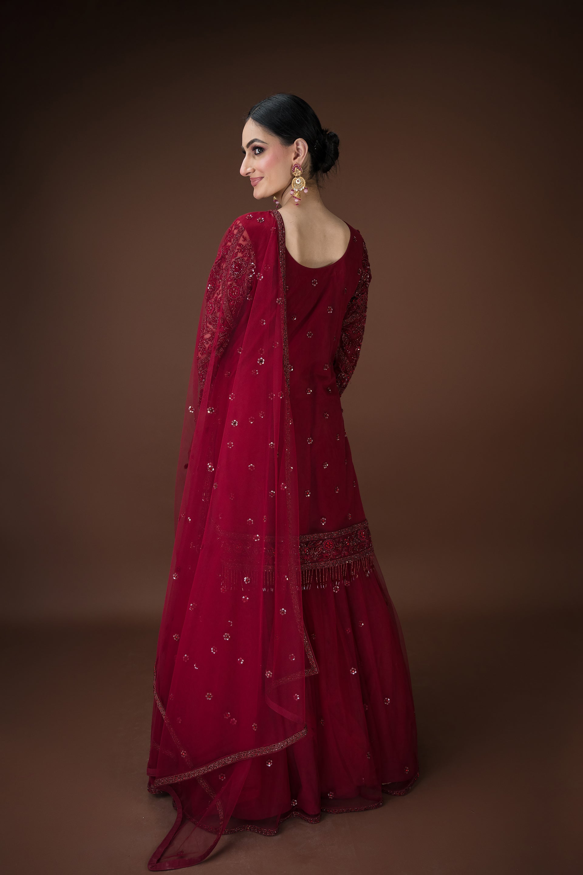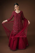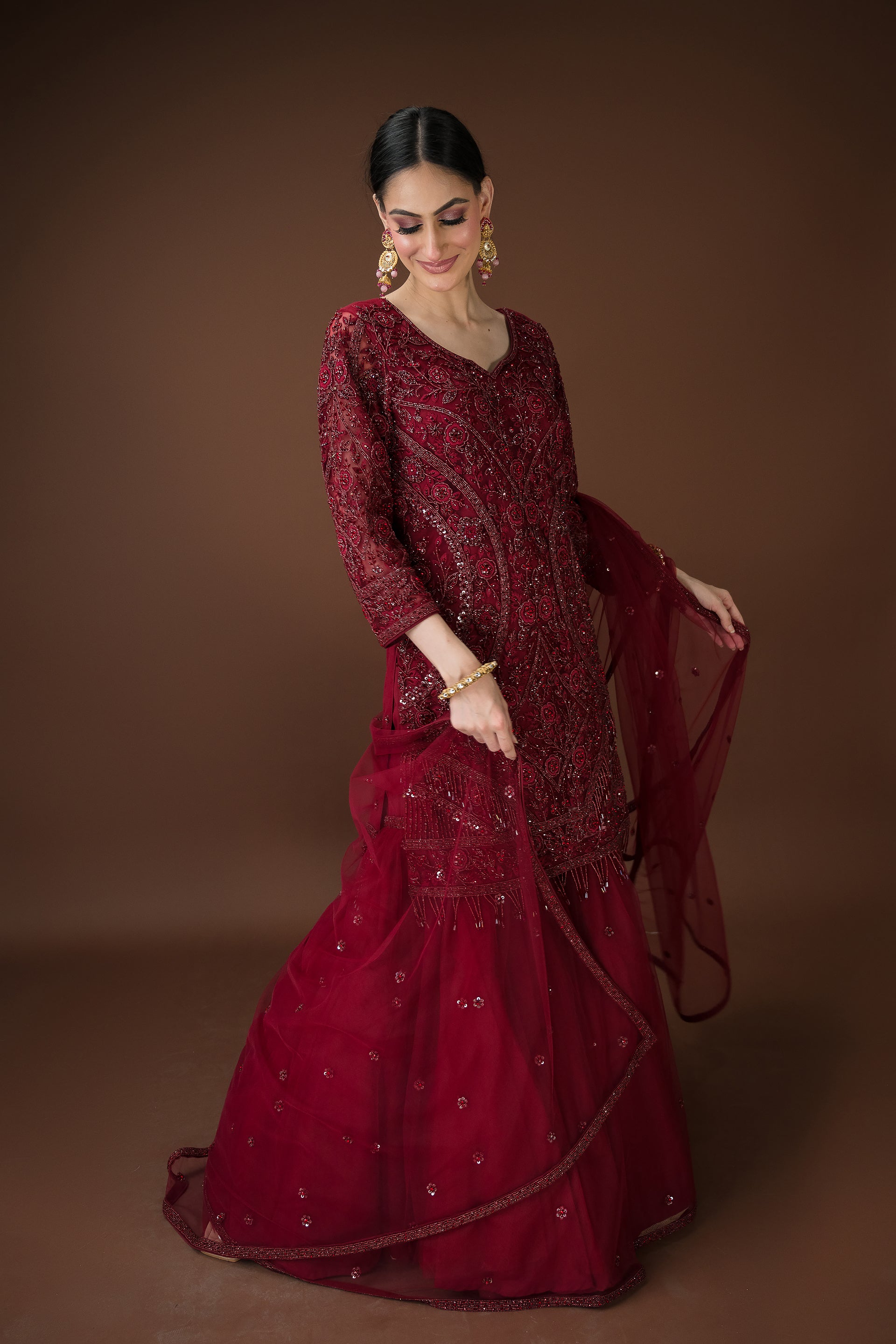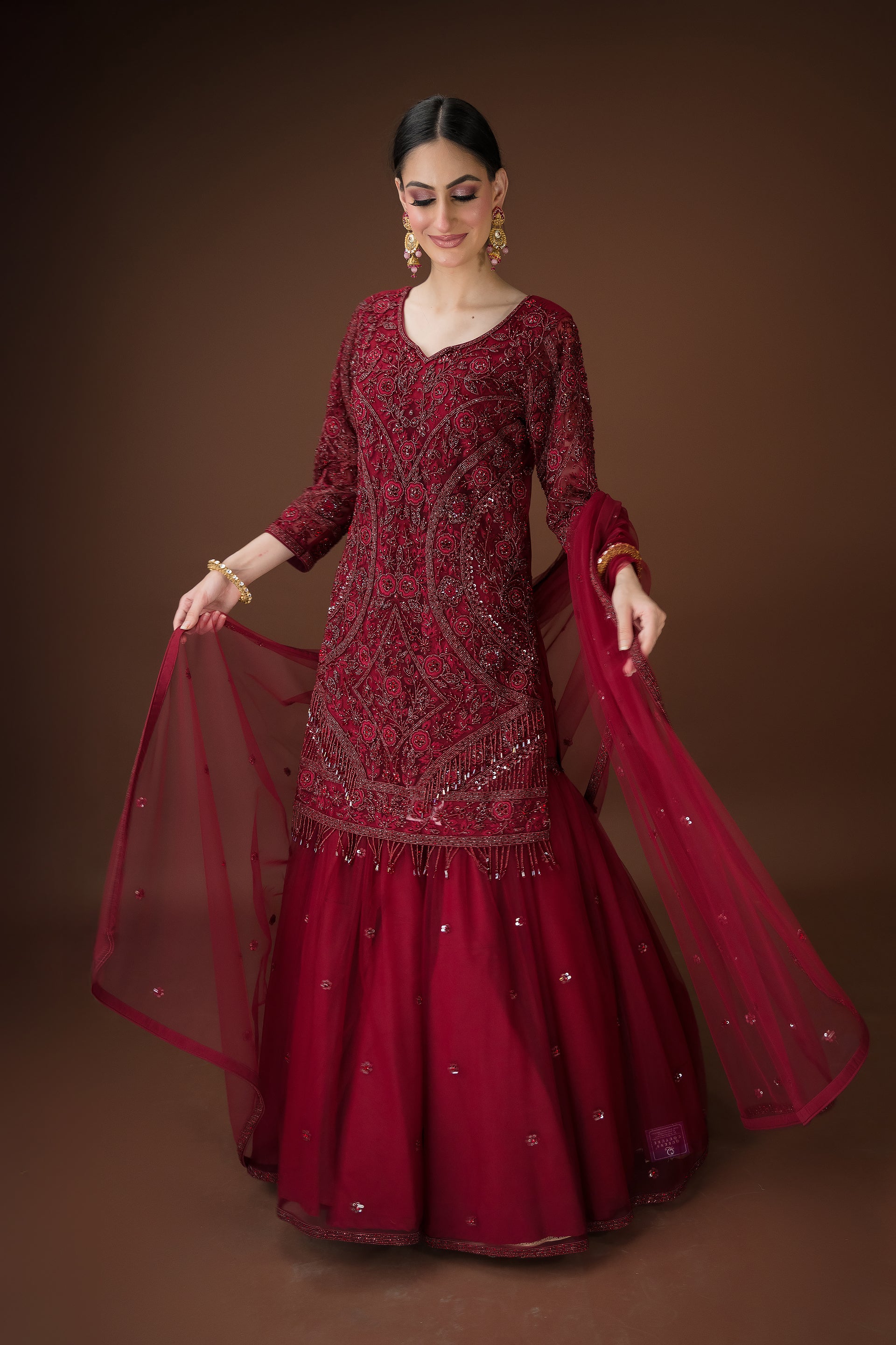 the outfit features a beautifully hand-embroidered straight-cut kurta adorned with intricate zari, sequin, and beadwork, lending it a regal and timeless charm. The three-quarter sleeves and scalloped hem enhance the silhouette, while the flared sharara pants provide graceful movement and comfort. Paired with a matching net dupatta, delicately embellished with scattered sequins and a finely detailed border, this ensemble strikes the perfect balance between tradition and sophistication. Ideal for weddings, festive occasions, or formal gatherings, this ensemble ensures you make a statement with effortless elegance