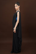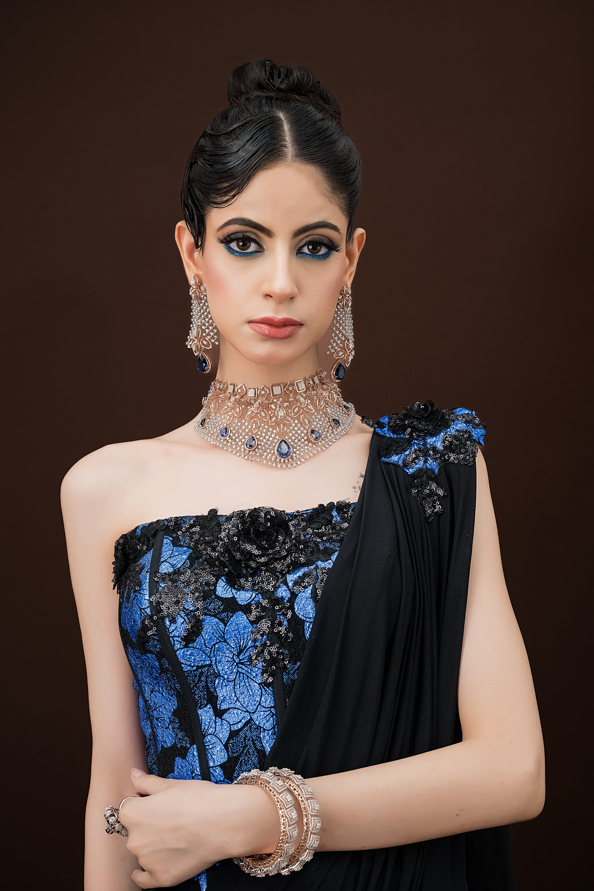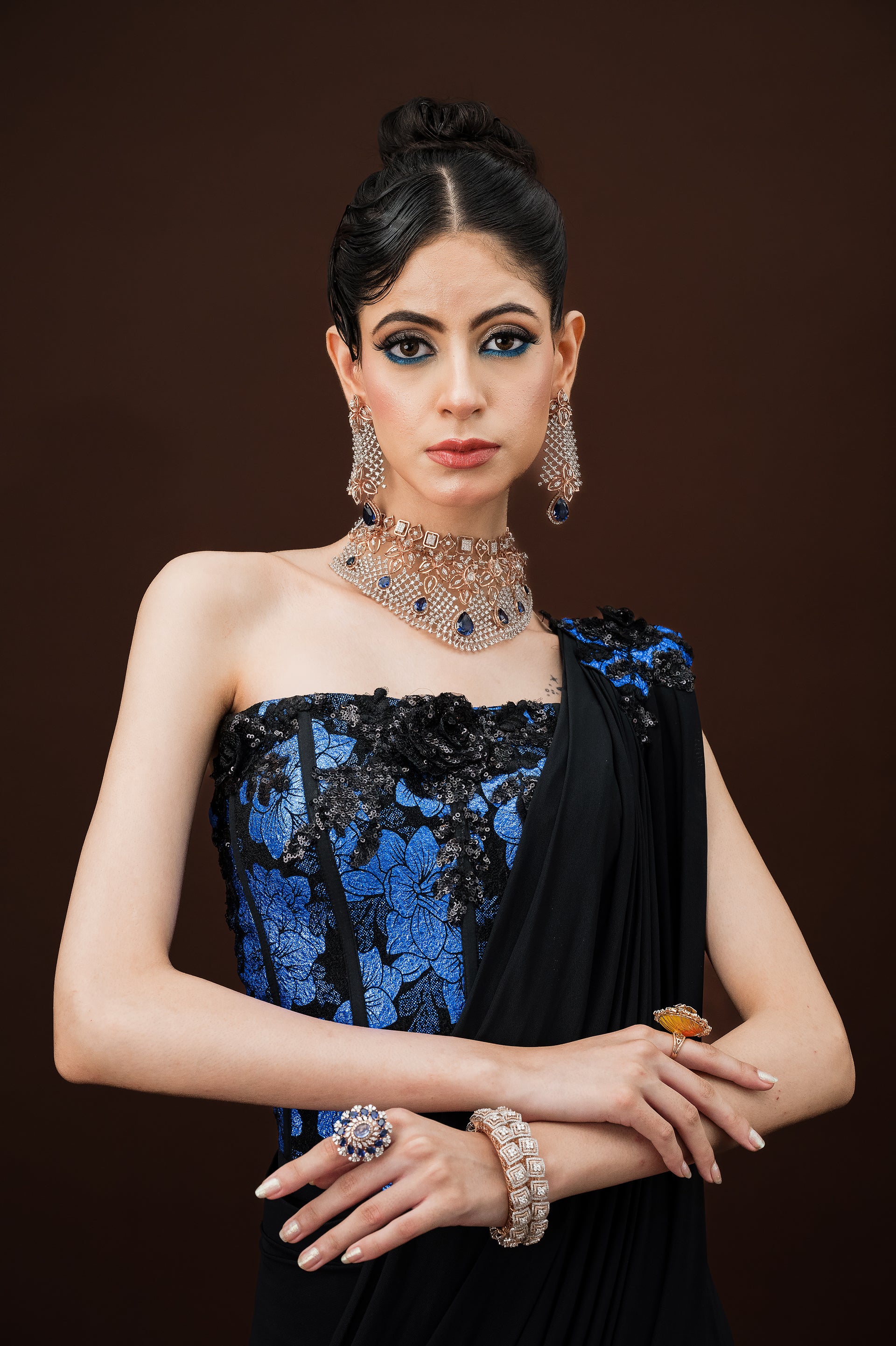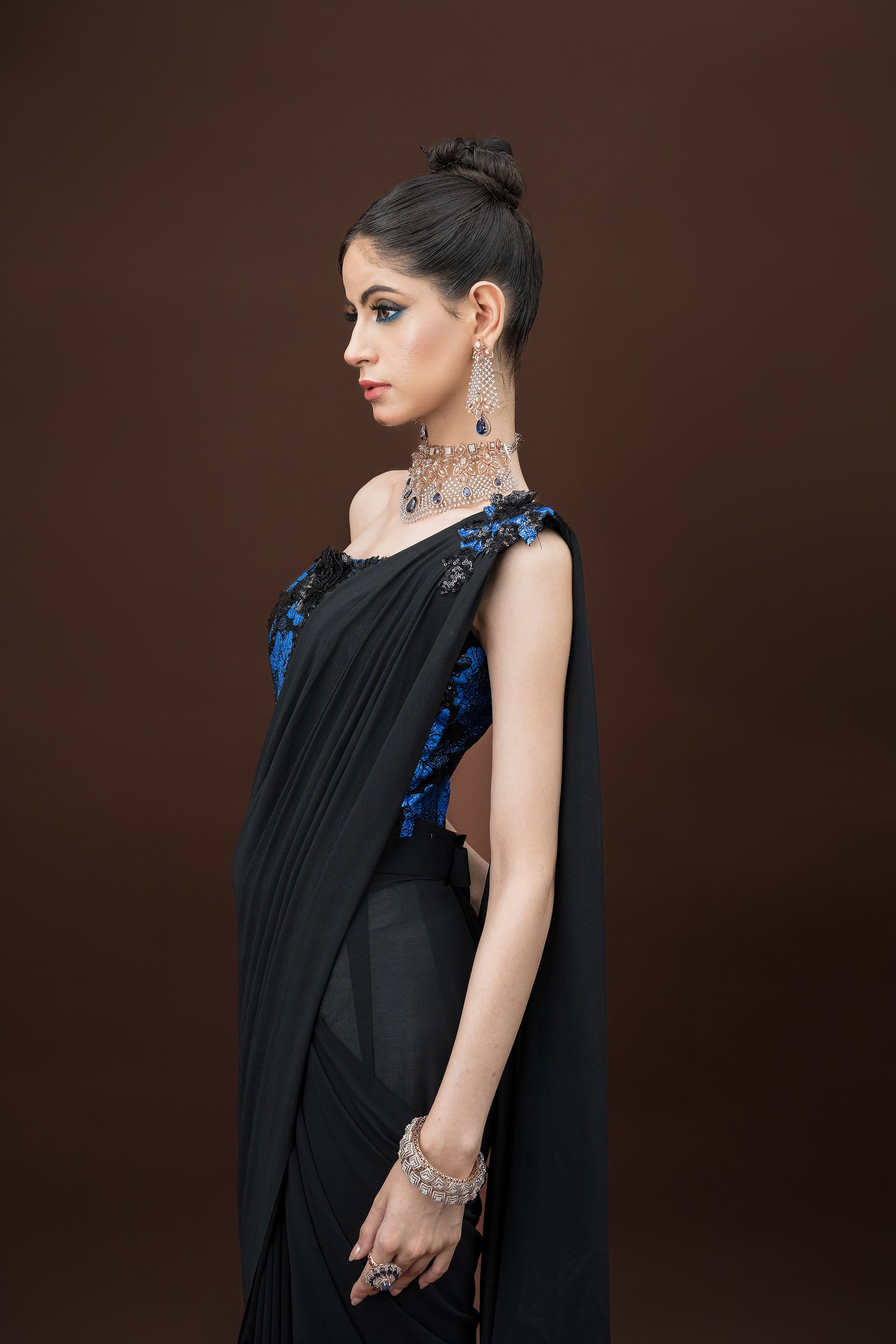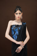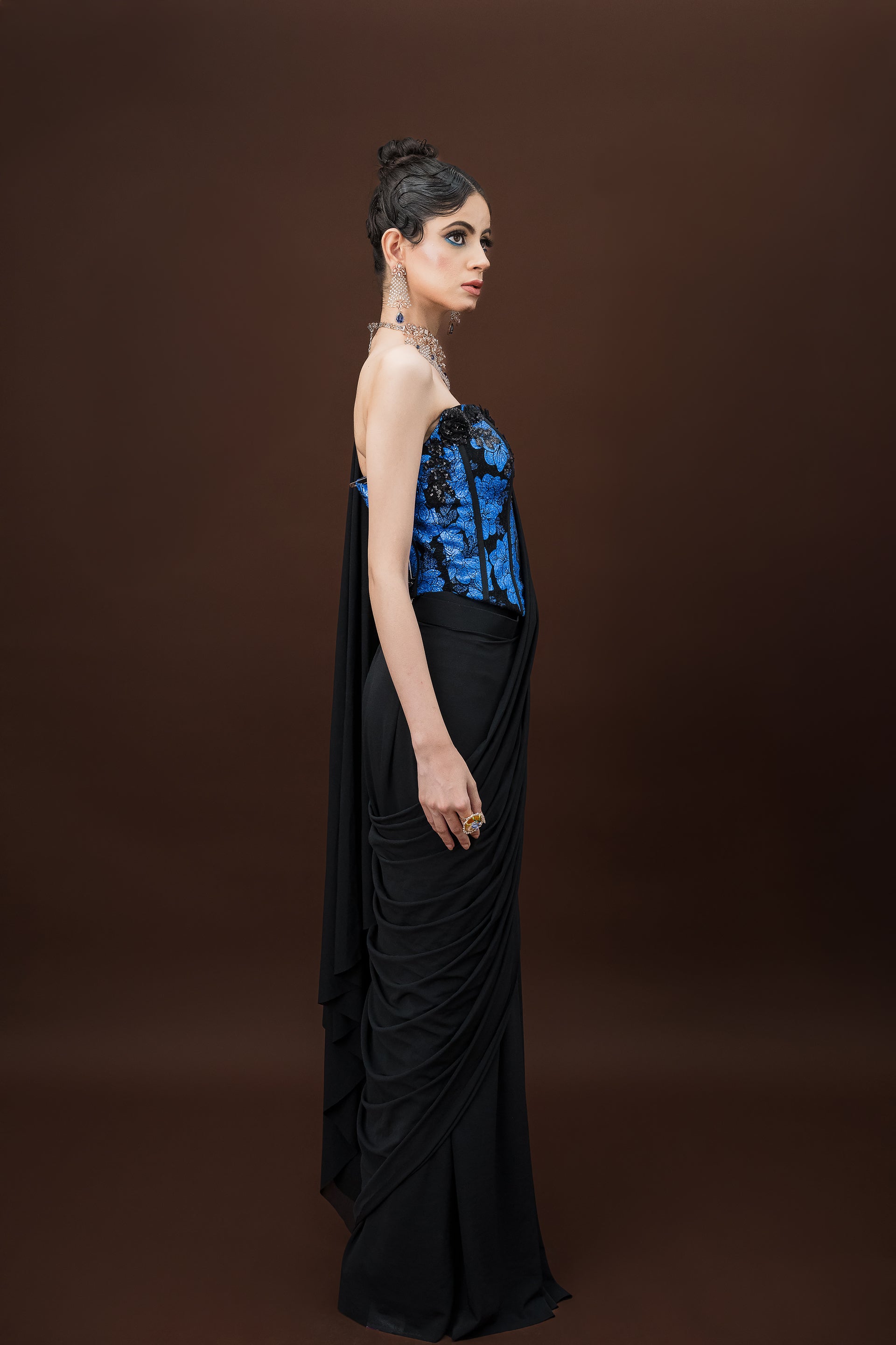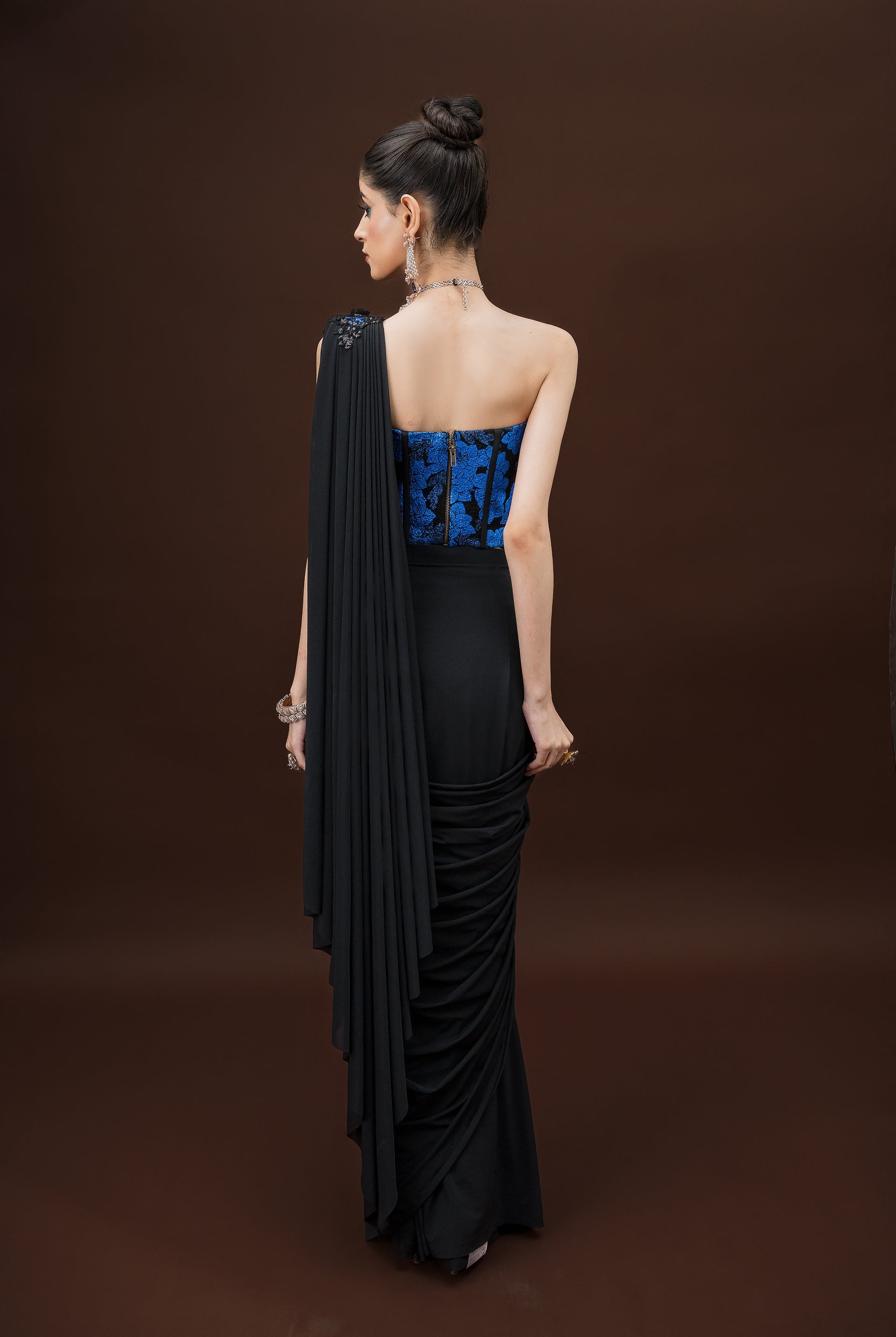 This elegant black lycra sari is paired with a stunning sequin-embellished strapless corset top, adding a touch of glamour to the classic silhouette.
