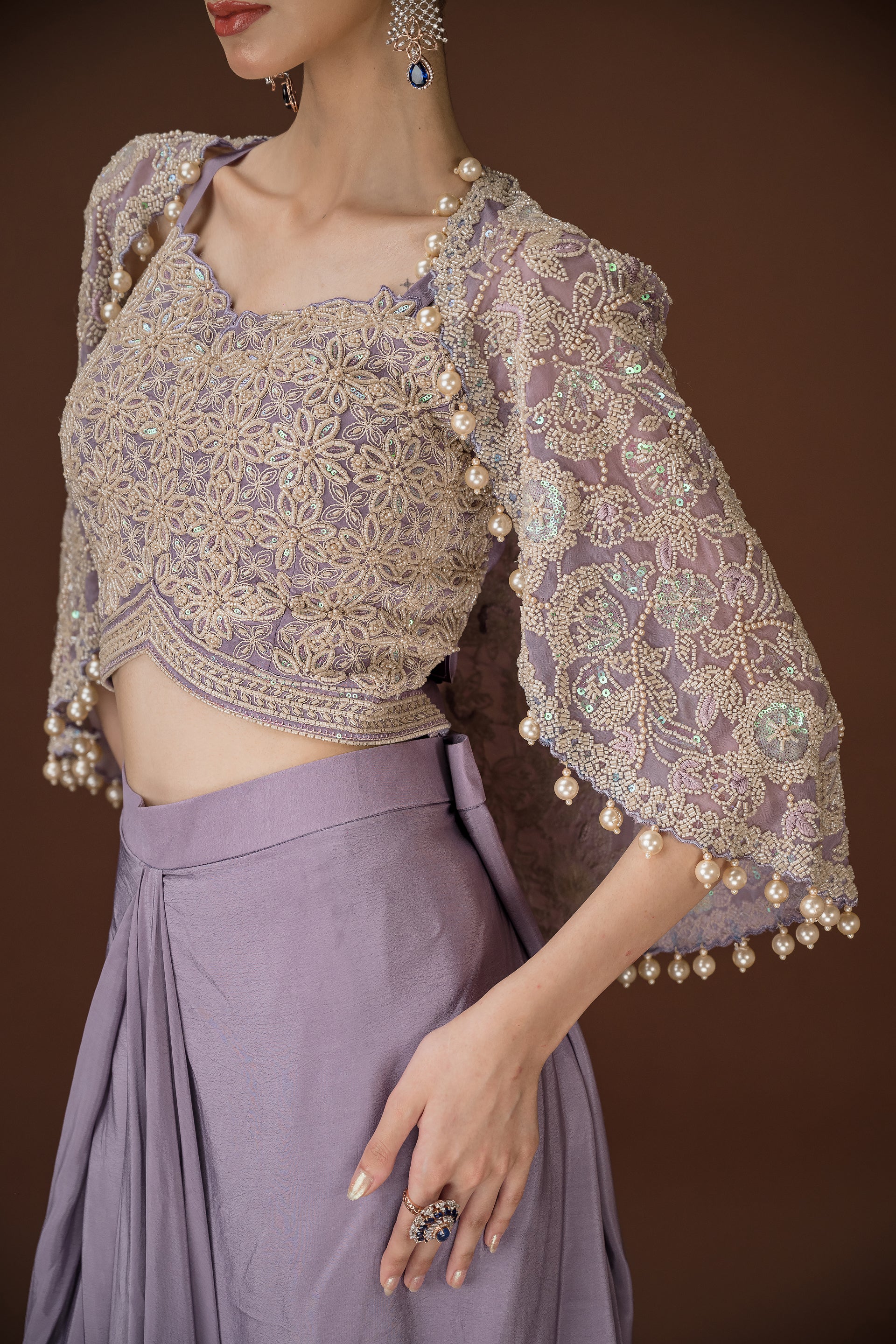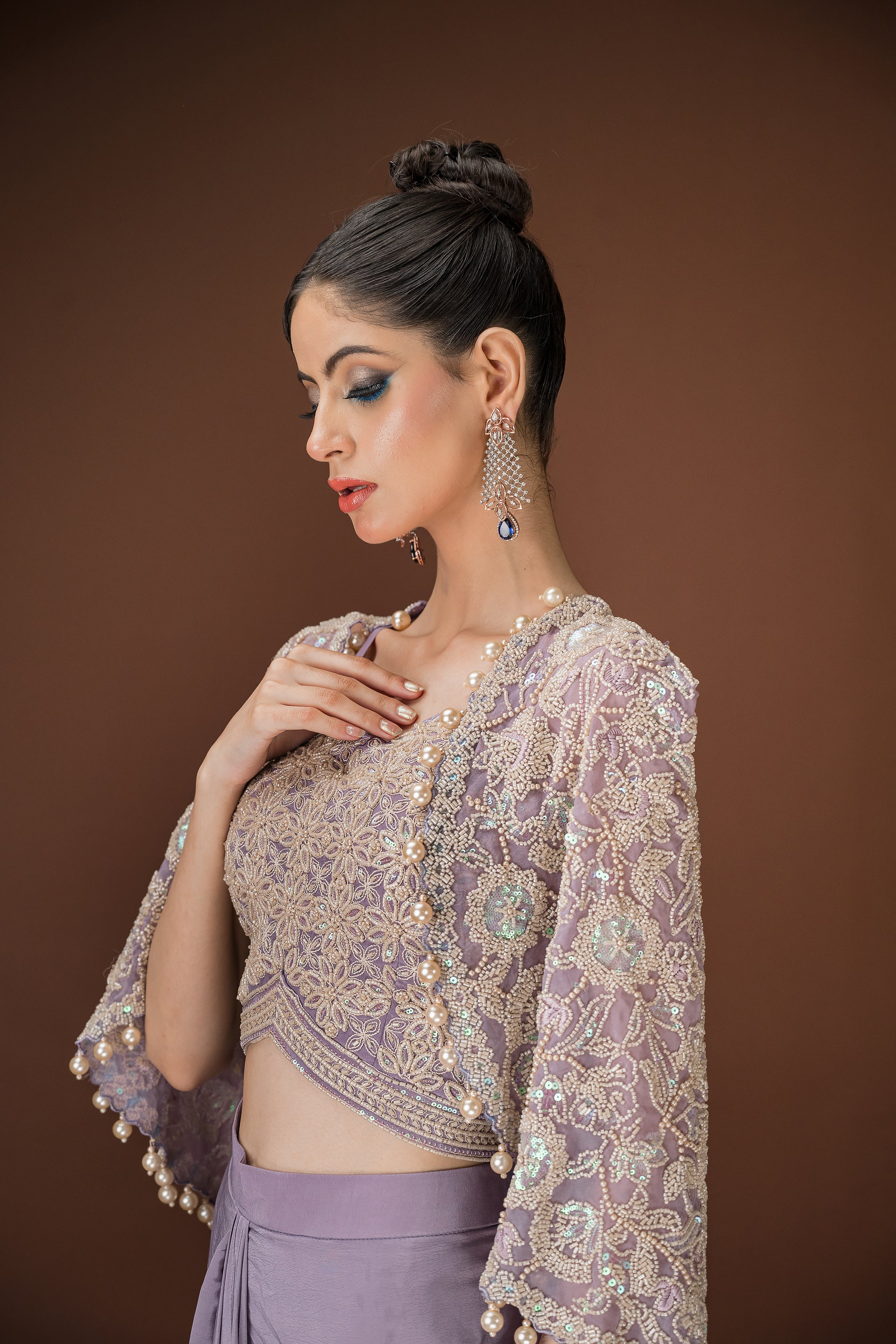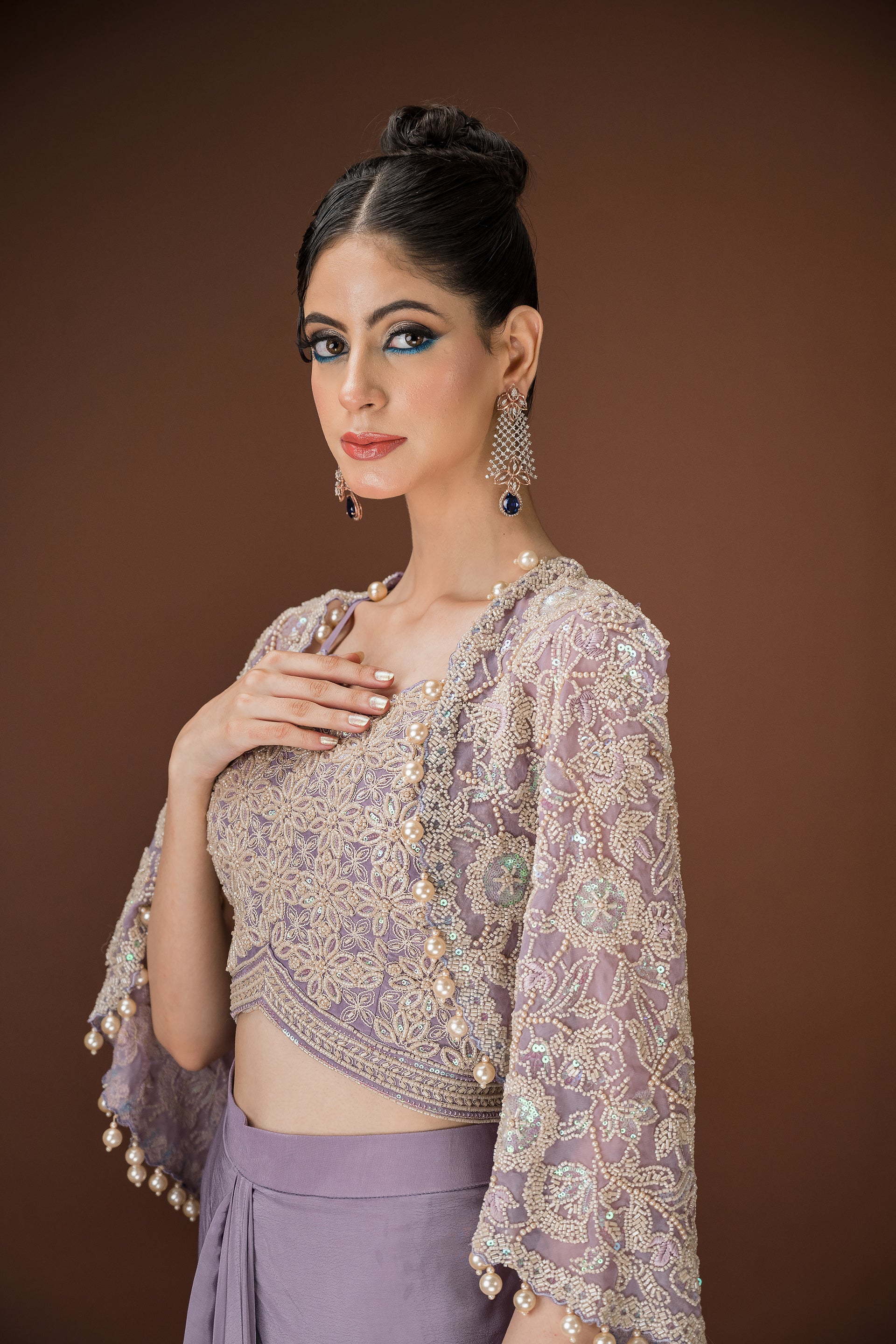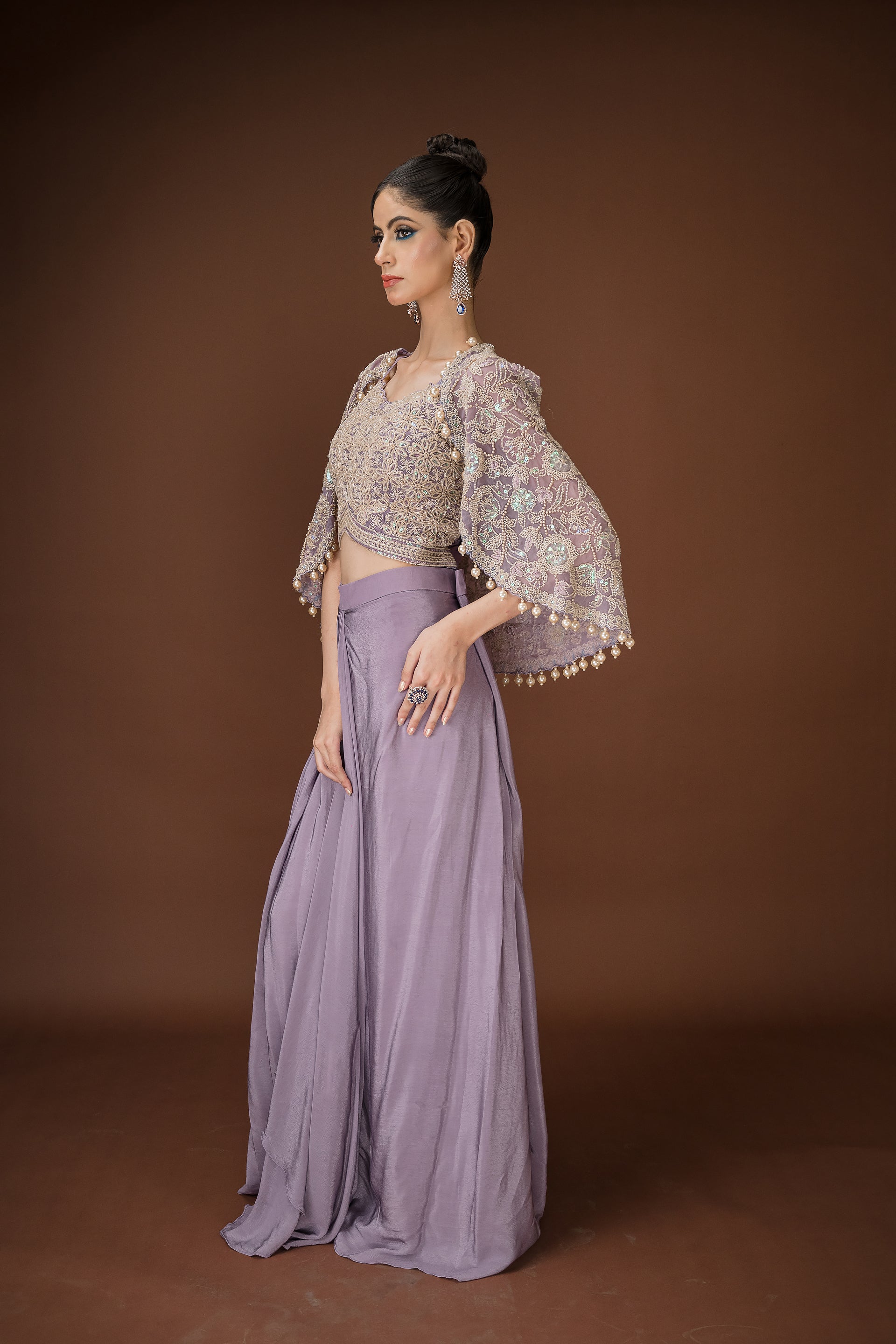 The ensemble features a flowy mauve georgette draped skirt that creates a graceful silhouette with every movement. It is paired with a heavily embellished crop blouse, intricately adorned with beads, sequins, and delicate embroidery. The blouse is designed with dramatic elbow-length bell sleeves, finished with charming pearl tassels