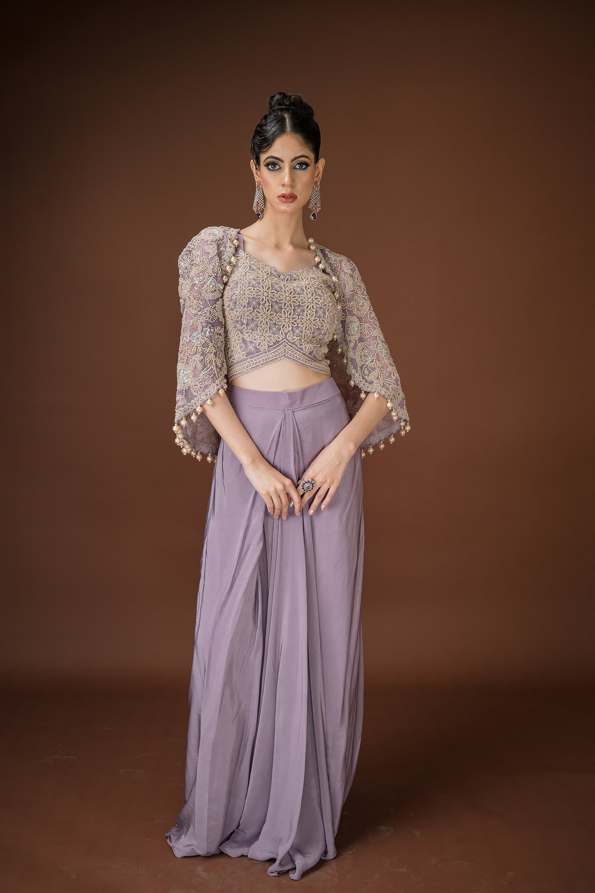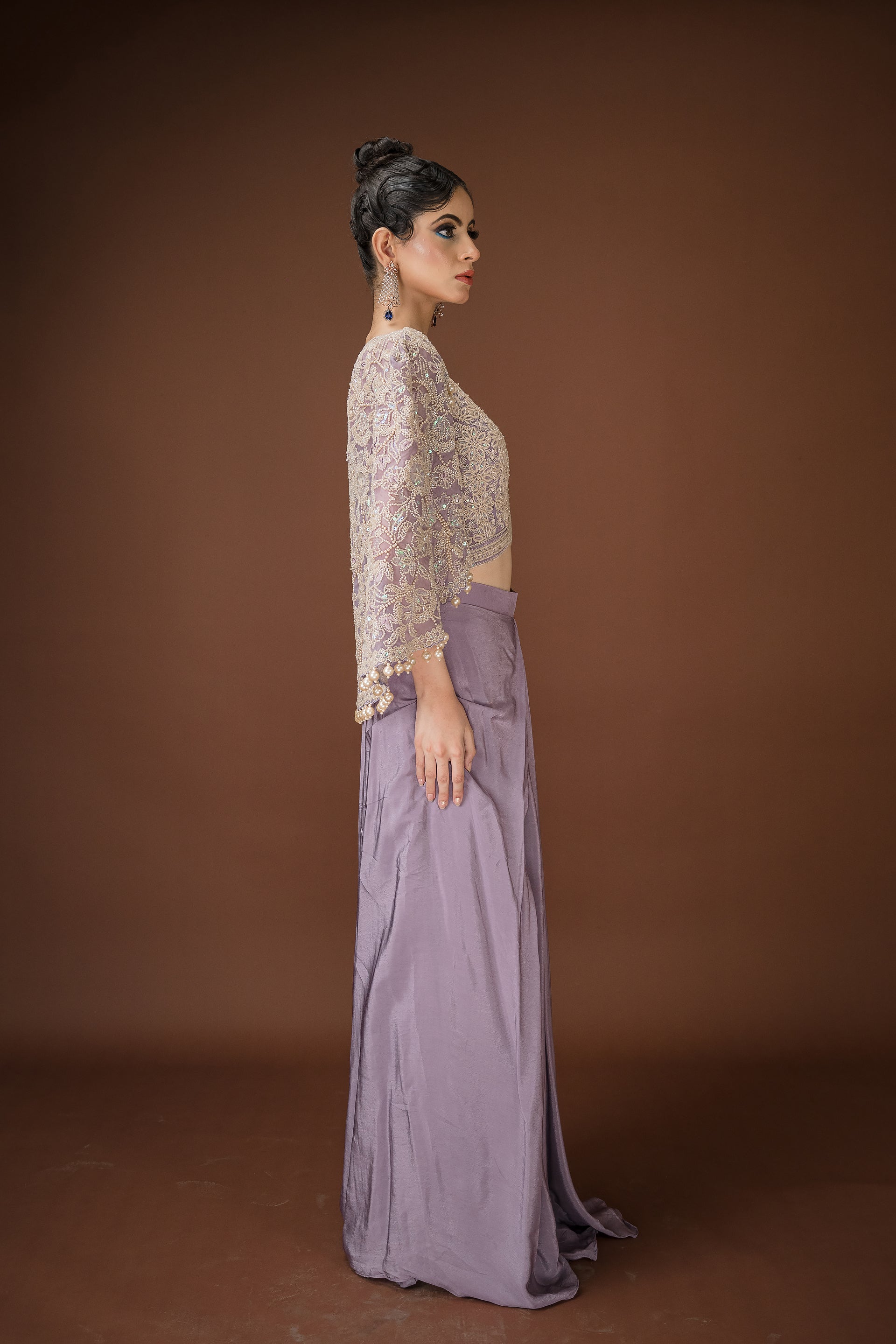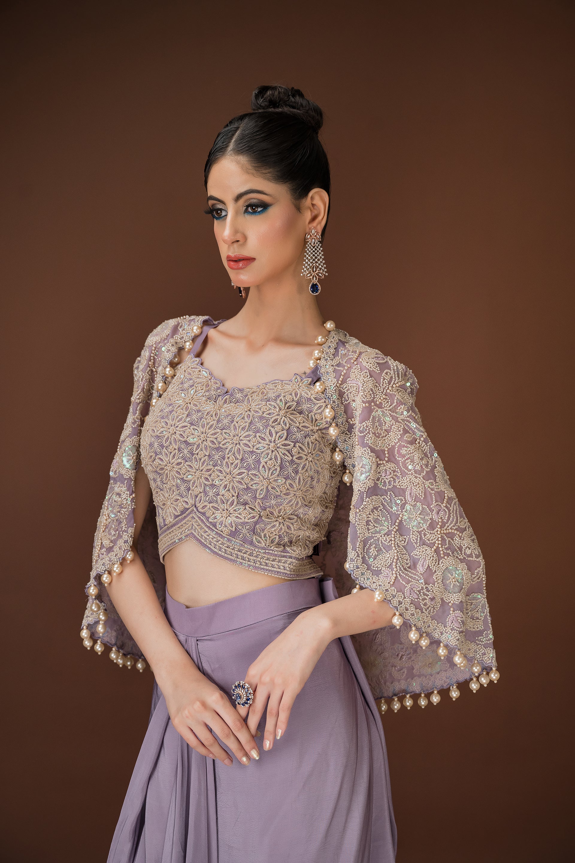The ensemble features a flowy mauve georgette draped skirt that creates a graceful silhouette with every movement. It is paired with a heavily embellished crop blouse, intricately adorned with beads, sequins, and delicate embroidery. The blouse is designed with dramatic elbow-length bell sleeves, finished with charming pearl tassels