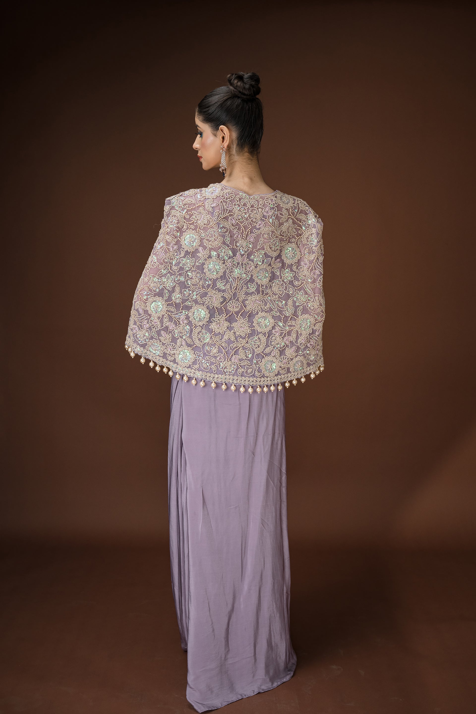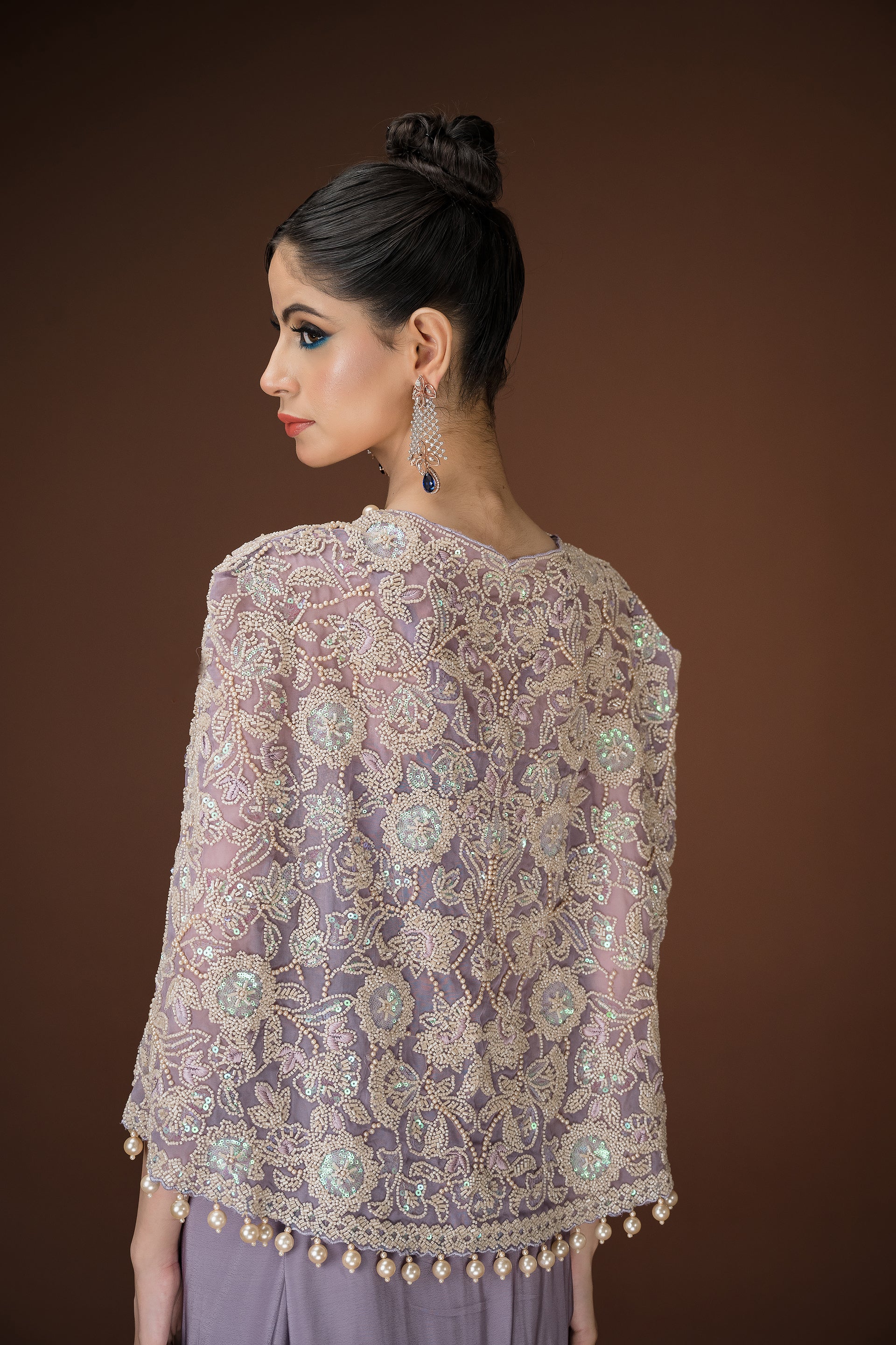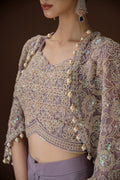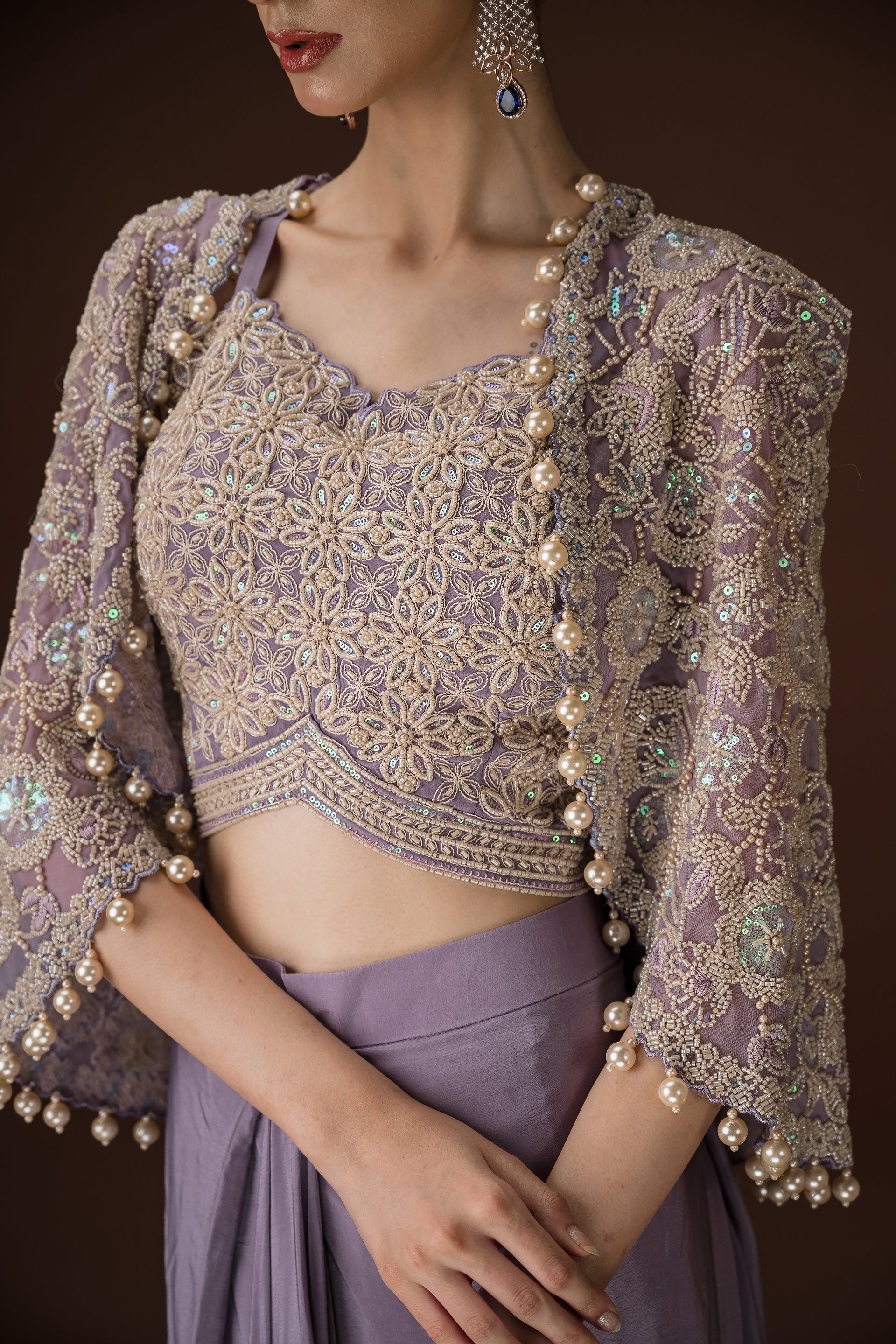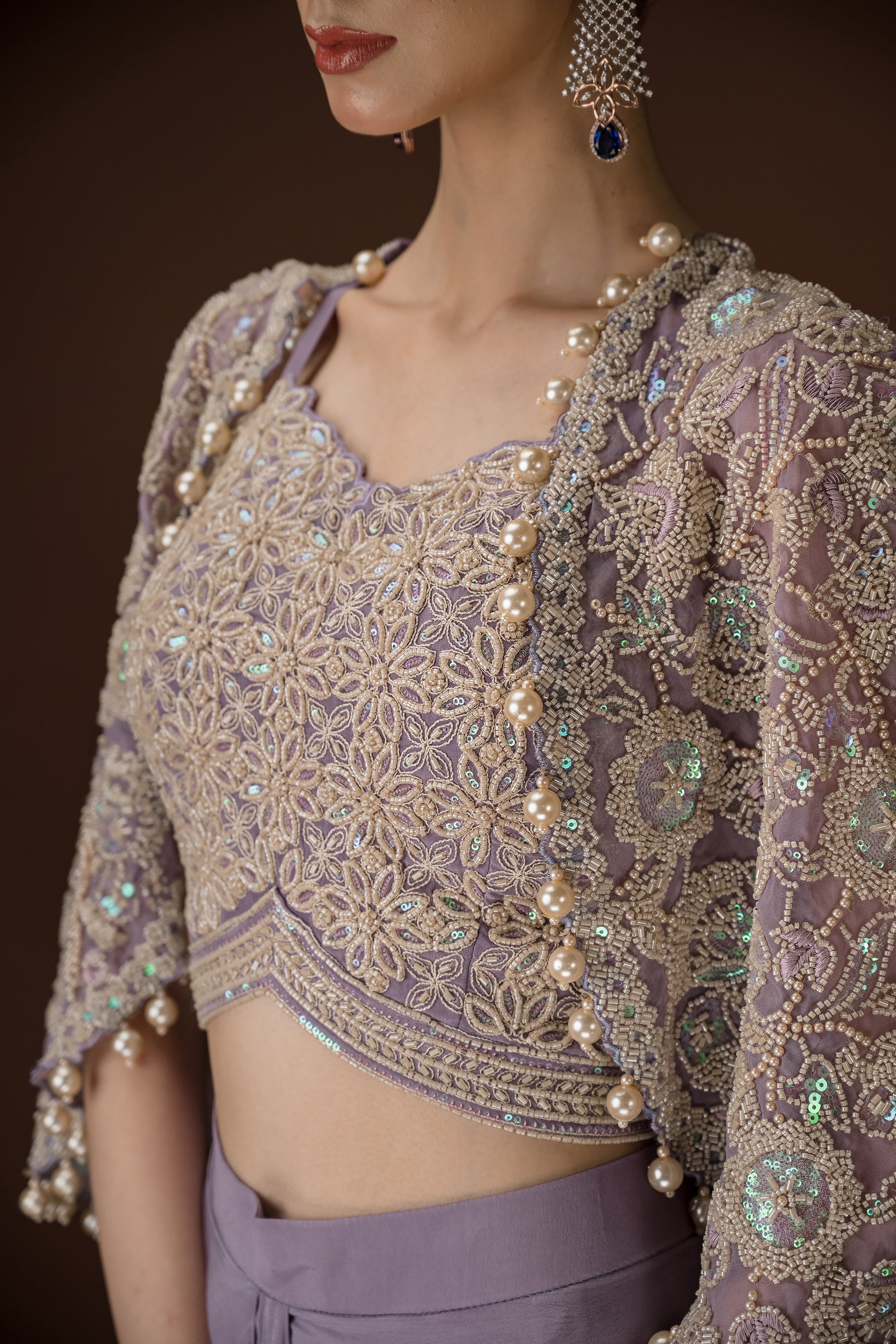 The ensemble features a flowy mauve georgette draped skirt that creates a graceful silhouette with every movement. It is paired with a heavily embellished crop blouse, intricately adorned with beads, sequins, and delicate embroidery. The blouse is designed with dramatic elbow-length bell sleeves, finished with charming pearl tassels