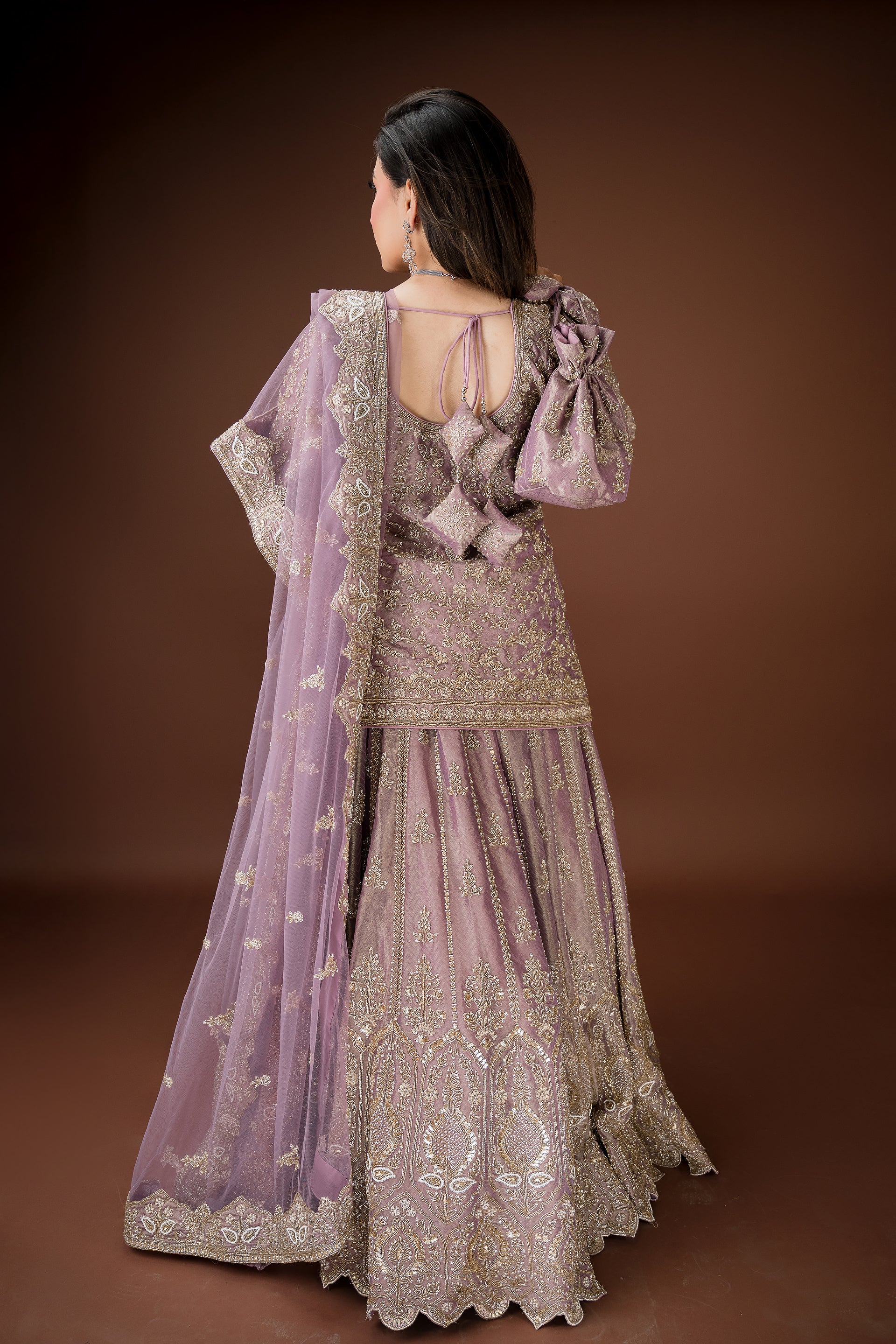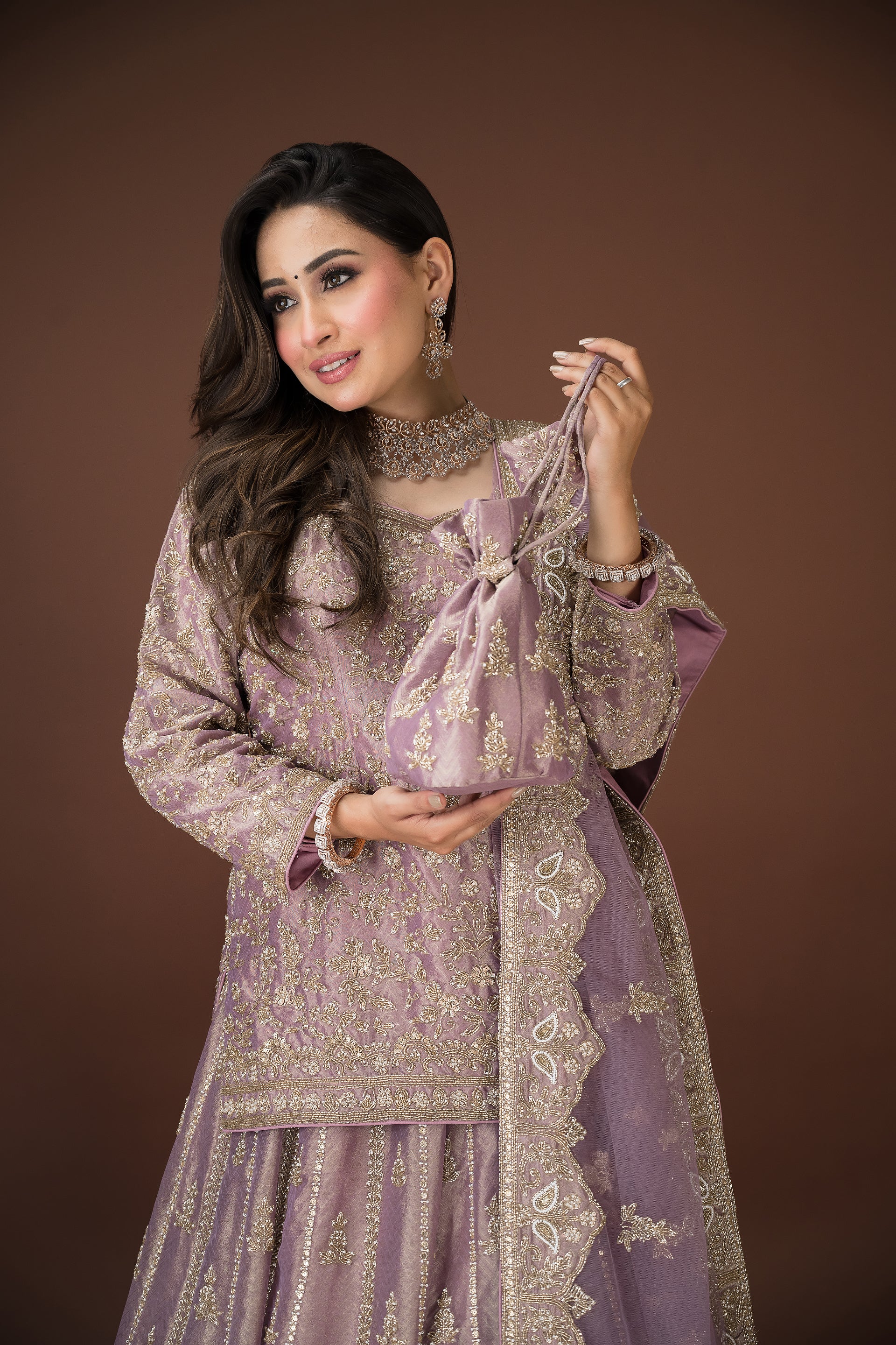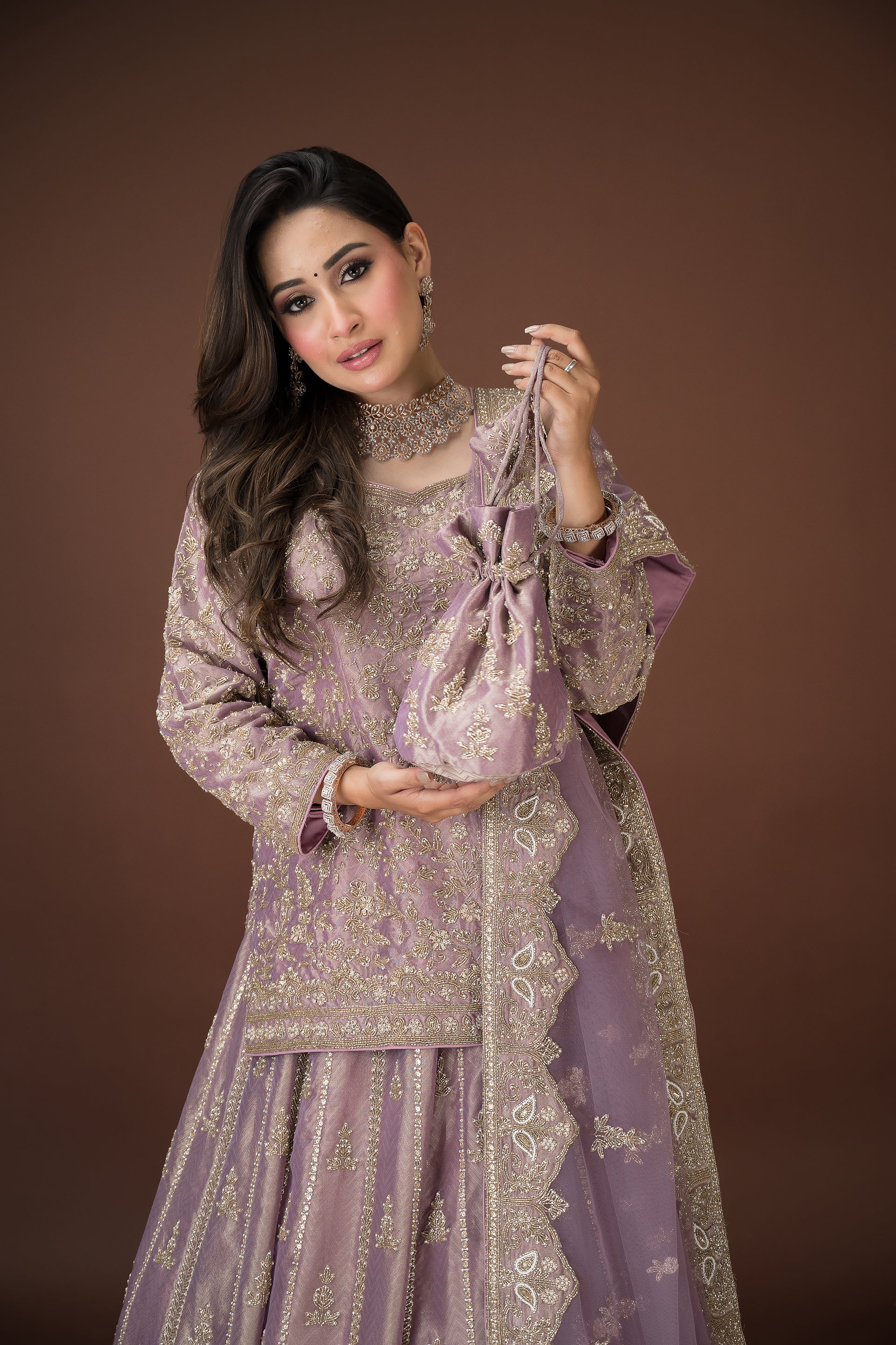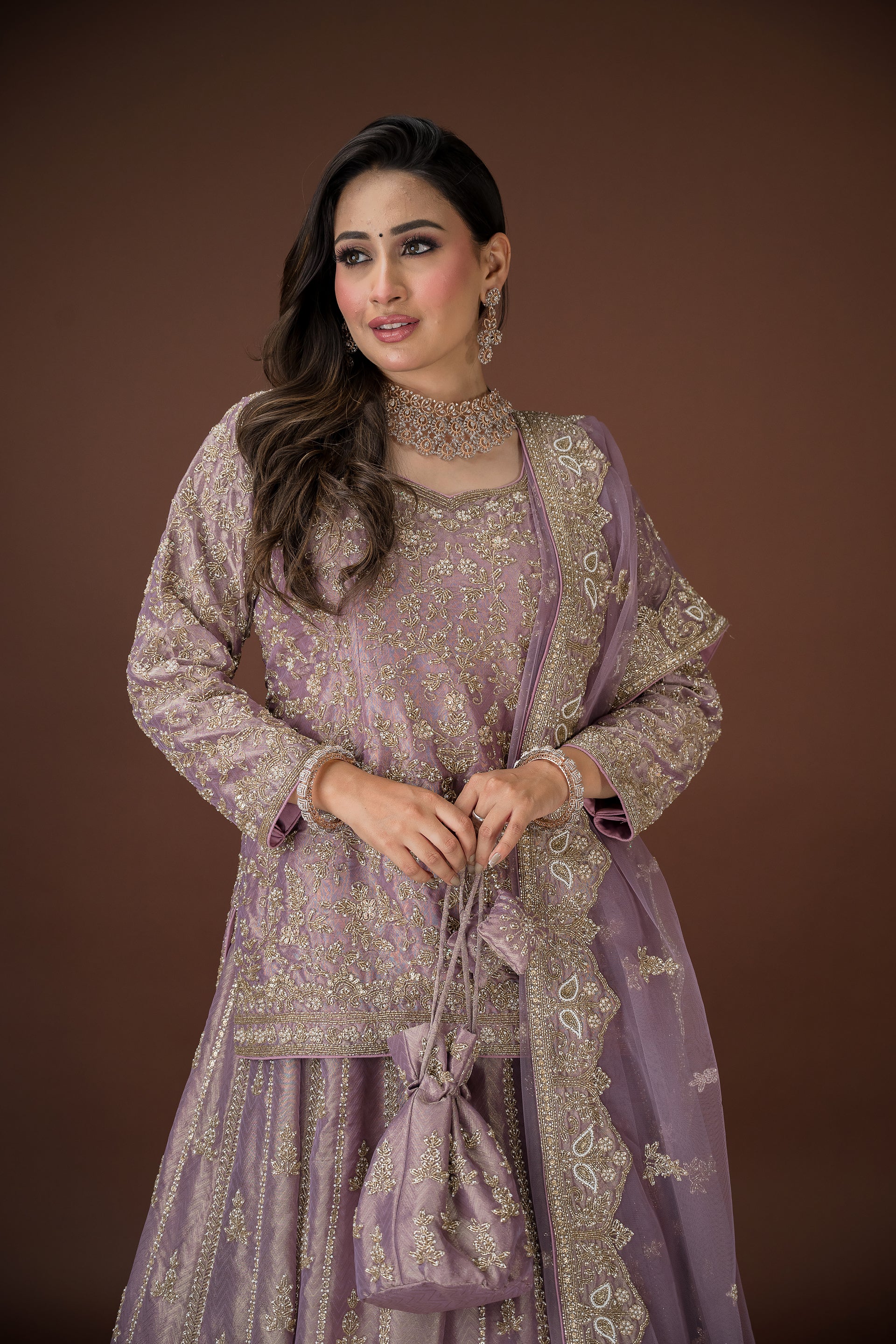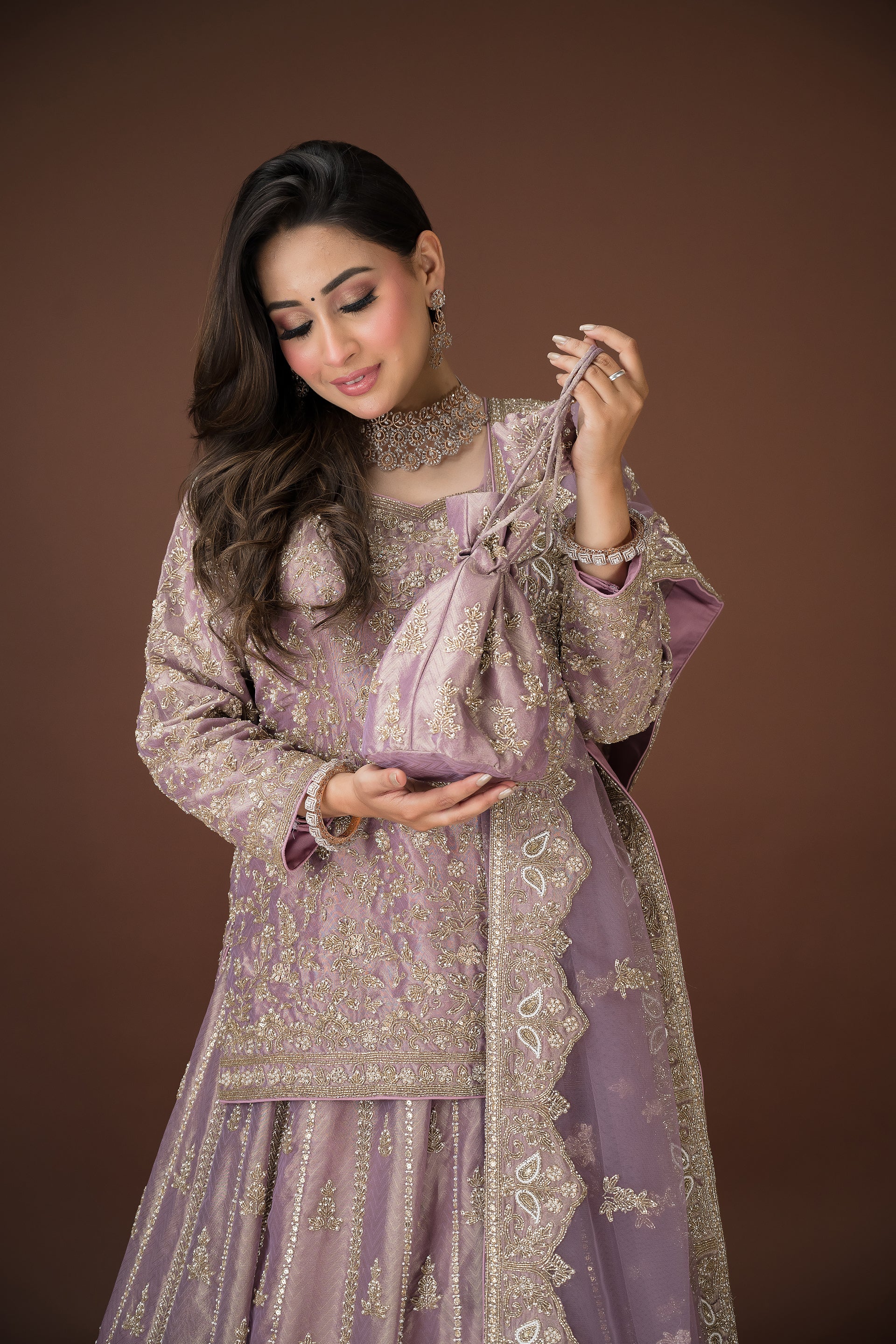 Crafted in a regal mauve hue, this lehenga set is a statement in timeless opulence. The ensemble features a fully hand-embroidered flared skirt adorned with zardozi, sequin, and threadwork motifs, intricately patterned in floral and architectural designs. The high-neck kurti-style blouse, paired with full sleeves, adds a graceful modesty to the silhouette, while the dupatta—finished with scalloped gota and delicate hand embellishments—adds fluidity and finesse. Comes with a coordinated potli bag to complete the look. This is a celebration-ready ensemble designed for festive soirées, Shagun nights, or bridesmaids who want to blend classic detailing with modern regality.