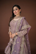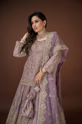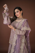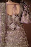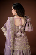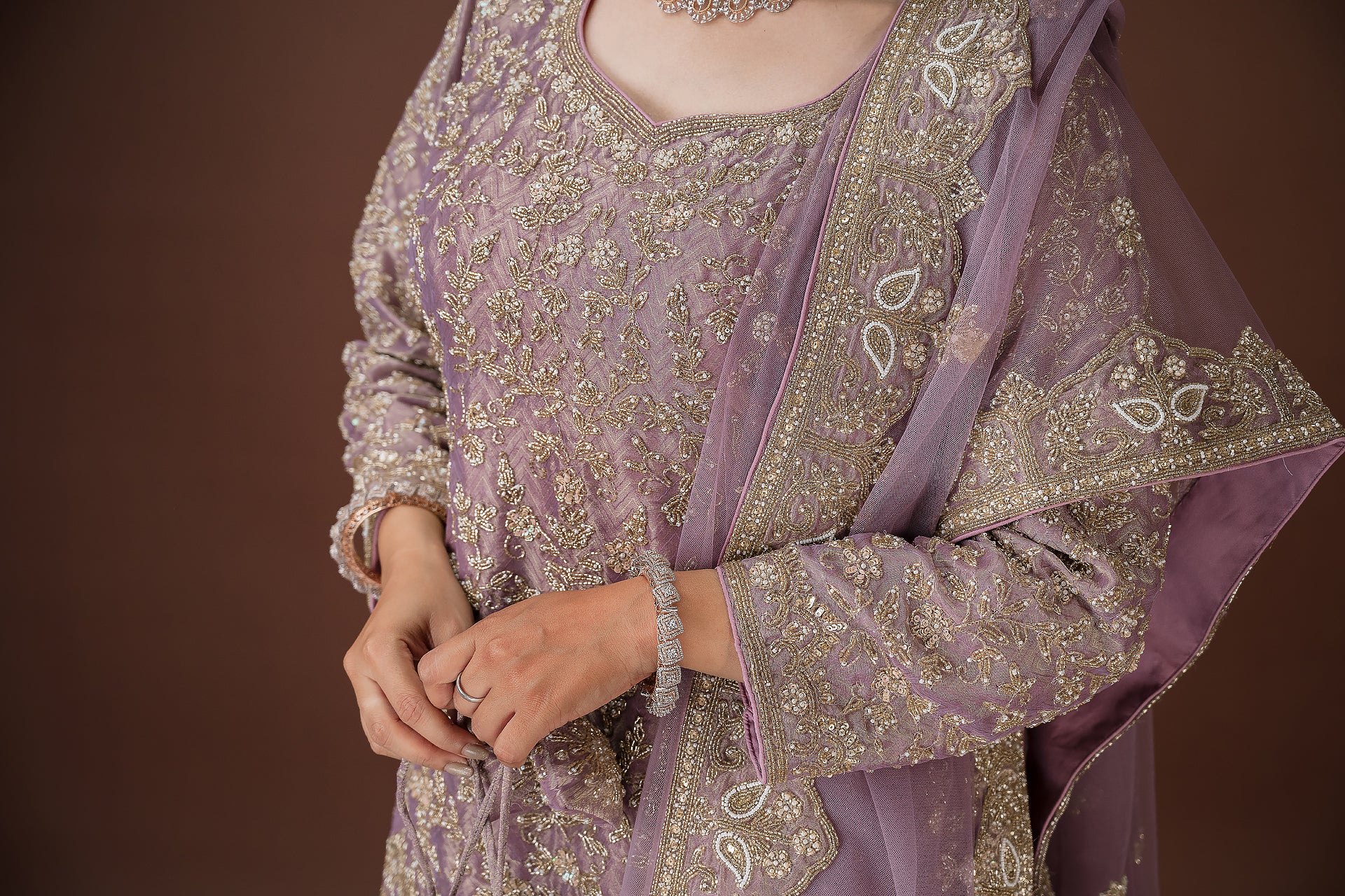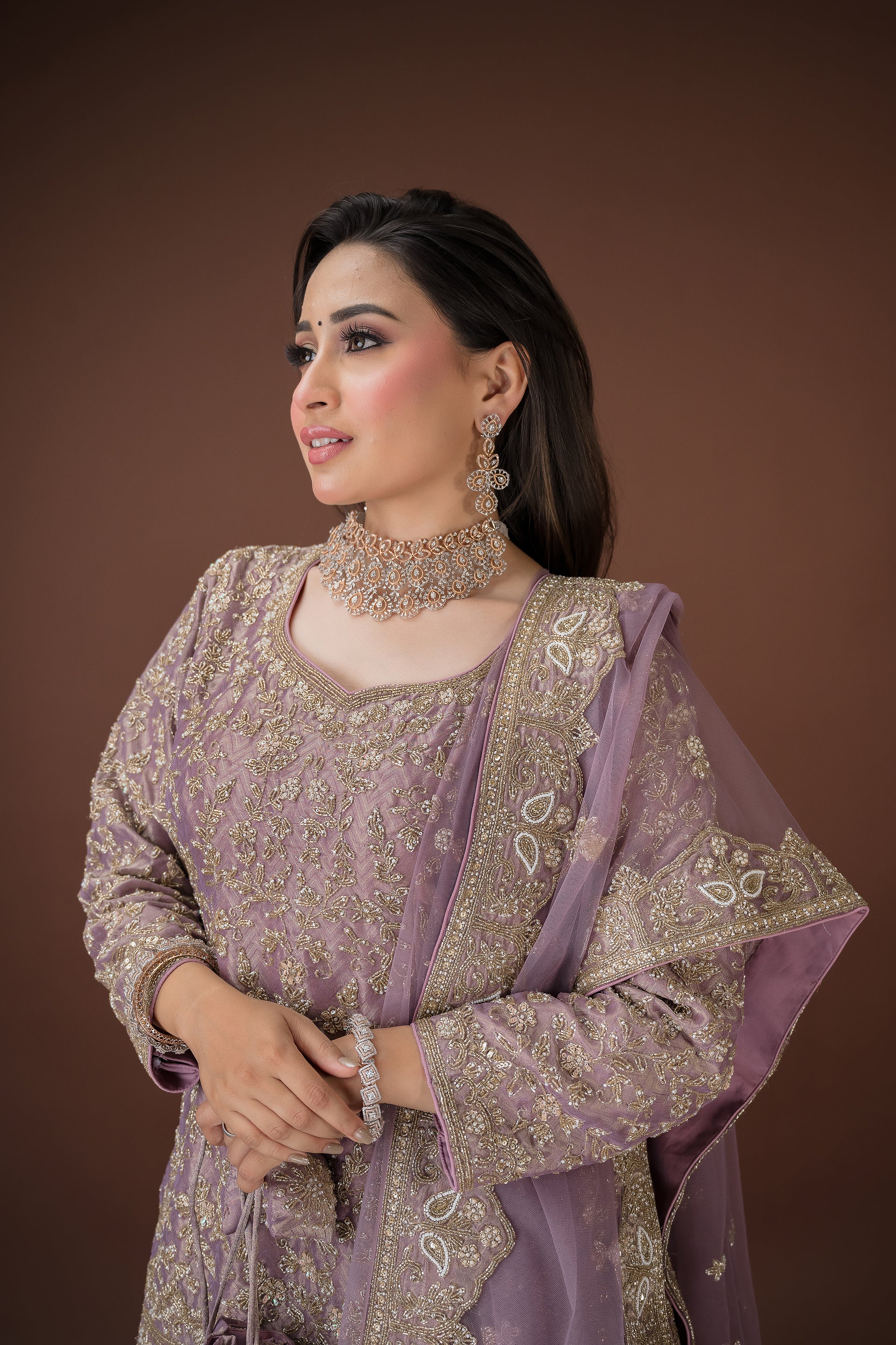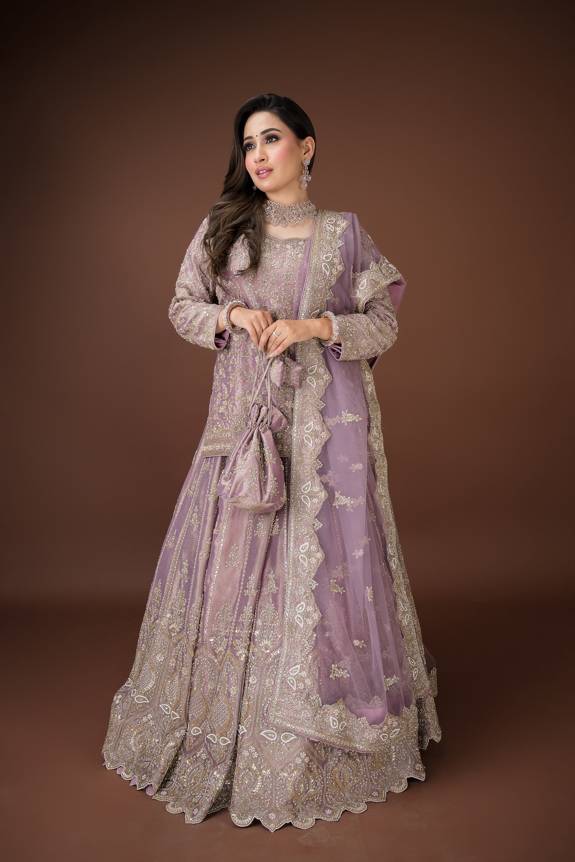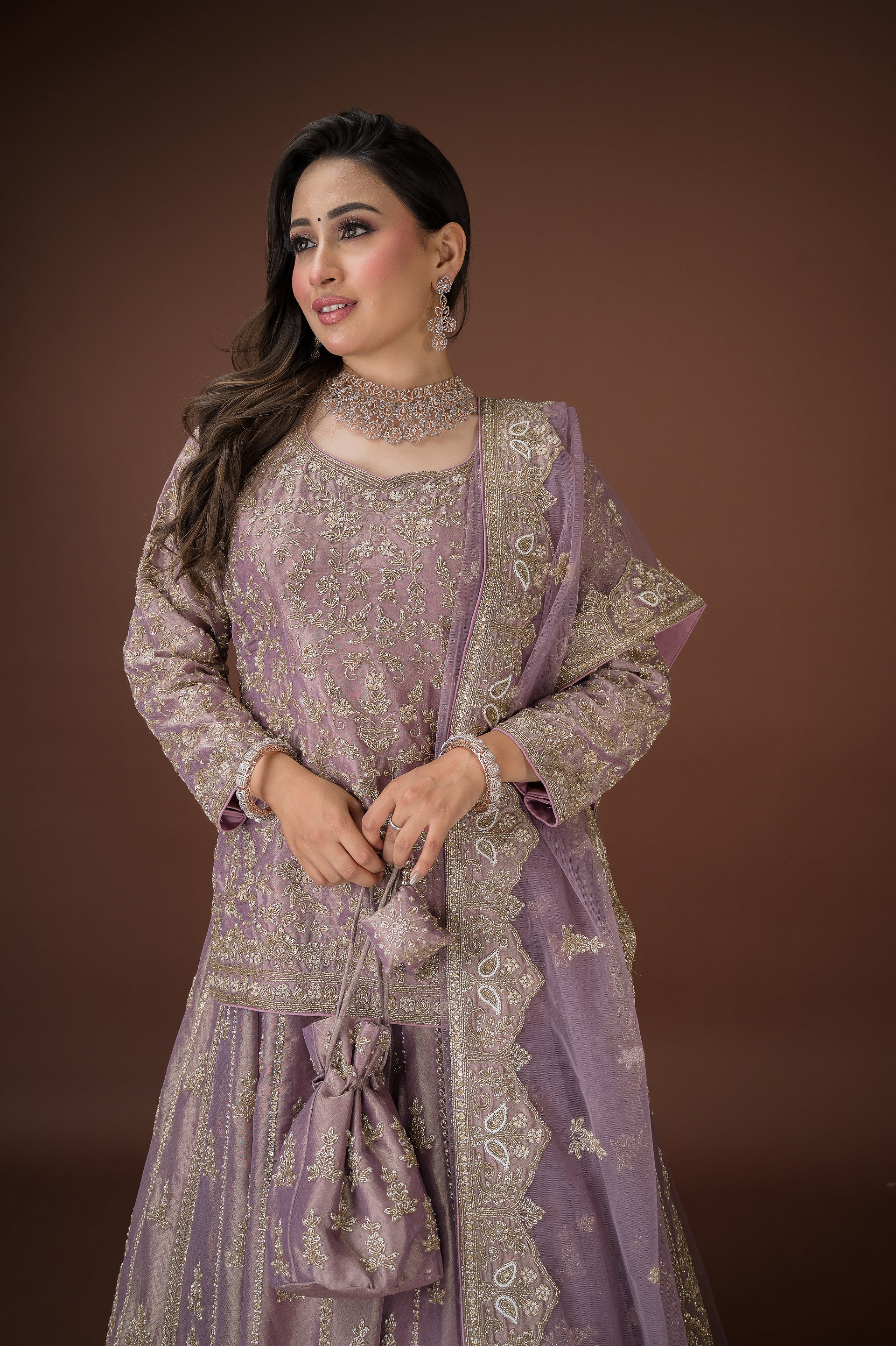 Crafted in a regal mauve hue, this lehenga set is a statement in timeless opulence. The ensemble features a fully hand-embroidered flared skirt adorned with zardozi, sequin, and threadwork motifs, intricately patterned in floral and architectural designs. The high-neck kurti-style blouse, paired with full sleeves, adds a graceful modesty to the silhouette, while the dupatta—finished with scalloped gota and delicate hand embellishments—adds fluidity and finesse. Comes with a coordinated potli bag to complete the look. This is a celebration-ready ensemble designed for festive soirées, Shagun nights, or bridesmaids who want to blend classic detailing with modern regality.