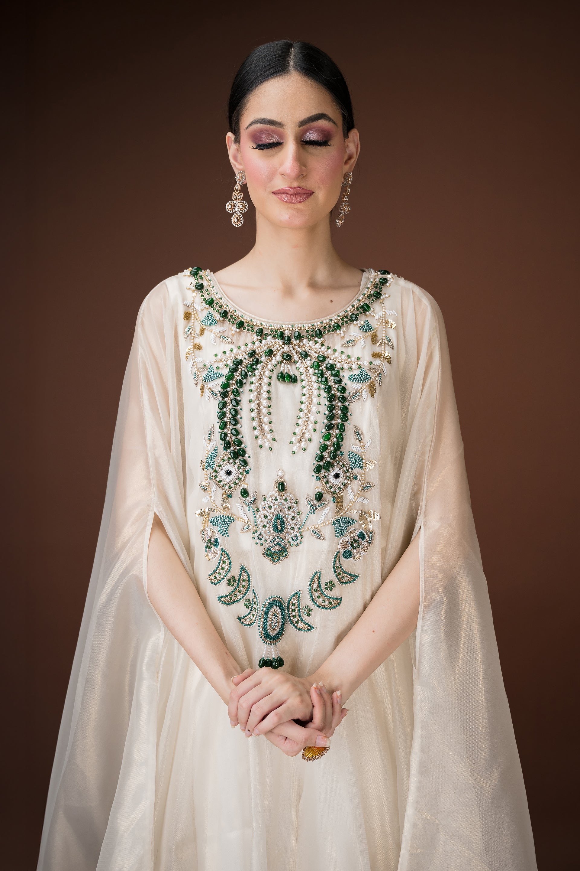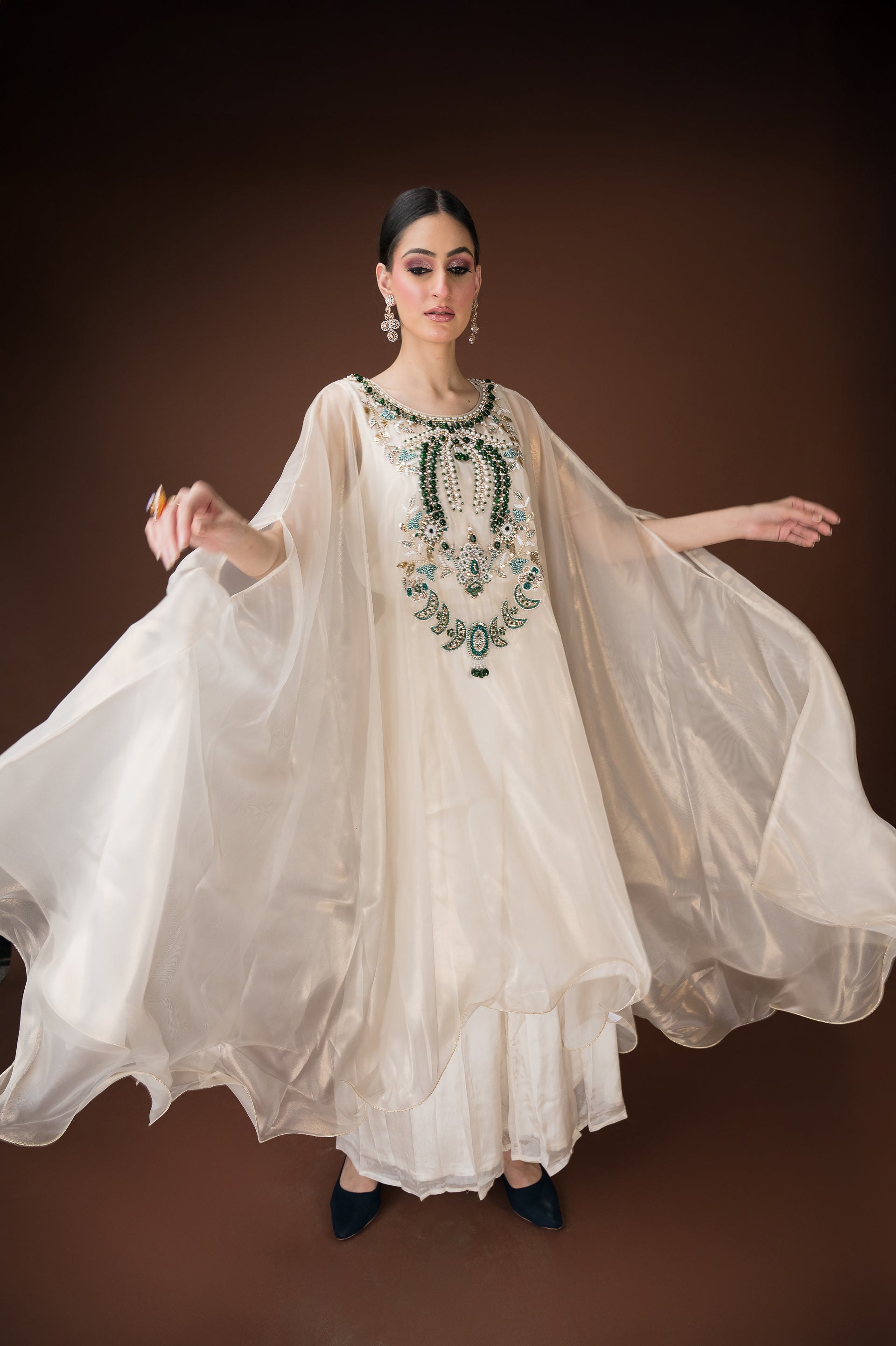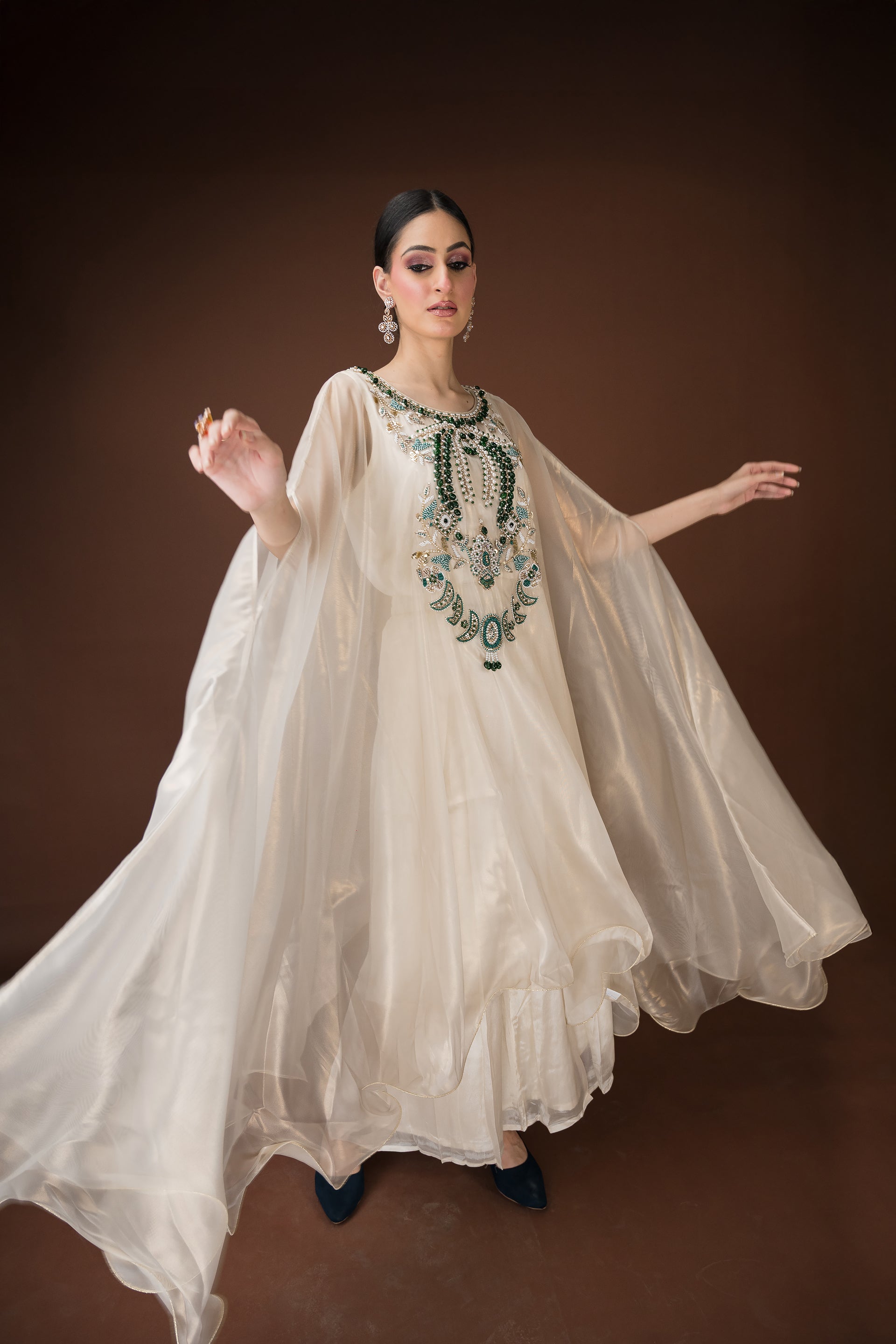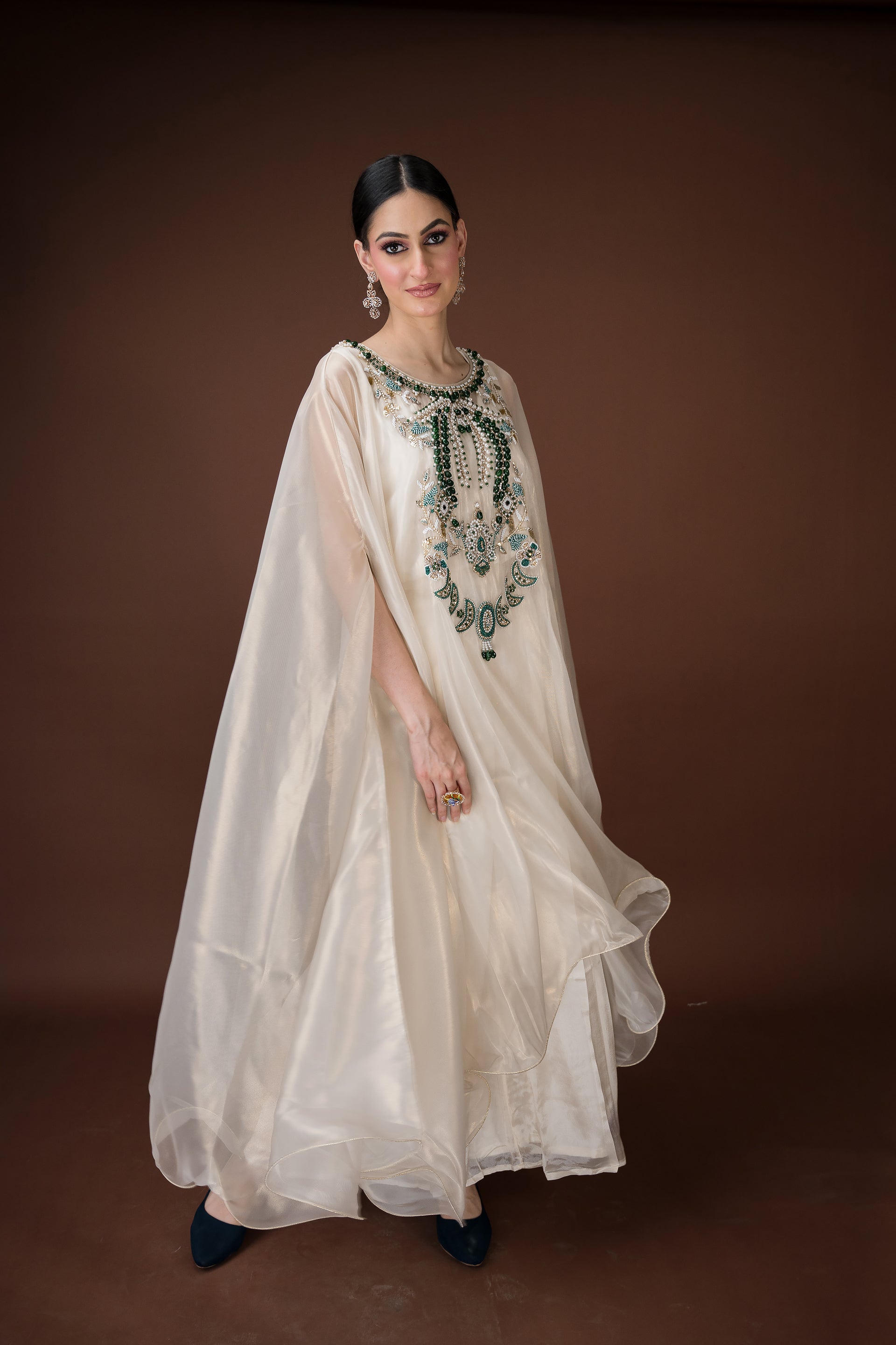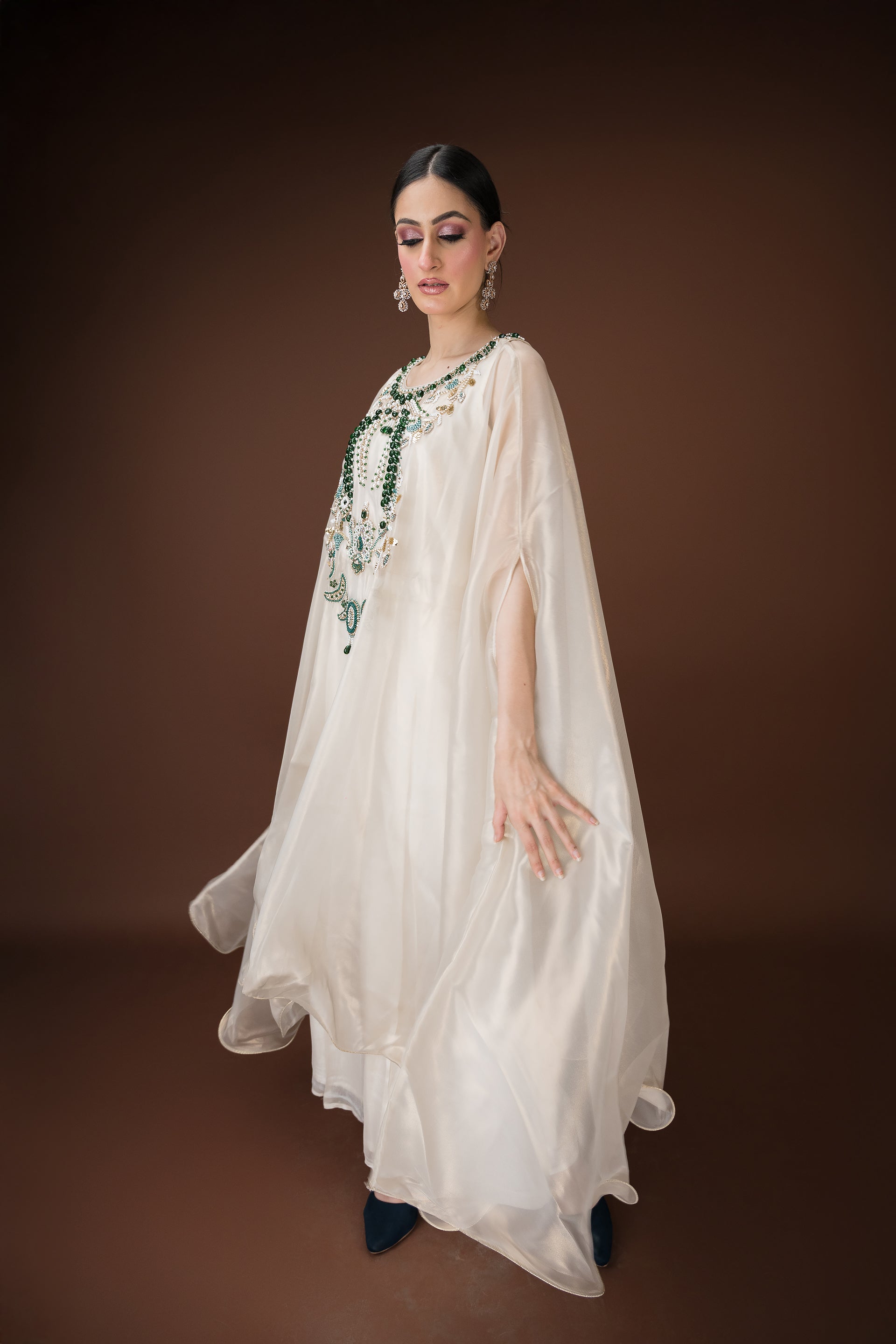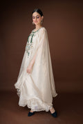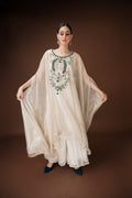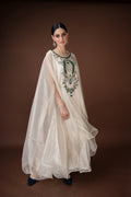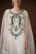 An ivory organza kaftan featuring elaborate hand embroidery with emerald-toned stones, sequins, and crystals in a statement neckline pattern. The silhouette flows effortlessly with inner layers of satin, making it a sophisticated choice for cocktail evenings and luxury gatherings.