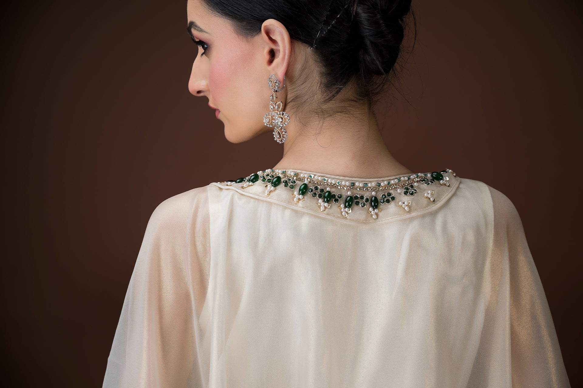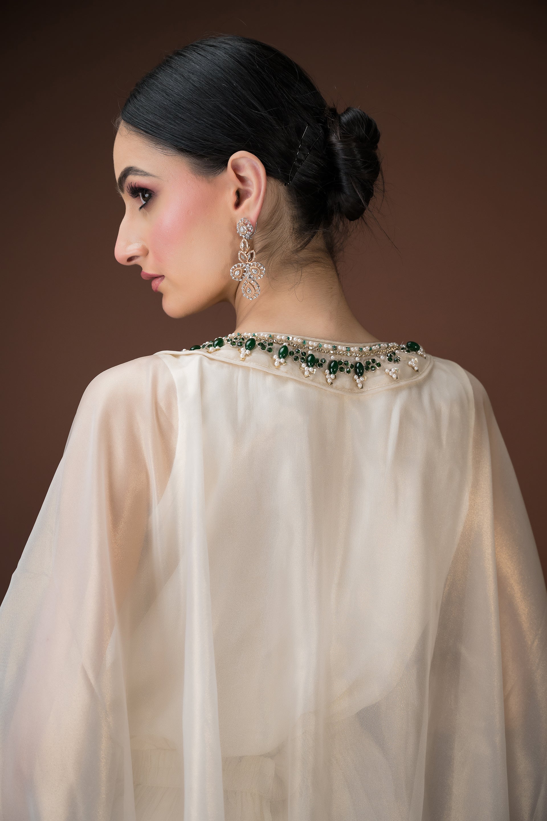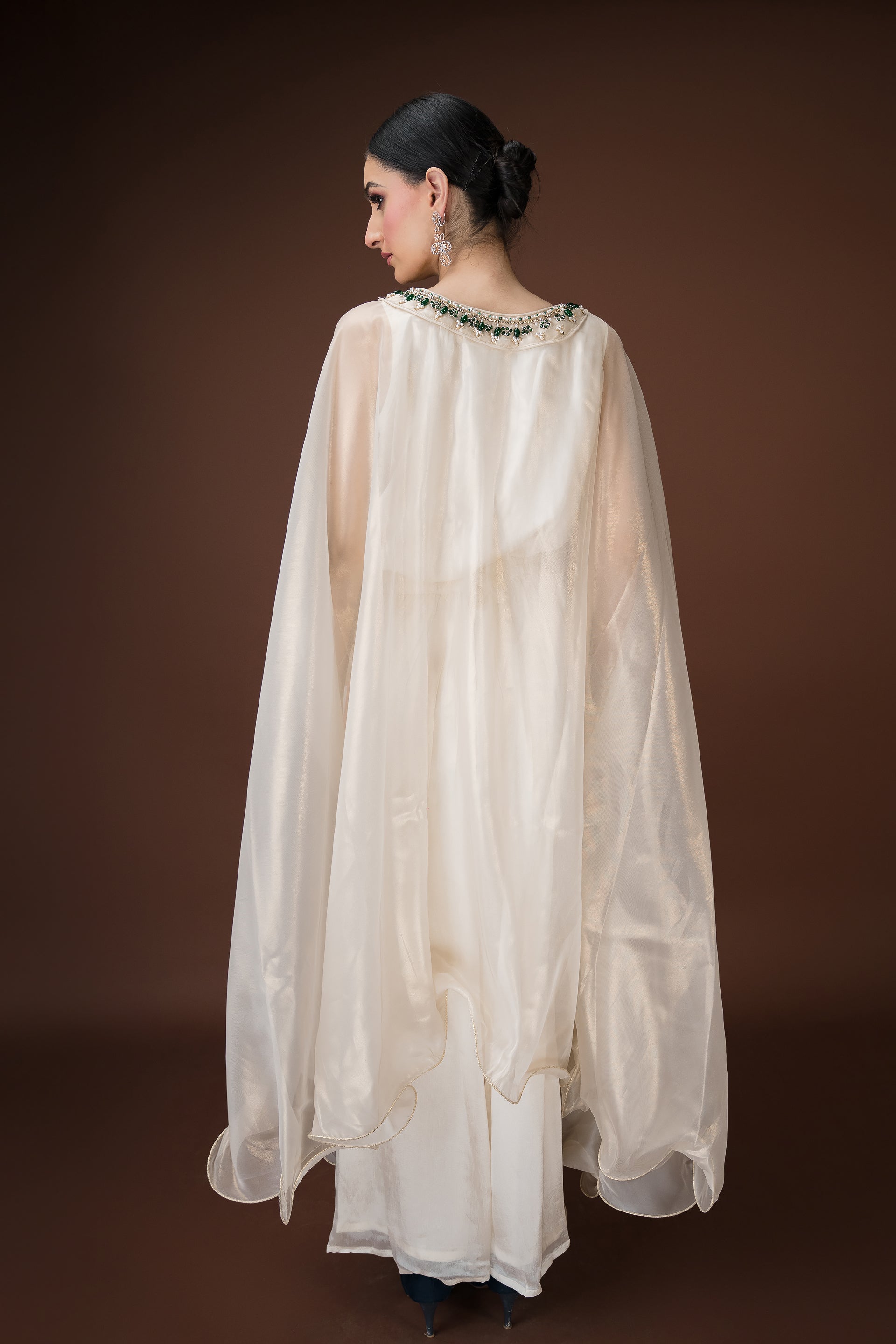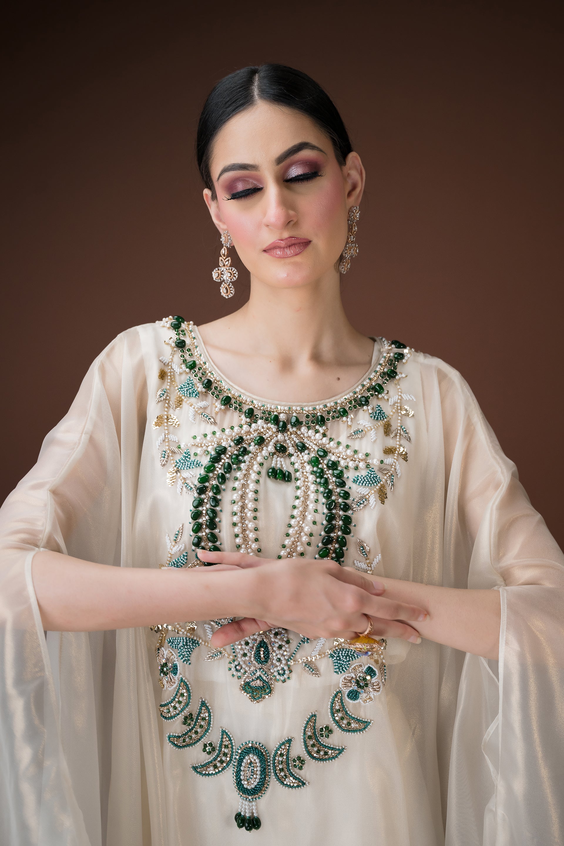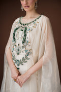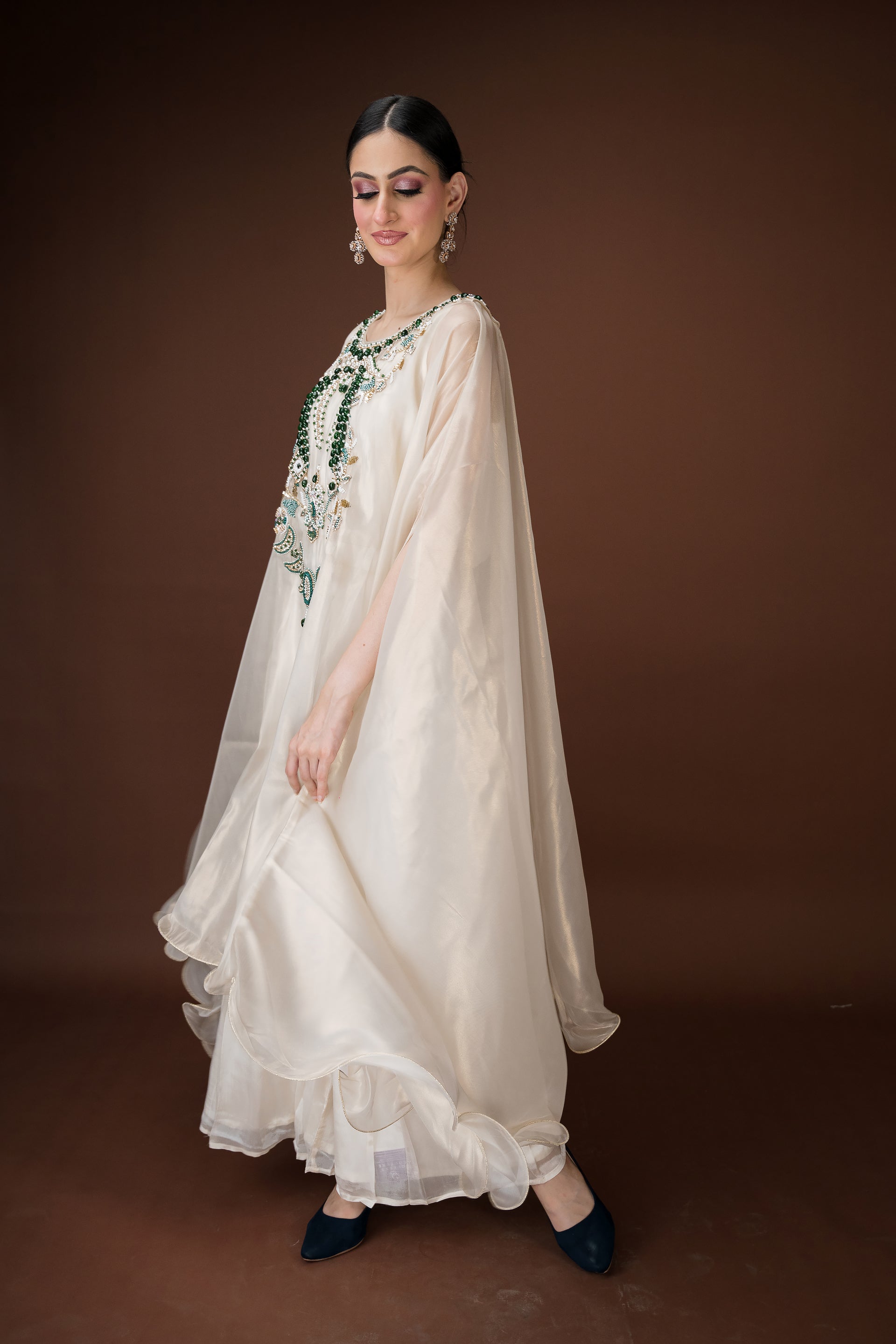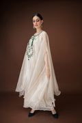 An ivory organza kaftan featuring elaborate hand embroidery with emerald-toned stones, sequins, and crystals in a statement neckline pattern. The silhouette flows effortlessly with inner layers of satin, making it a sophisticated choice for cocktail evenings and luxury gatherings.