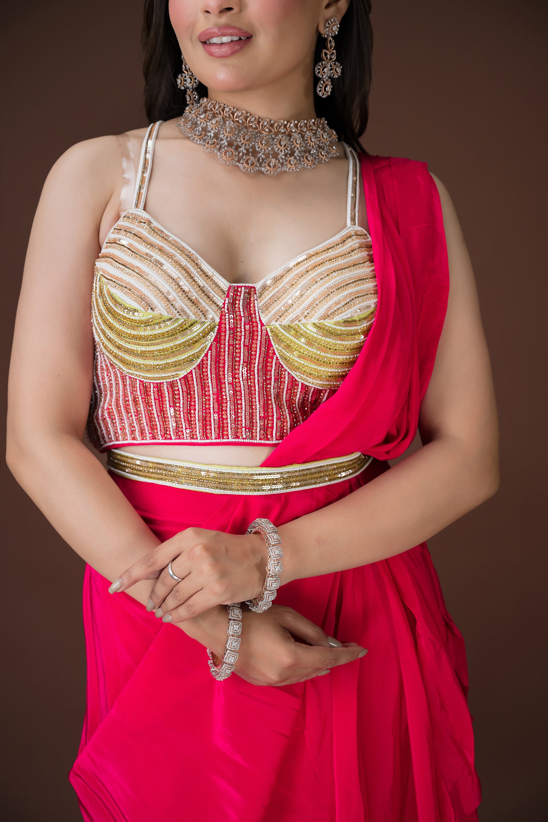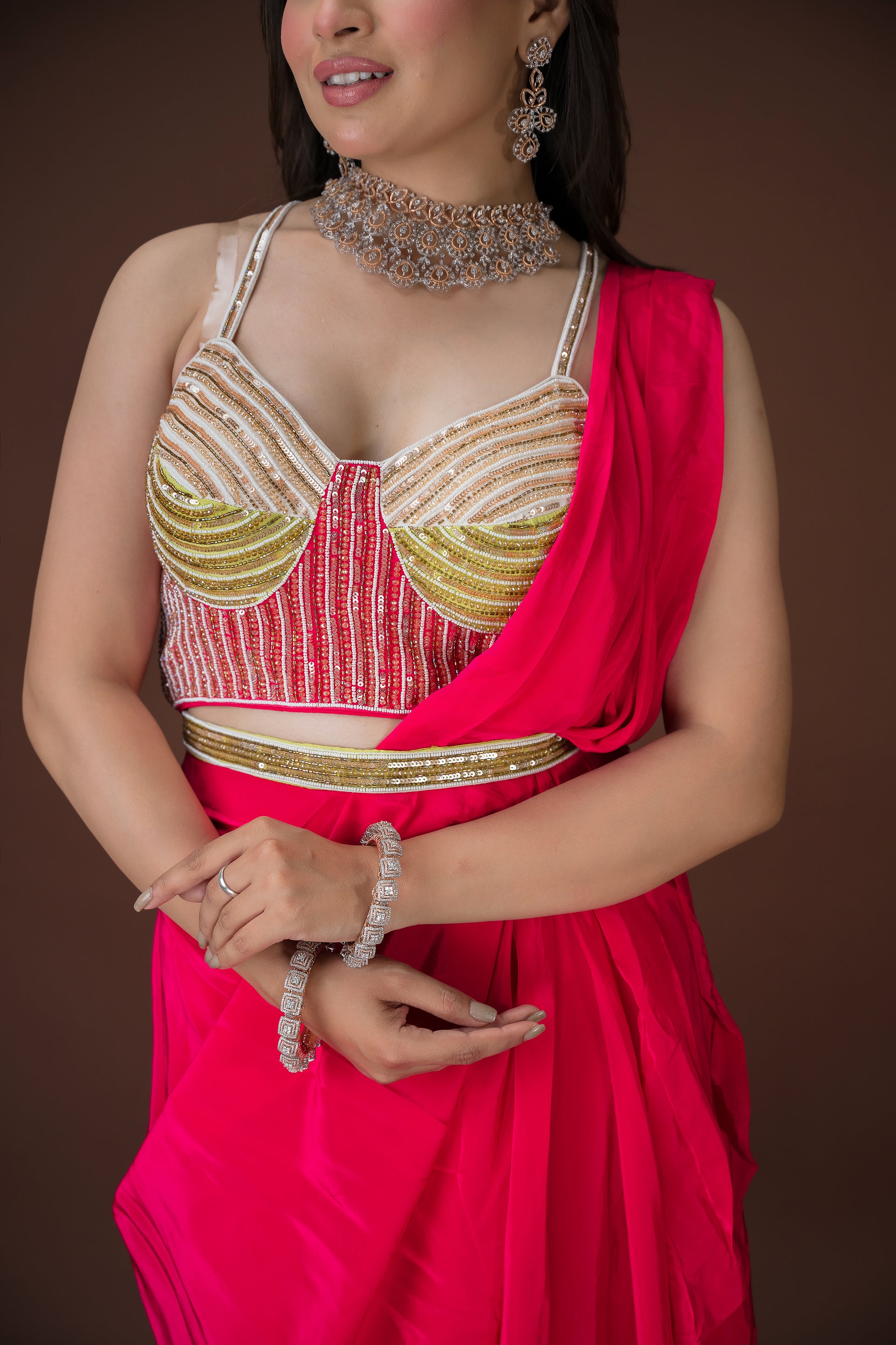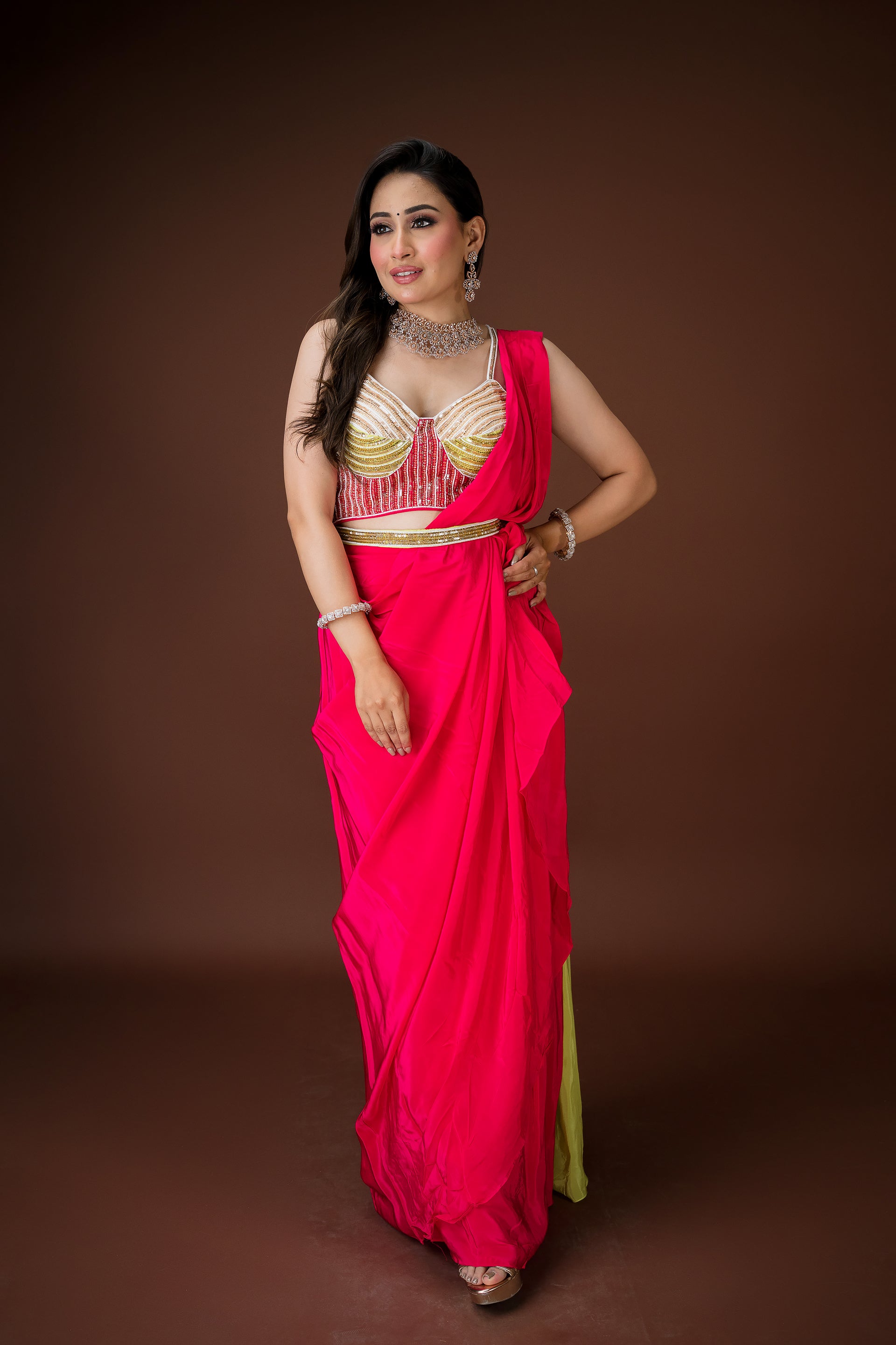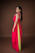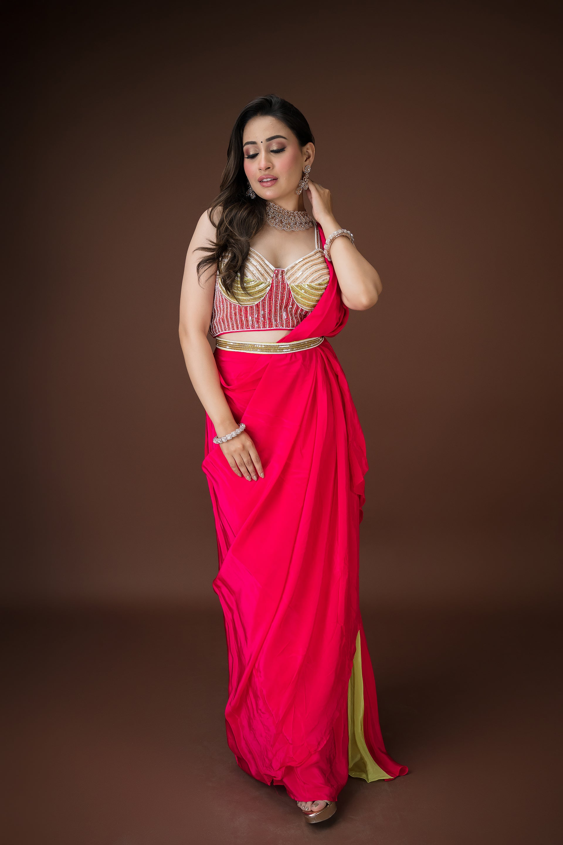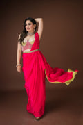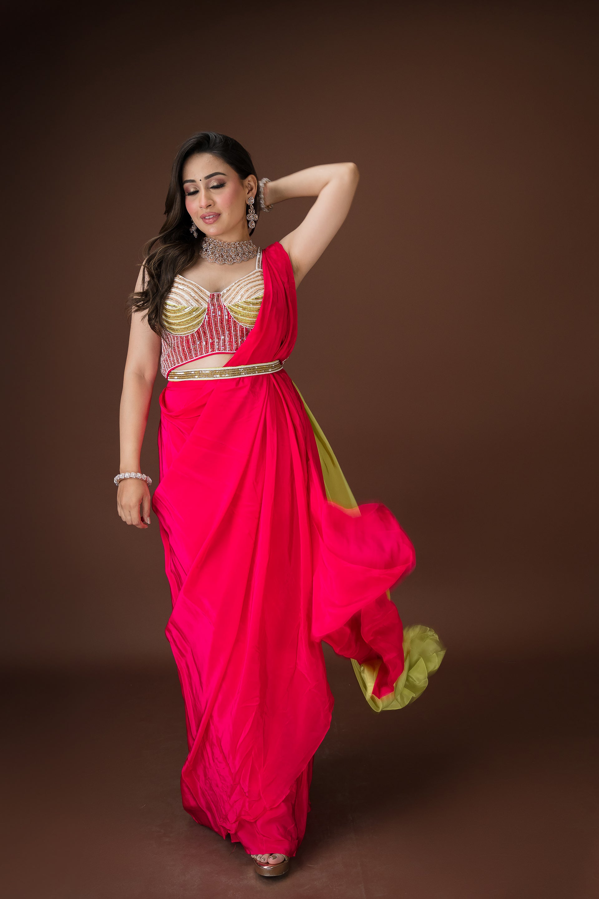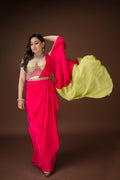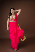 this striking pre-draped saree in electric pink and lime is unapologetically bold. Paired with a sculpted blouse encrusted in pearls and gold sequins, the look is both daring and dramatic. The effortless drape, paired with a defined waistline, makes it perfect for cocktail nights, destination weddings, or fashion-forward festive wear