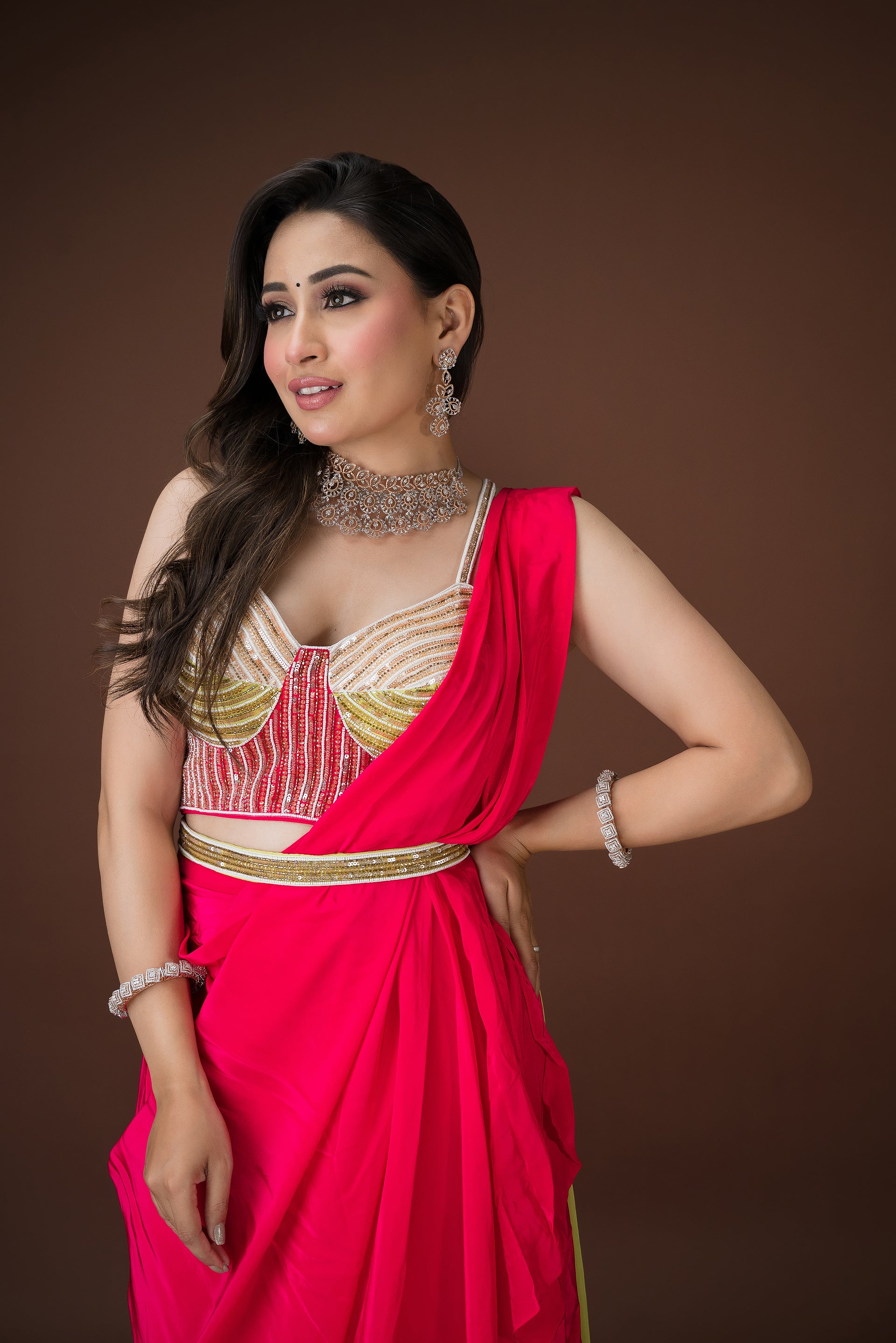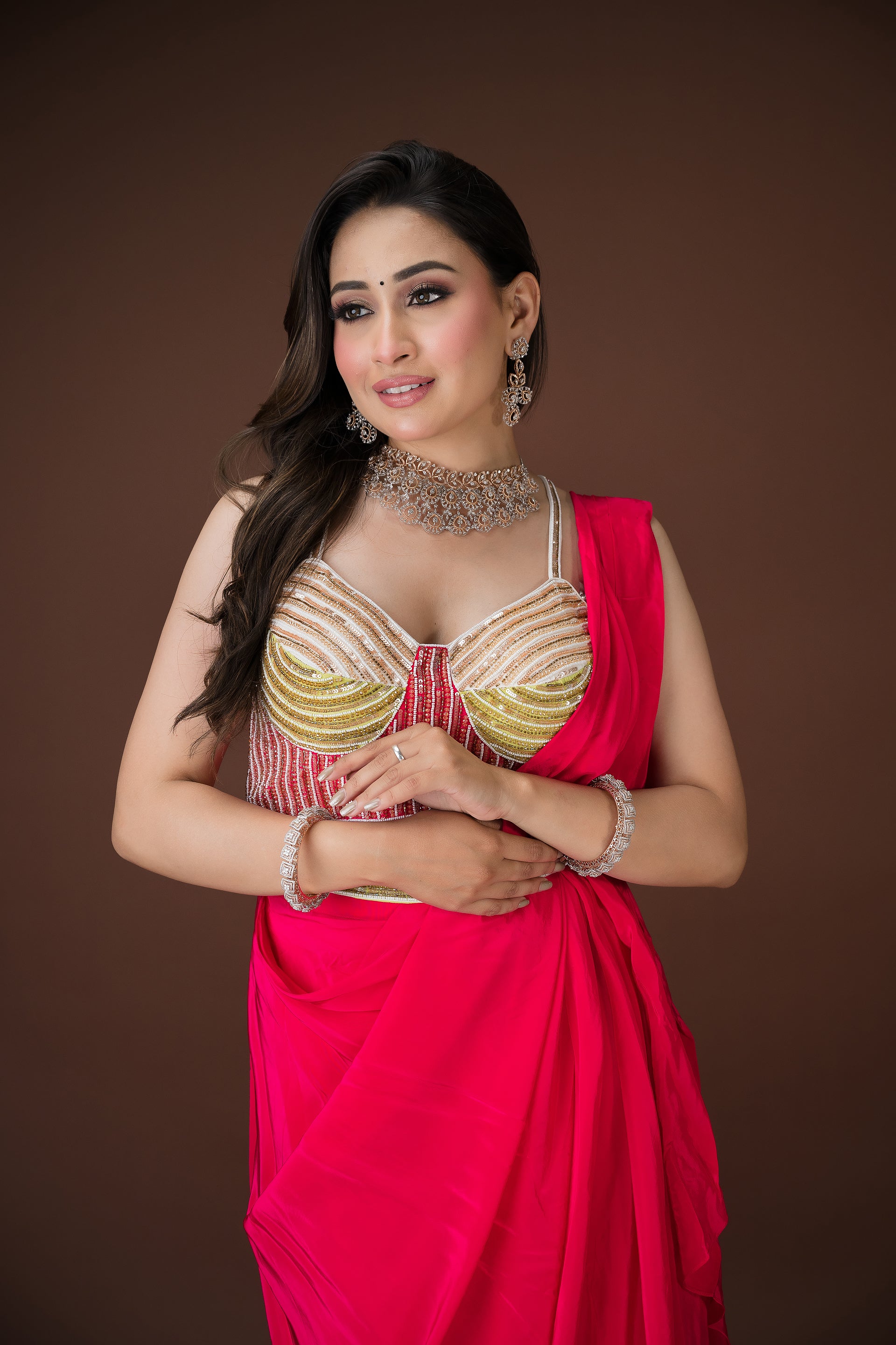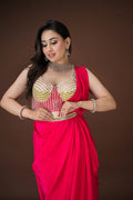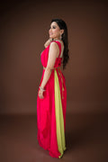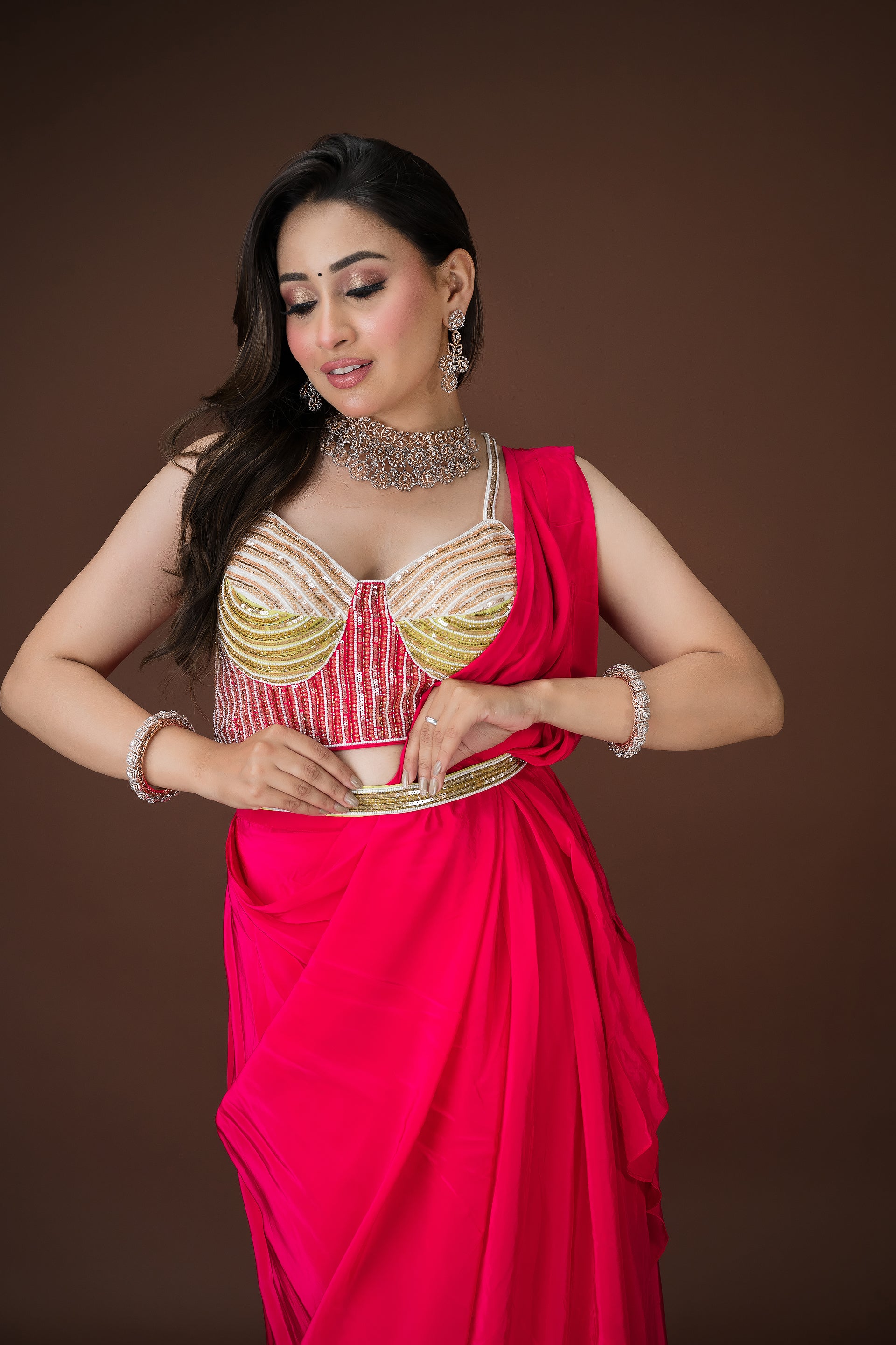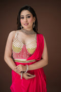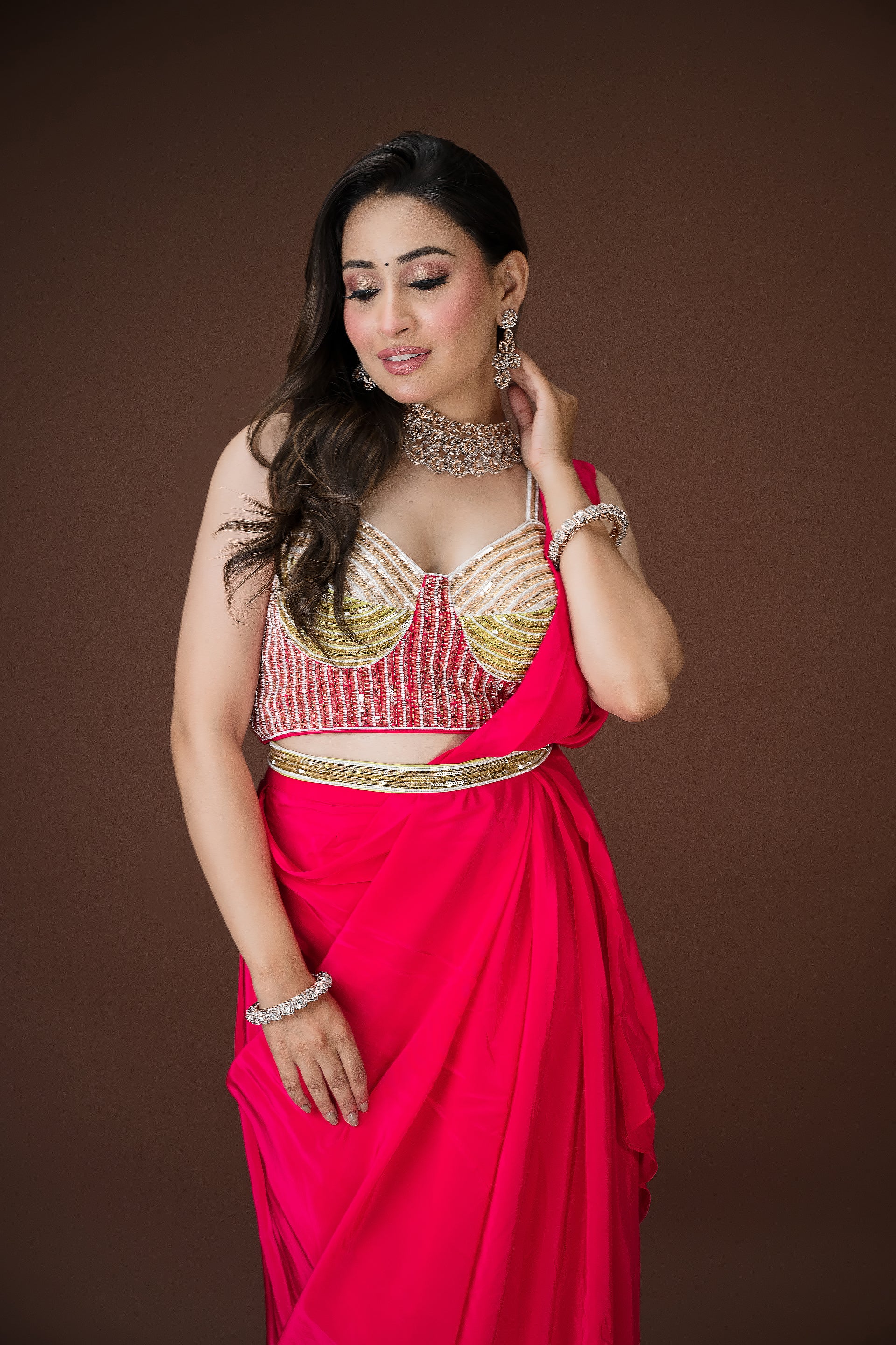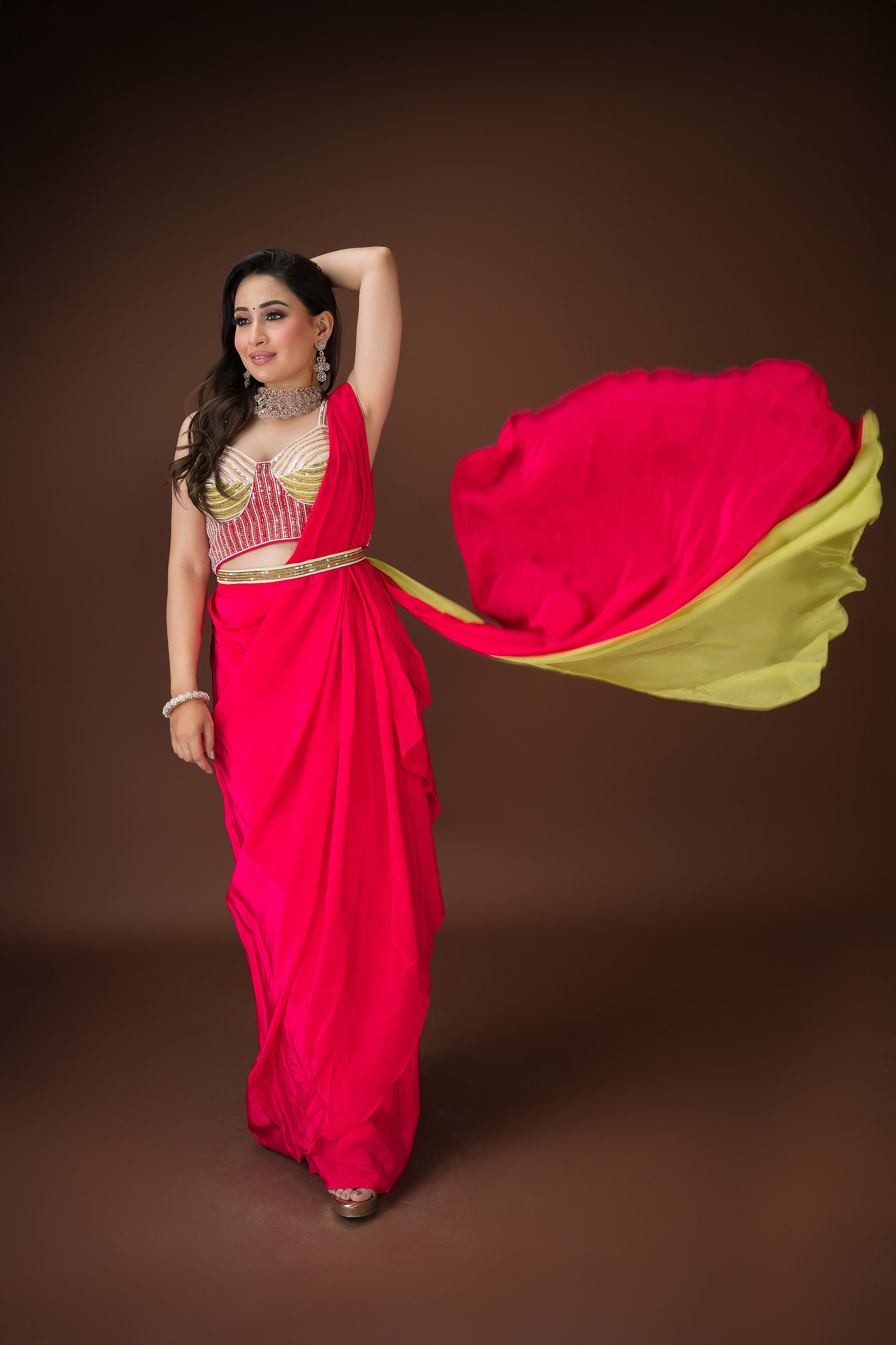 this striking pre-draped saree in electric pink and lime is unapologetically bold. Paired with a sculpted blouse encrusted in pearls and gold sequins, the look is both daring and dramatic. The effortless drape, paired with a defined waistline, makes it perfect for cocktail nights, destination weddings, or fashion-forward festive wear