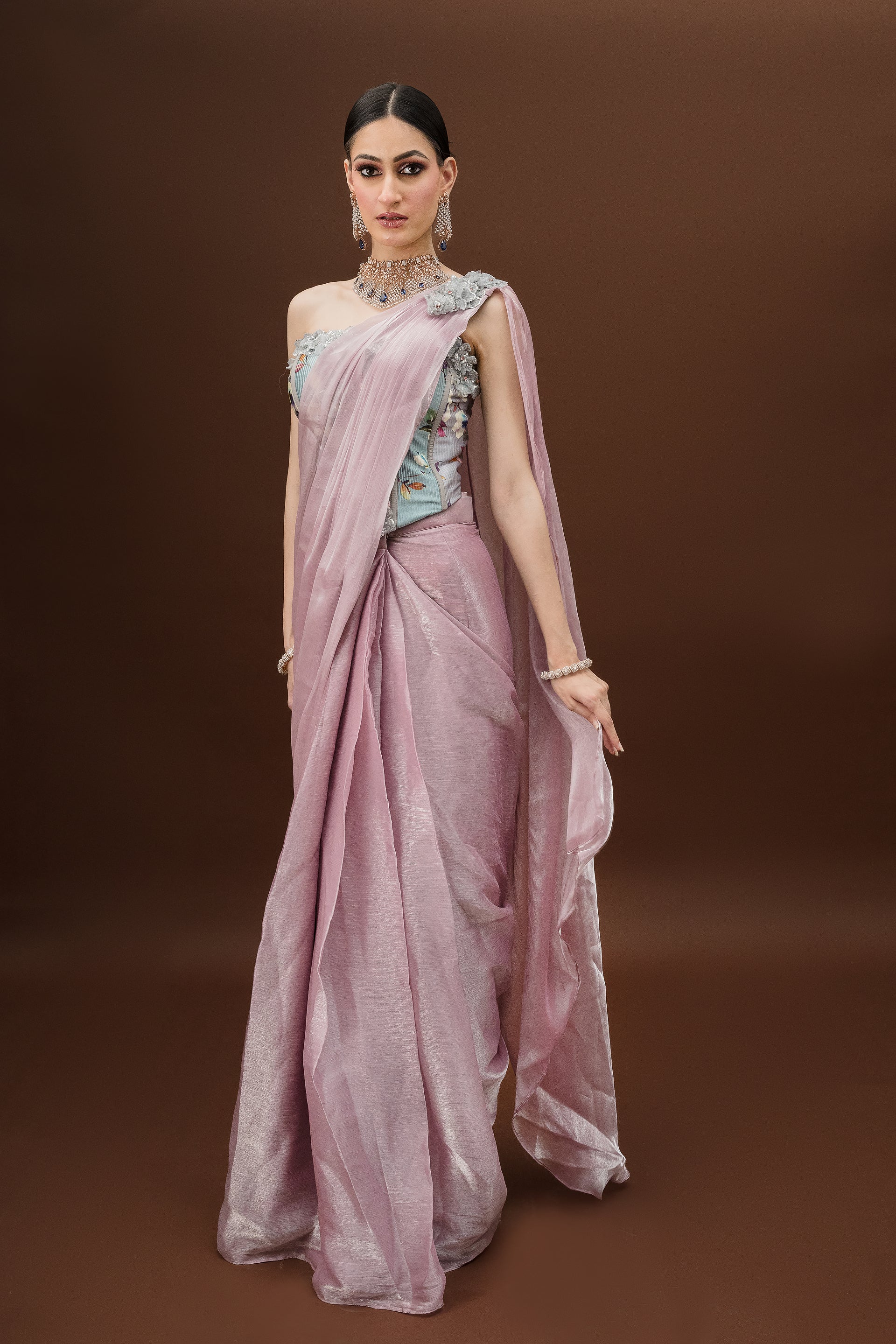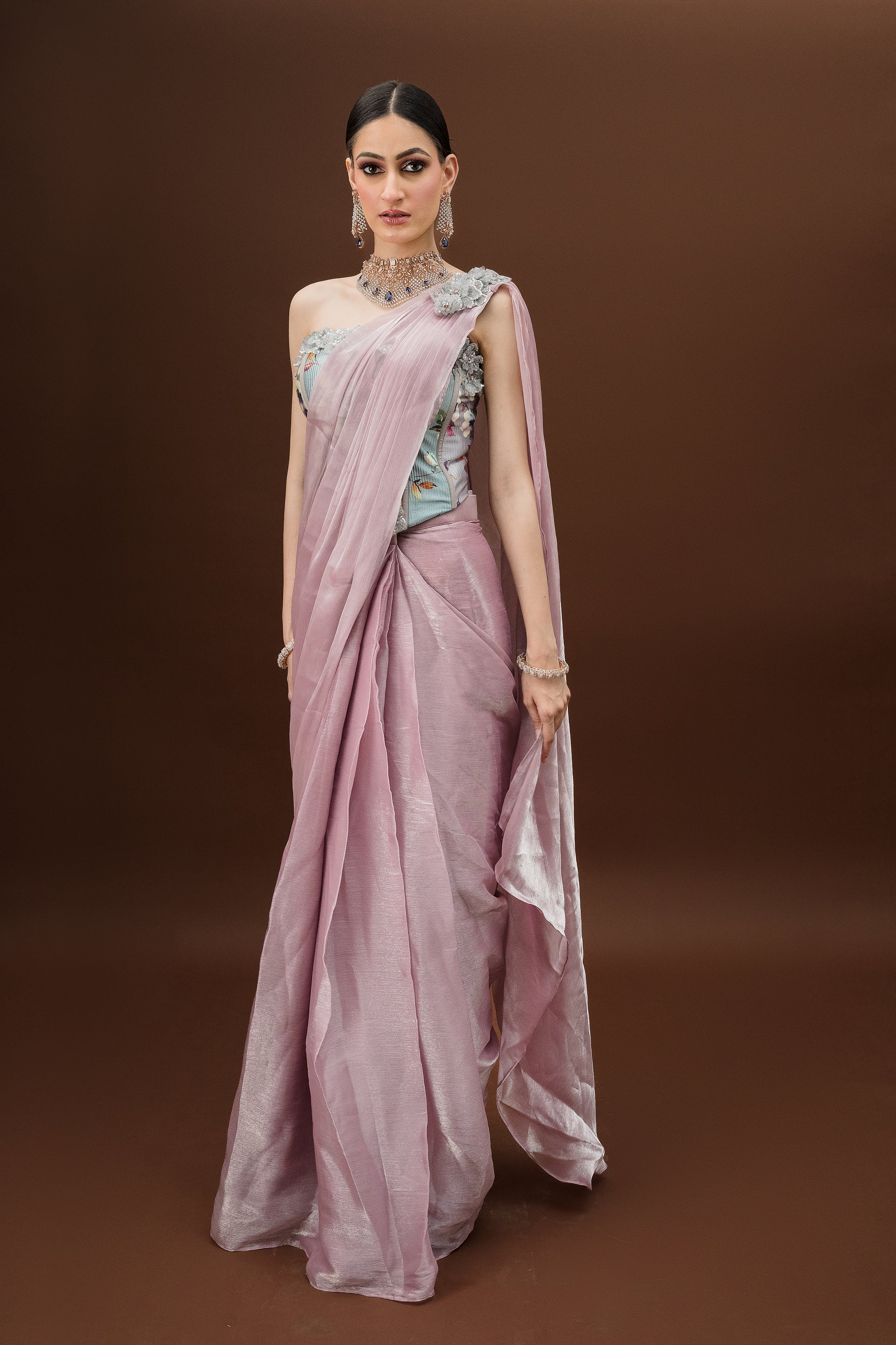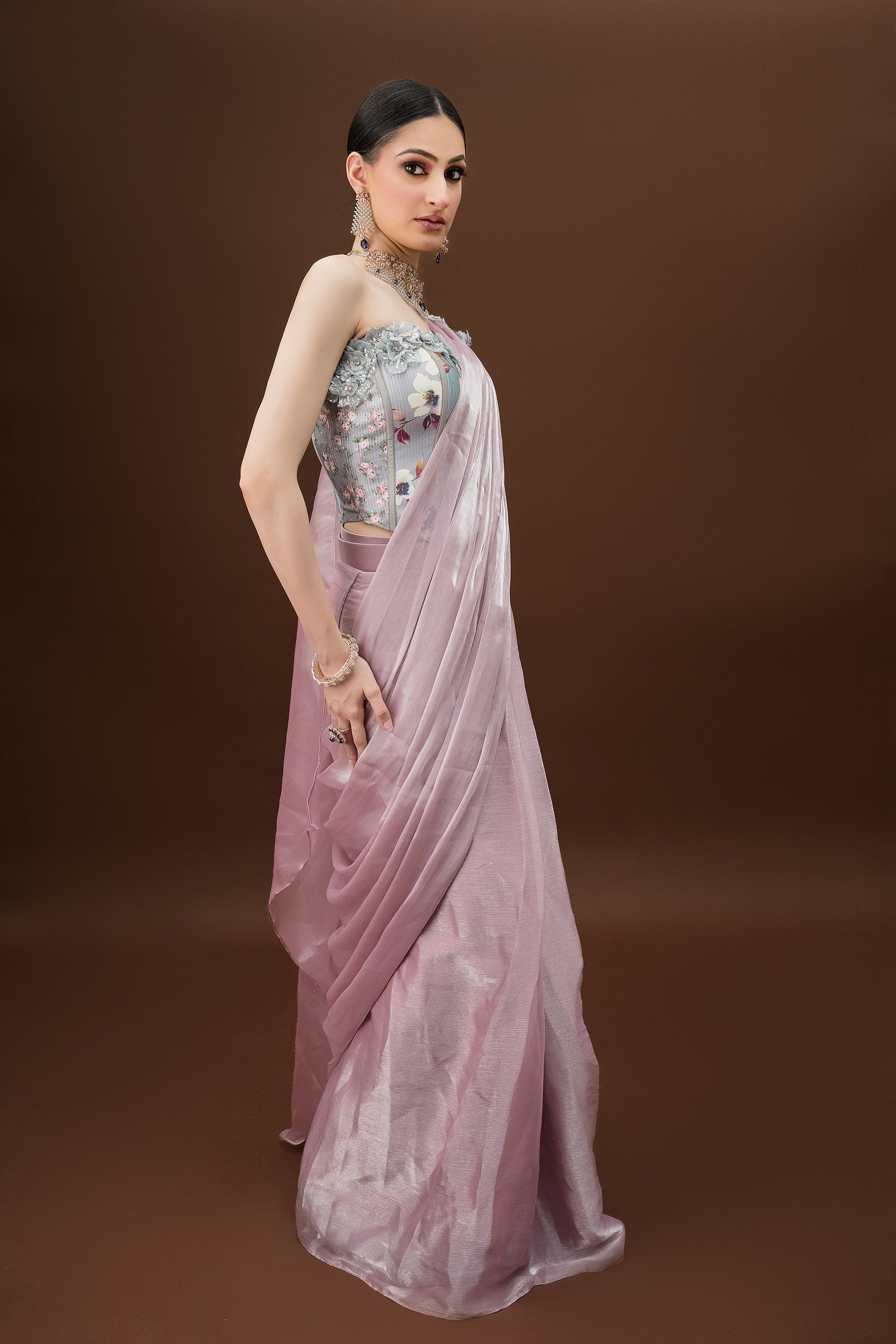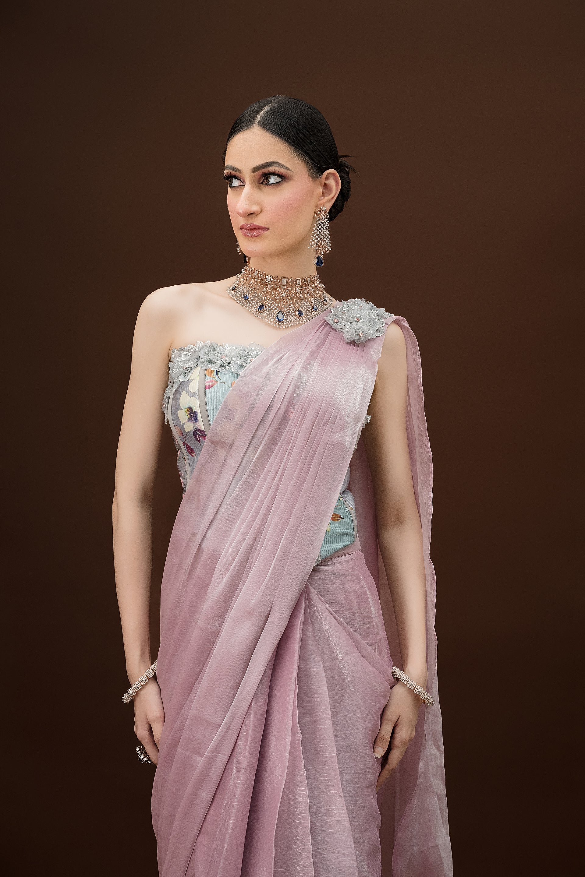 this stunning contemporary drape saree in a soft mauve pink hue, crafted from shimmering organza that flows effortlessly with every step. The saree is paired with an exquisite strapless corset blouse, intricately hand-embroidered with delicate floral motifs in pastel tones and adorned with three-dimensional floral appliqués for a modern romantic touch. The structured bodice enhances the silhouette while offering a striking contrast to the soft, fluid drape