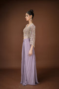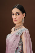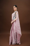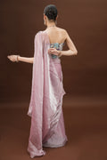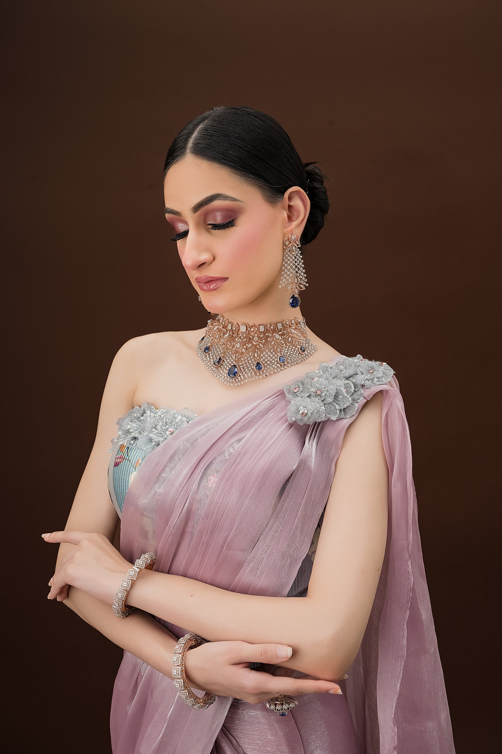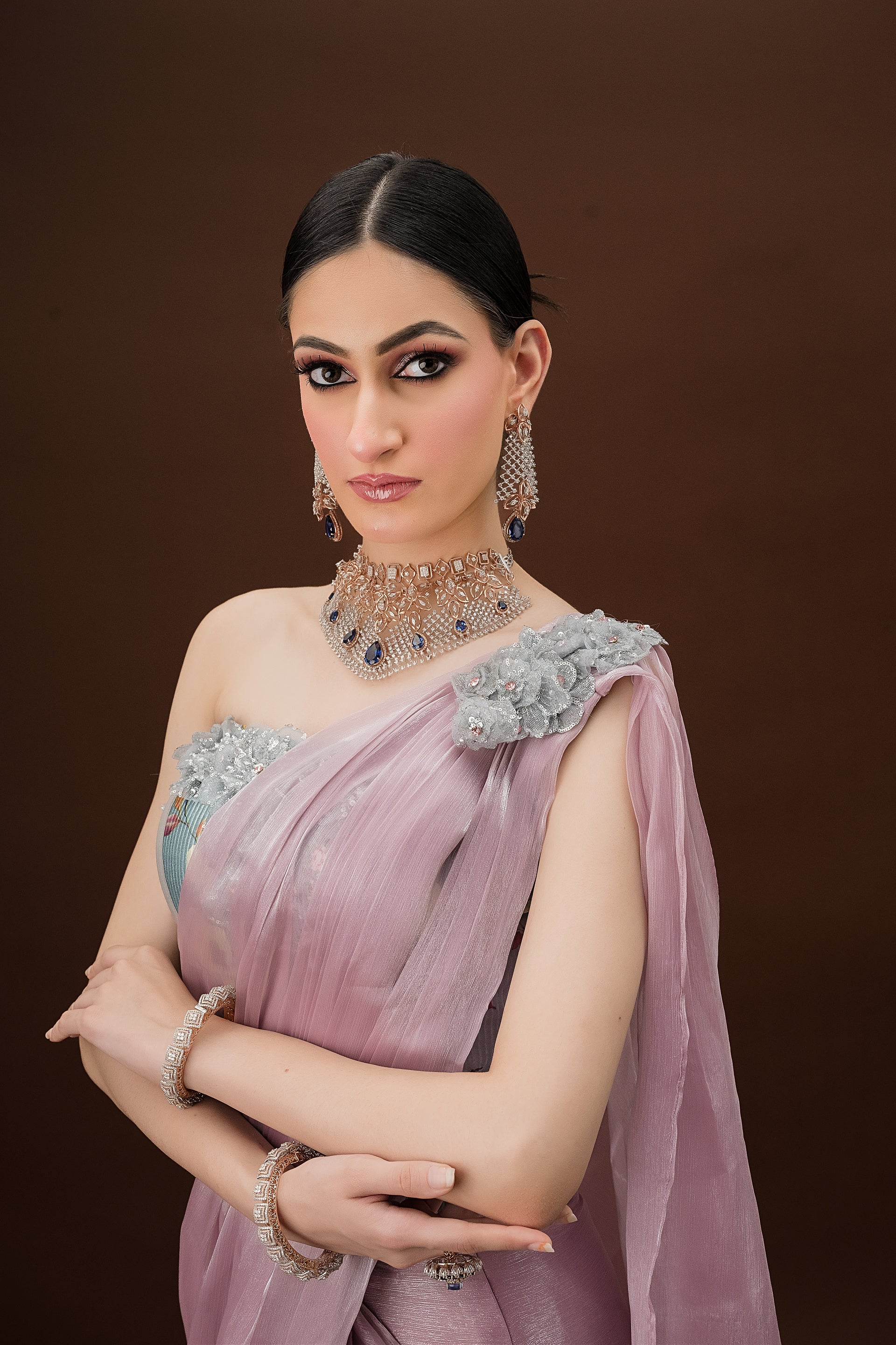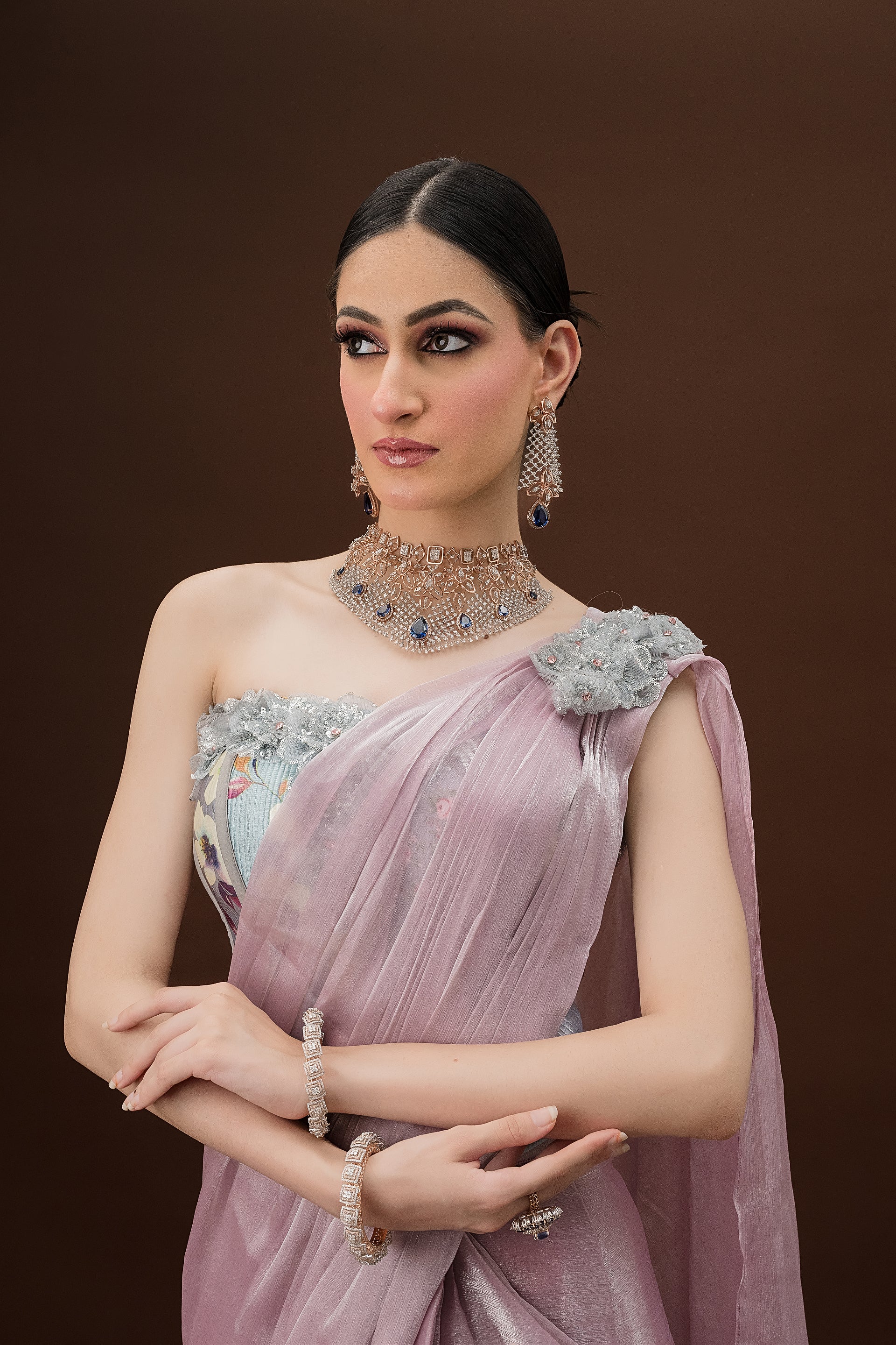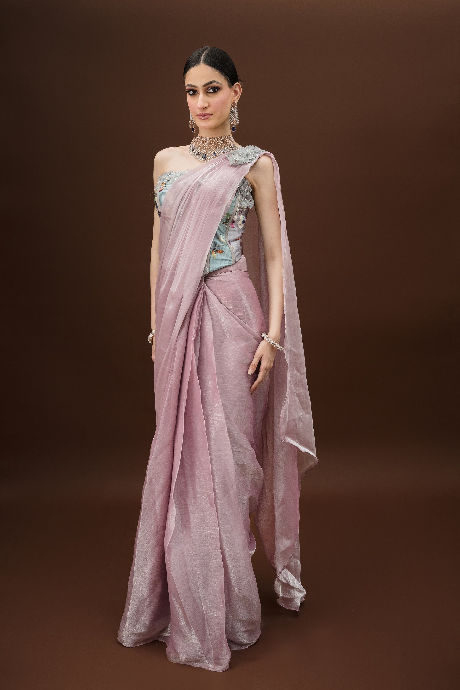 this stunning contemporary drape saree in a soft mauve pink hue, crafted from shimmering organza that flows effortlessly with every step. The saree is paired with an exquisite strapless corset blouse, intricately hand-embroidered with delicate floral motifs in pastel tones and adorned with three-dimensional floral appliqués for a modern romantic touch. The structured bodice enhances the silhouette while offering a striking contrast to the soft, fluid drape