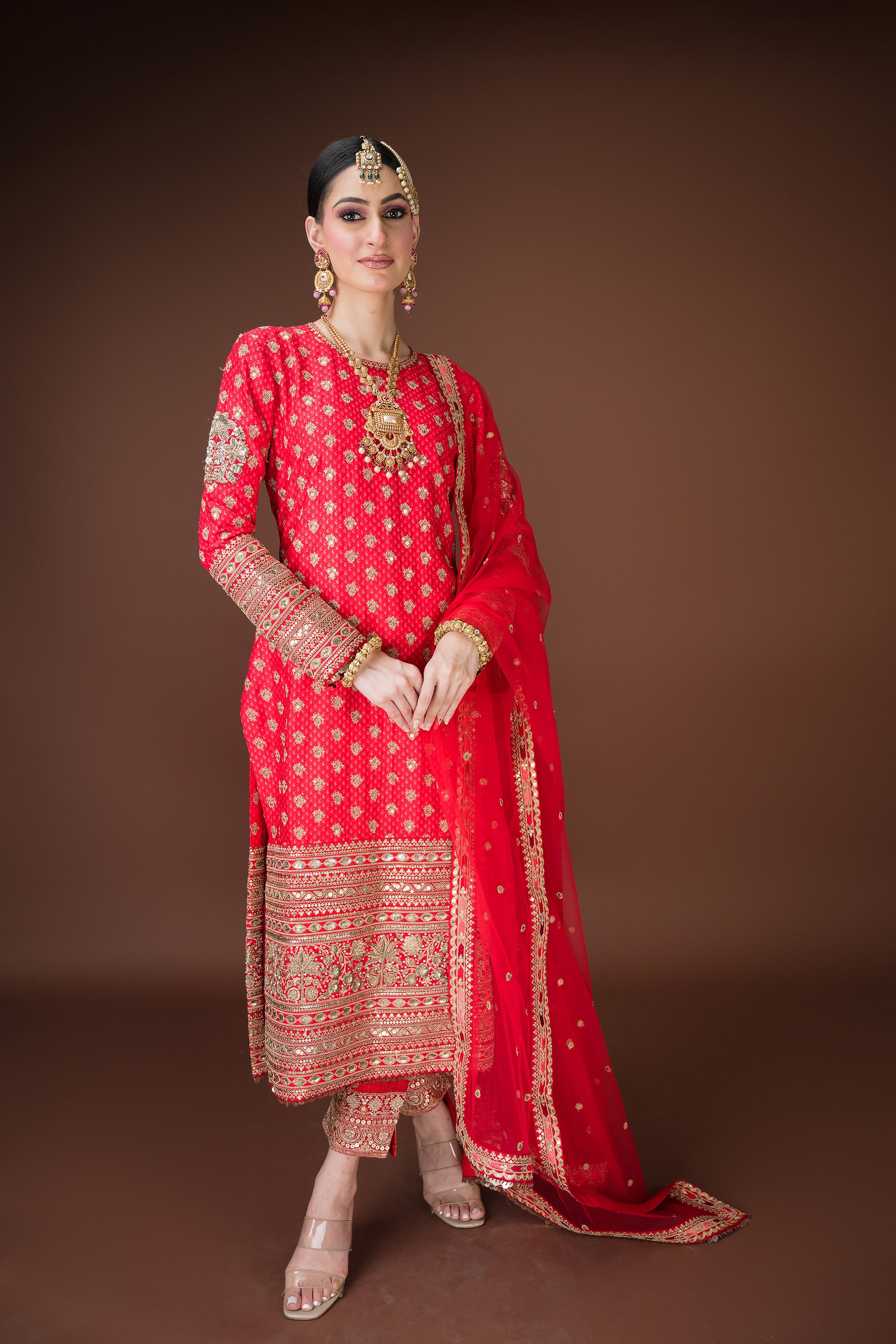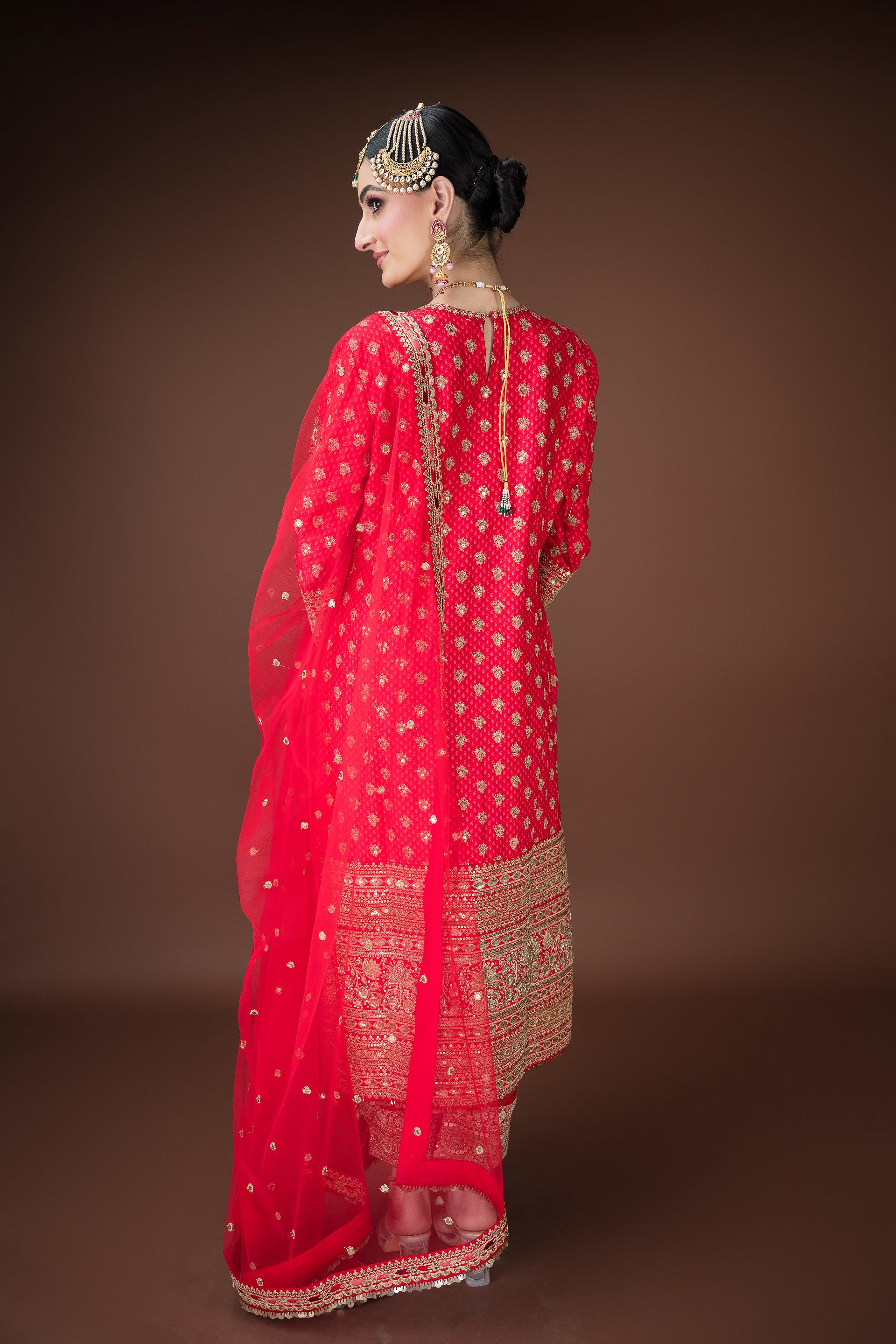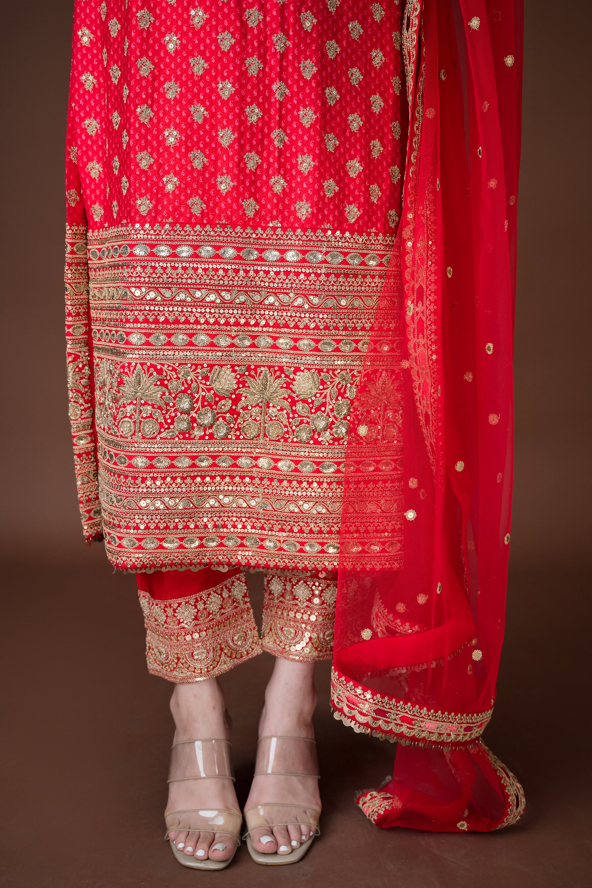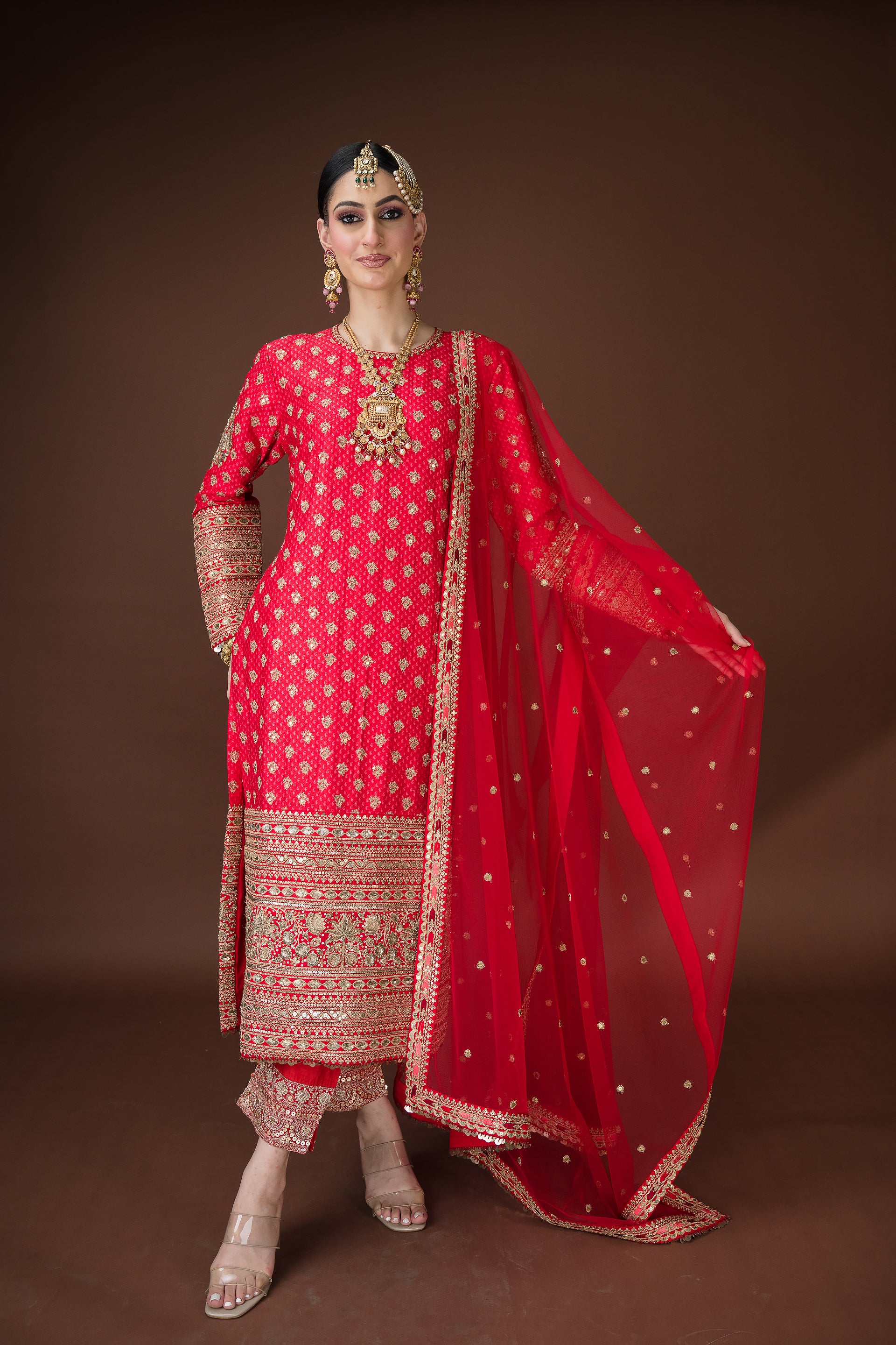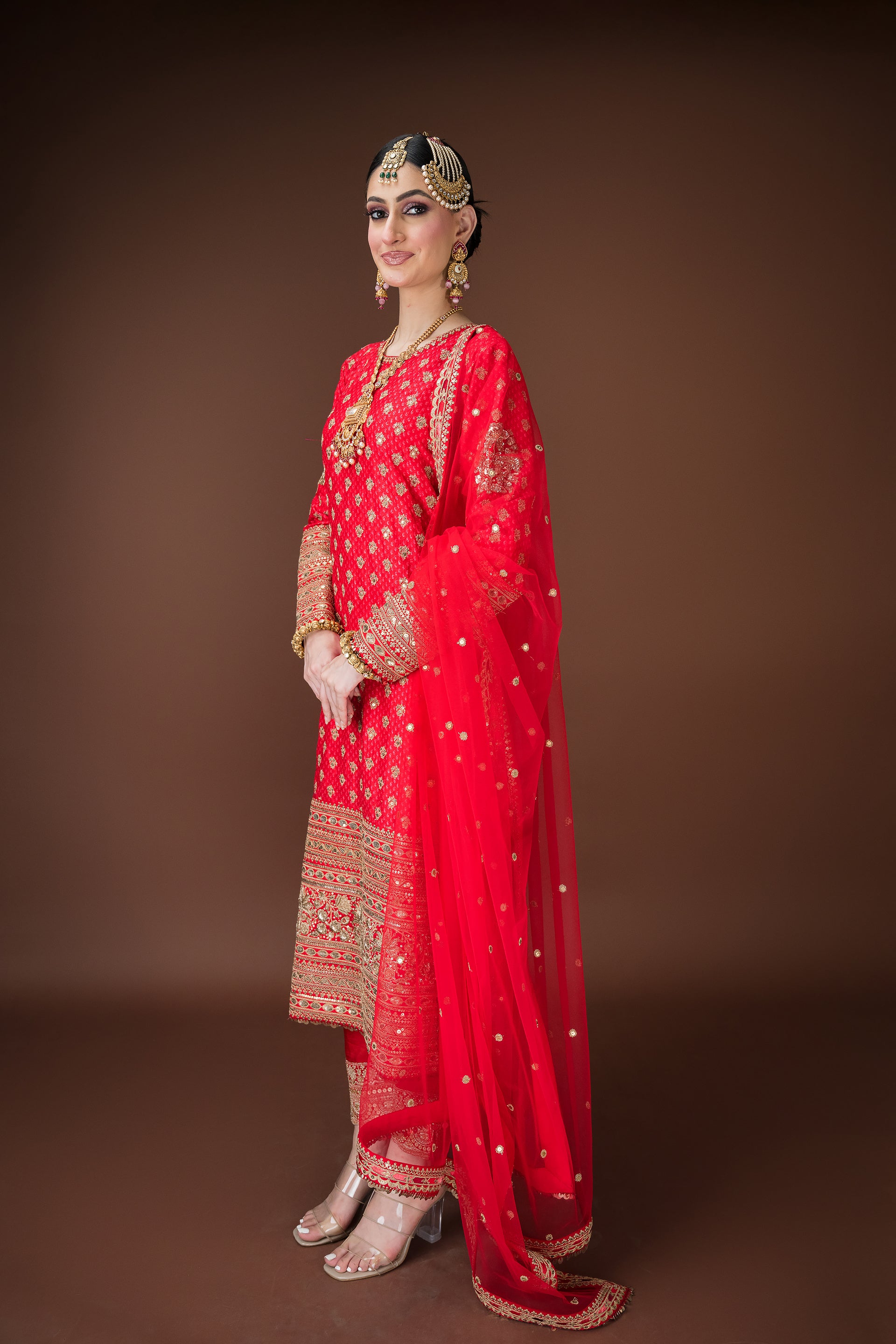 A classic sindoori red raw silk suit intricately embroidered with zardozi, sequins, and resham threadwork. The straight kurta is paired with scalloped hem pants featuring complementary detailing. The look is completed with a net dupatta adorned with scattered sequins and a heavily embroidered border, perfect for wedding rituals or traditional ceremonies.