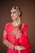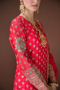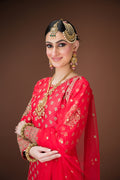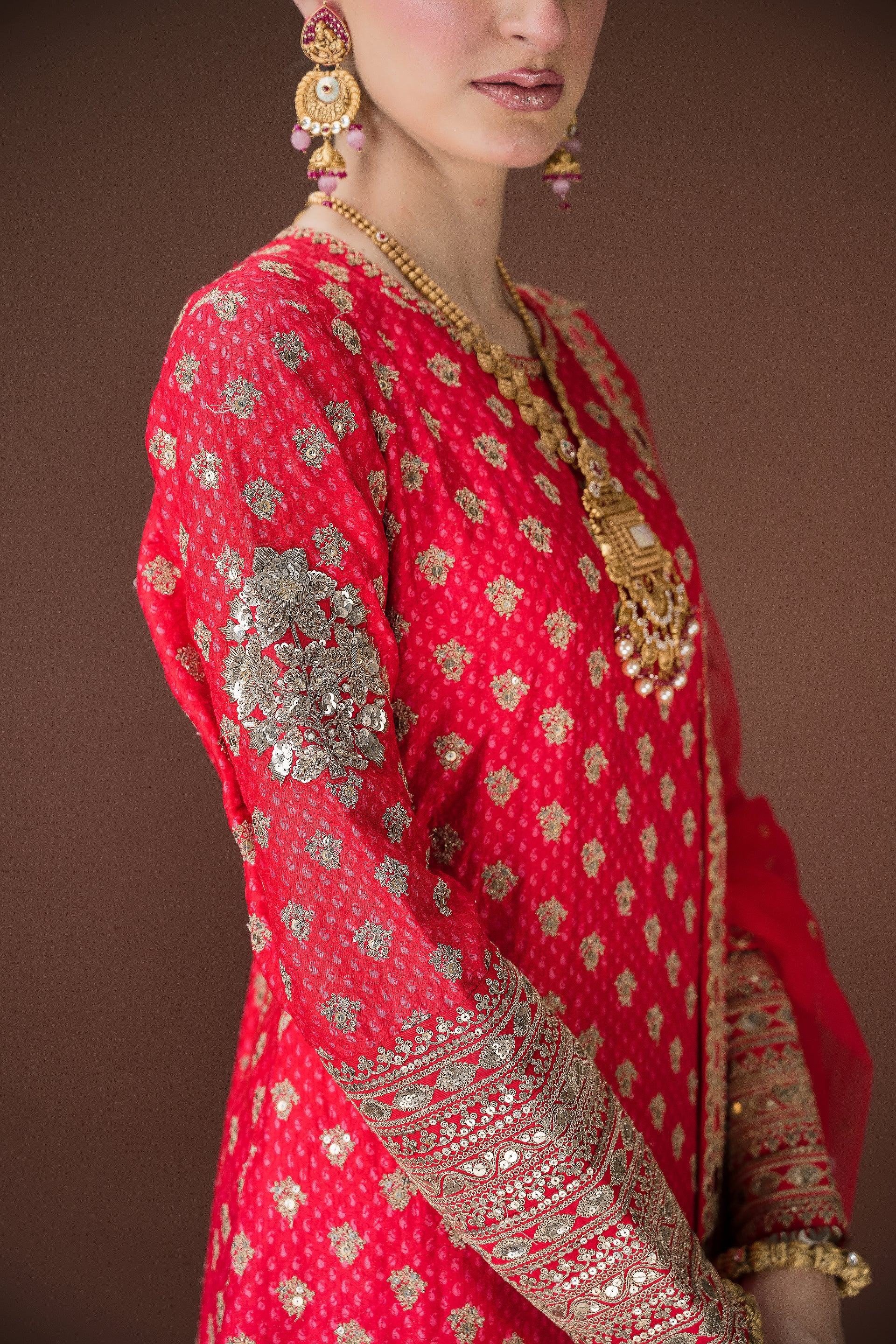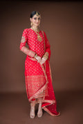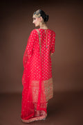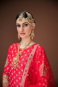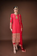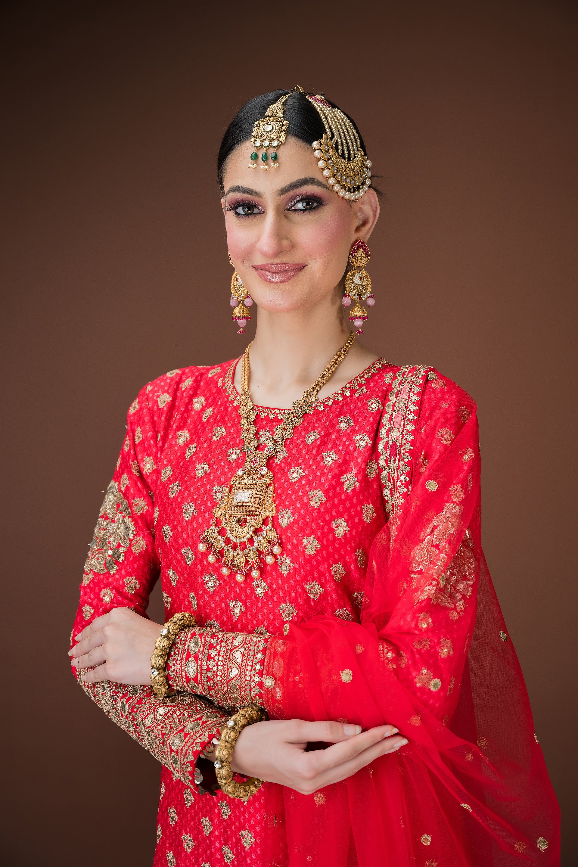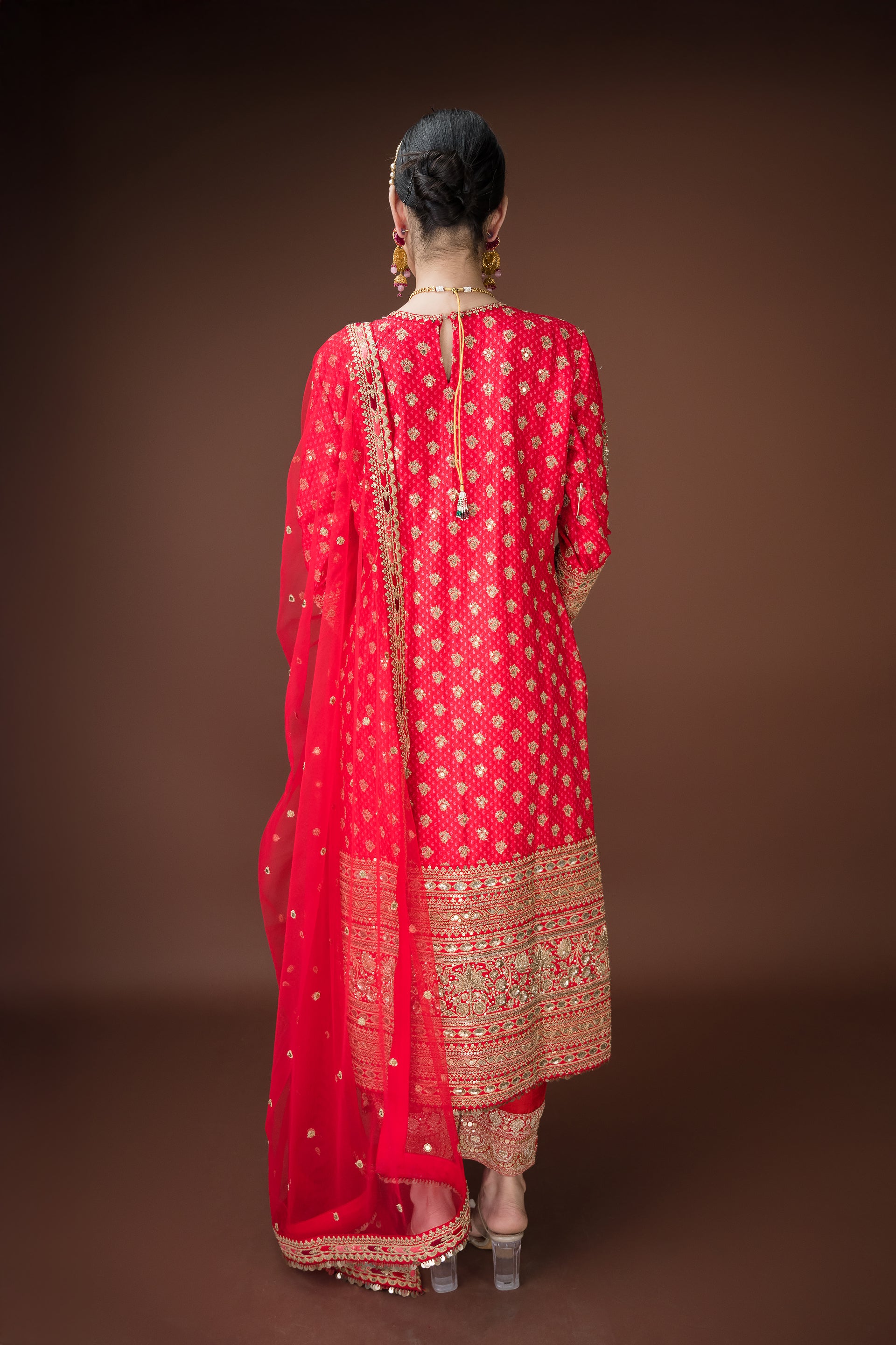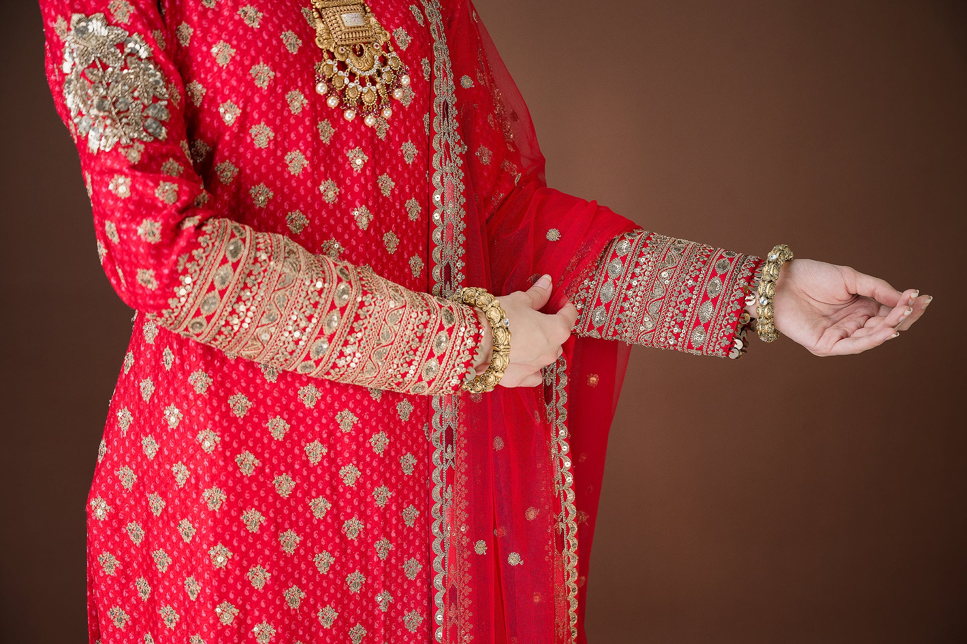 A classic sindoori red raw silk suit intricately embroidered with zardozi, sequins, and resham threadwork. The straight kurta is paired with scalloped hem pants featuring complementary detailing. The look is completed with a net dupatta adorned with scattered sequins and a heavily embroidered border, perfect for wedding rituals or traditional ceremonies.