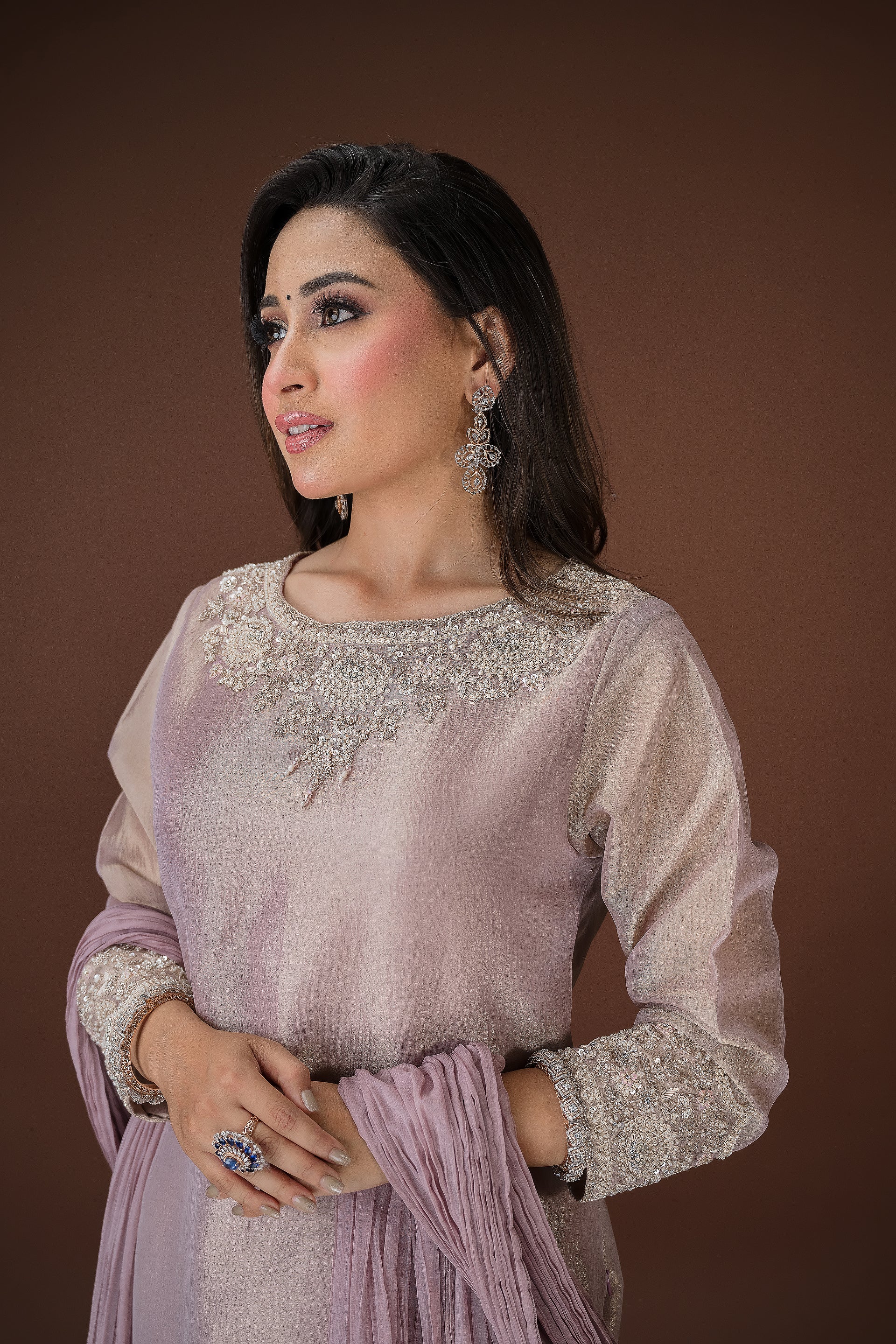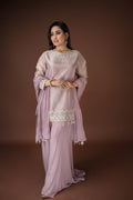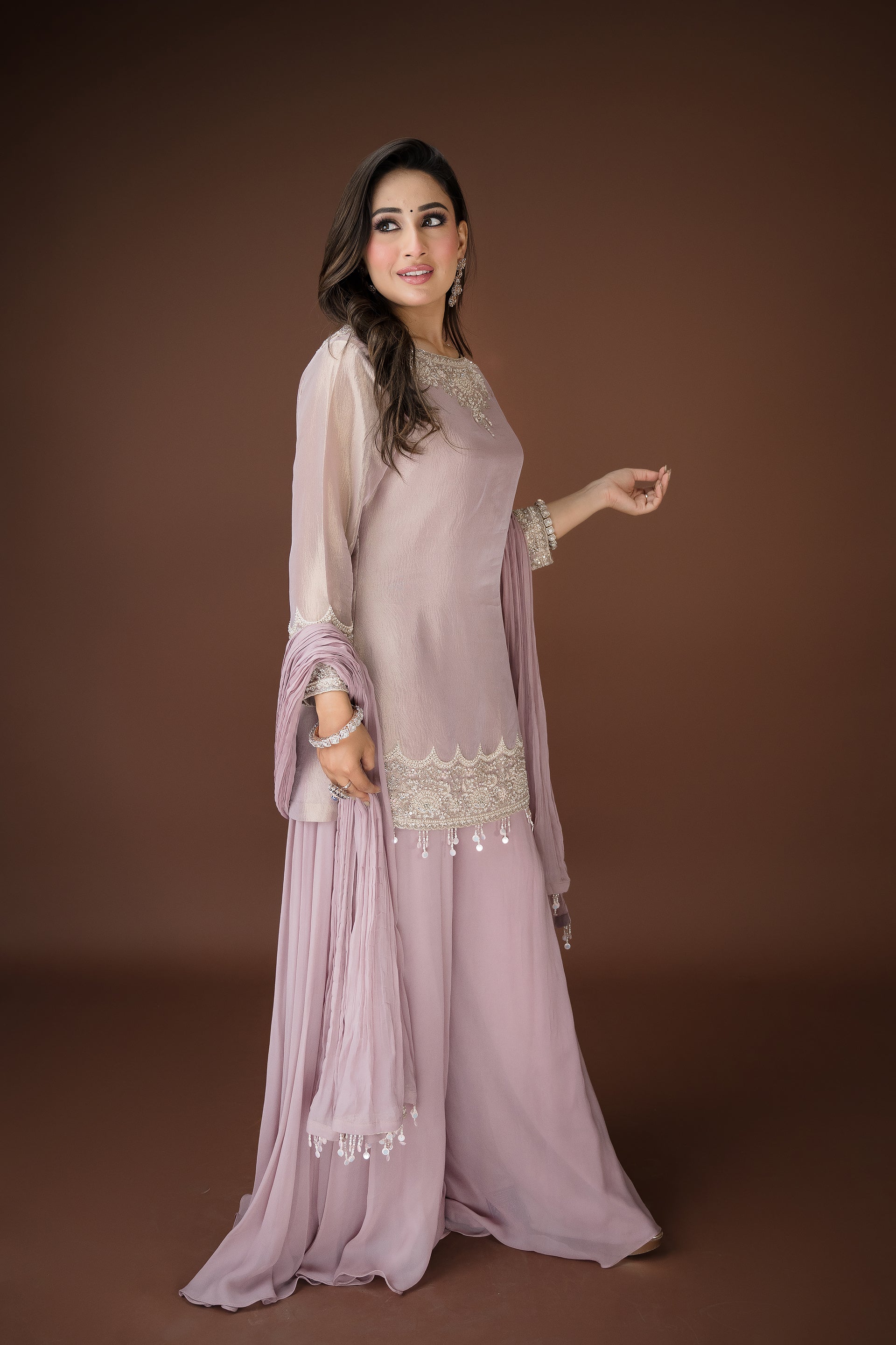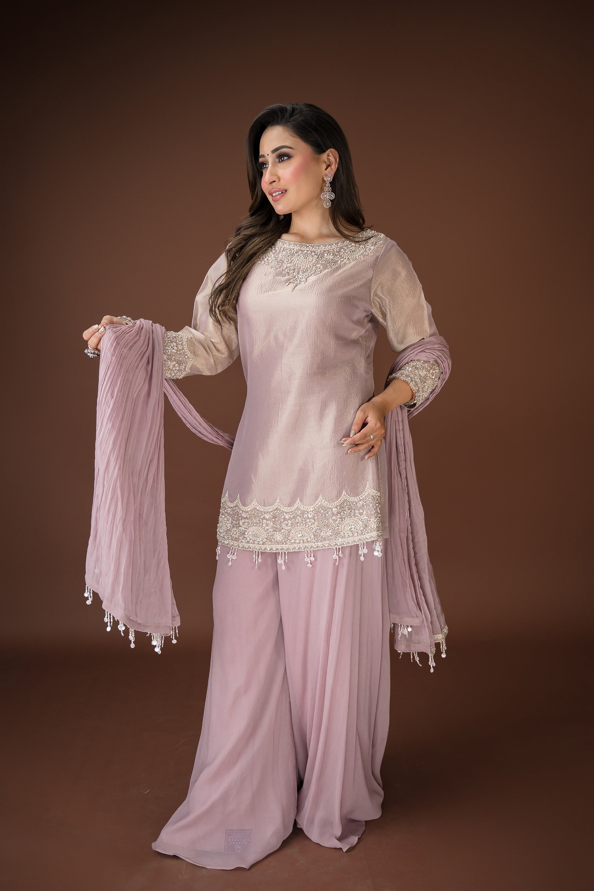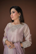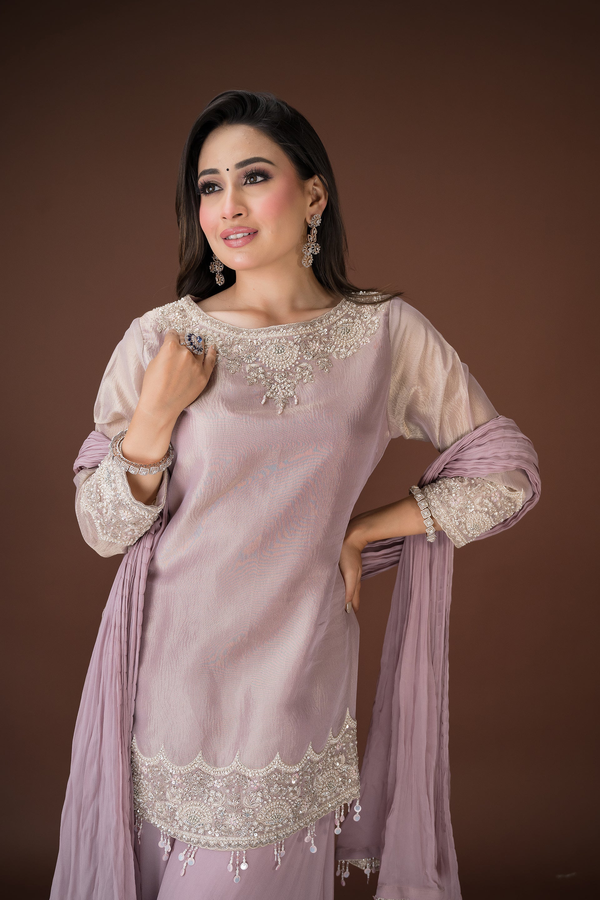 this lavender ensemble featuring a beautifully embroidered tunic done in silver dabka and sequins work and flowing palazzo pants. The delicate beading on the sheer shawl adds a refined touch, while the soft lavender hue exudes grace and sophistication