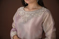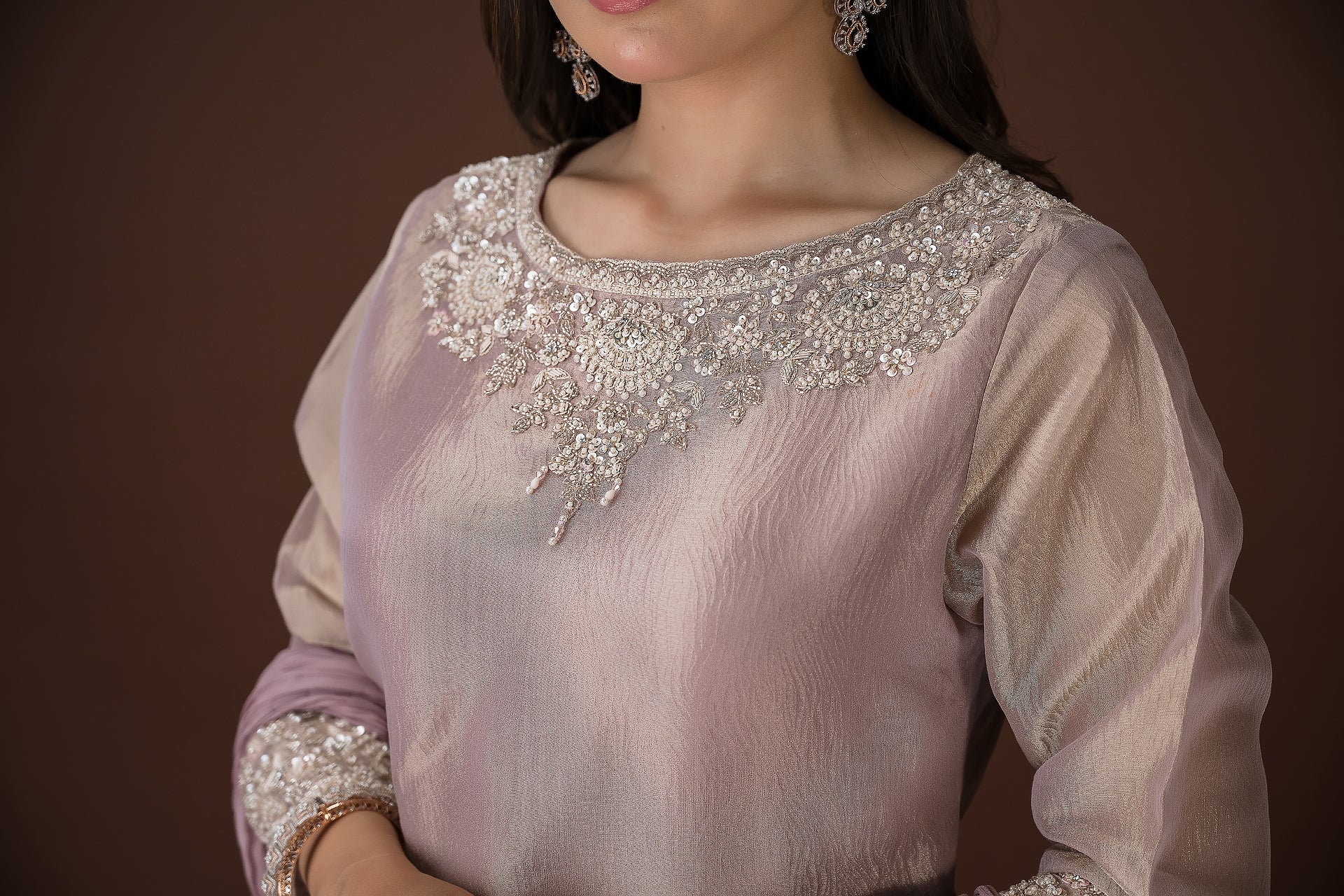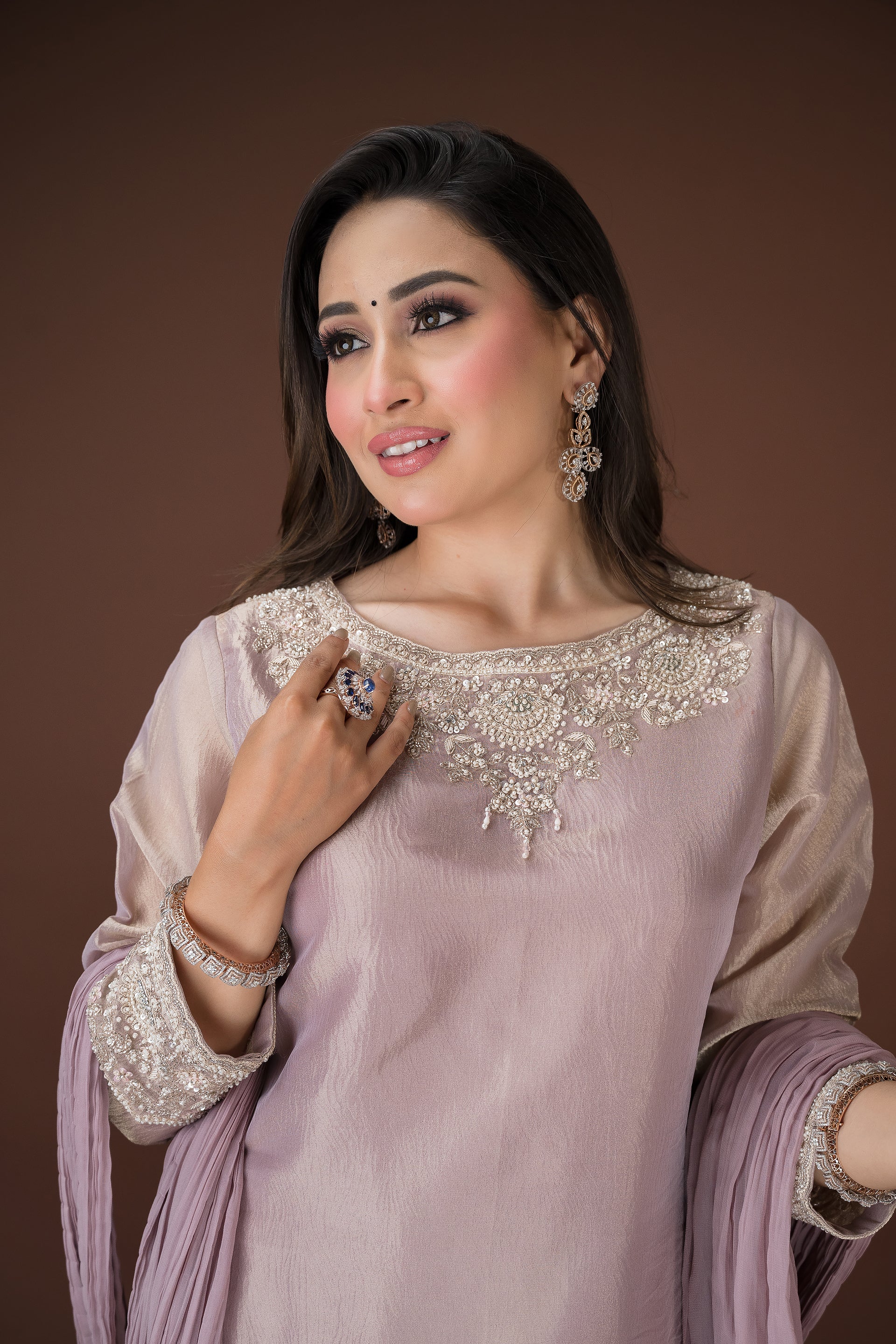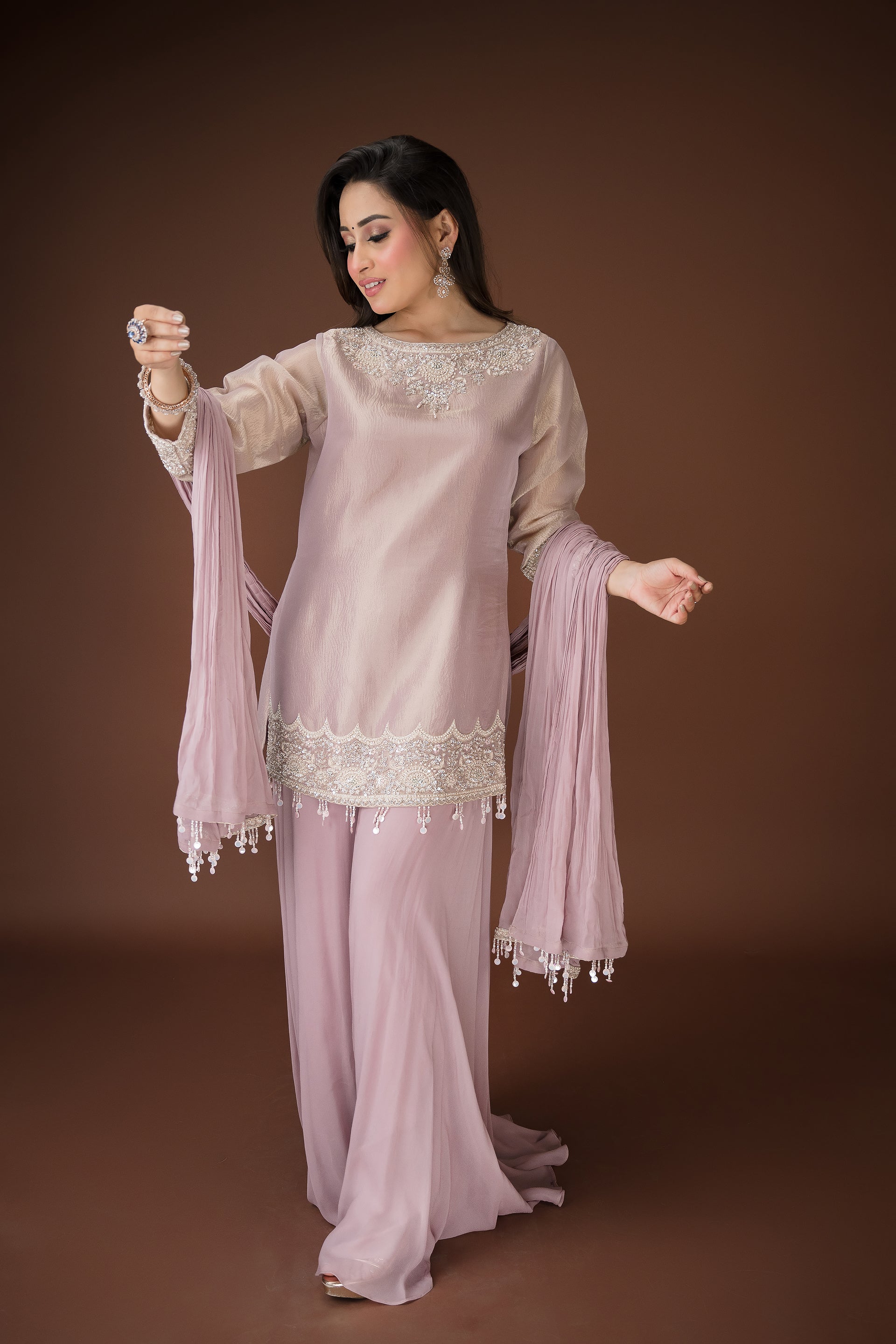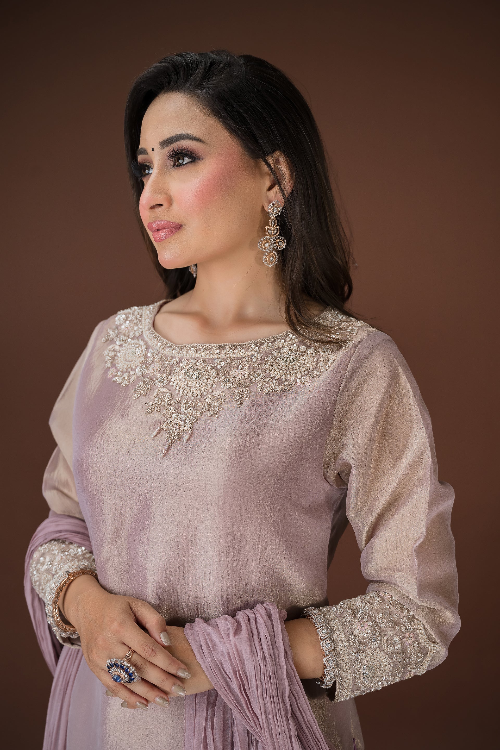 this lavender ensemble featuring a beautifully embroidered tunic done in silver dabka and sequins work and flowing palazzo pants. The delicate beading on the sheer shawl adds a refined touch, while the soft lavender hue exudes grace and sophistication