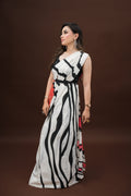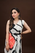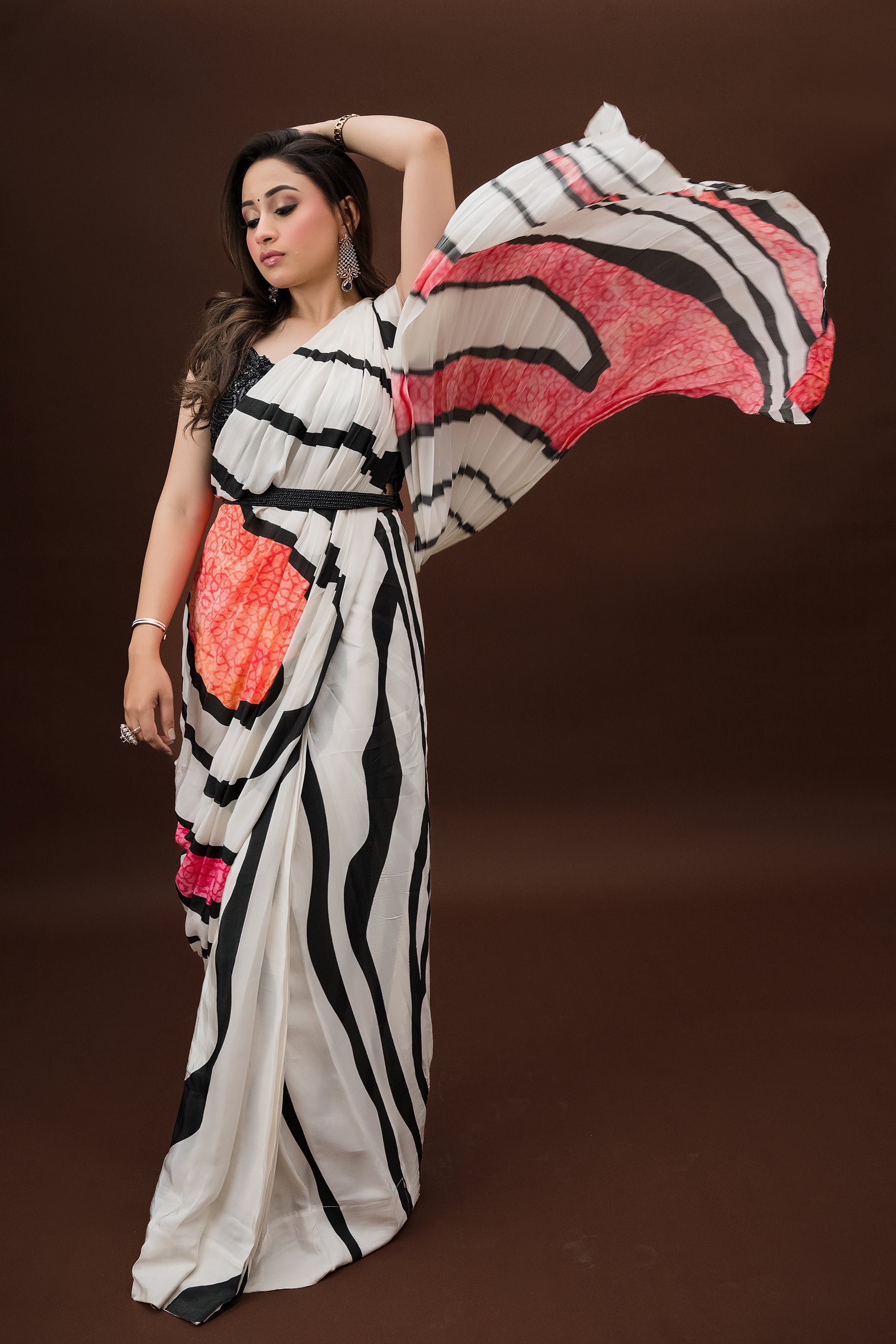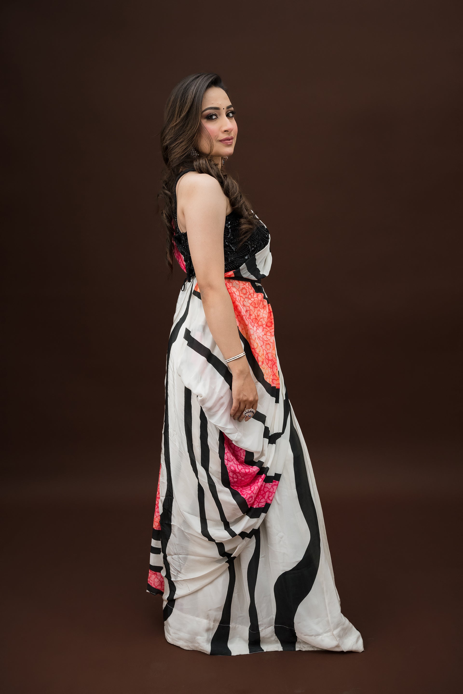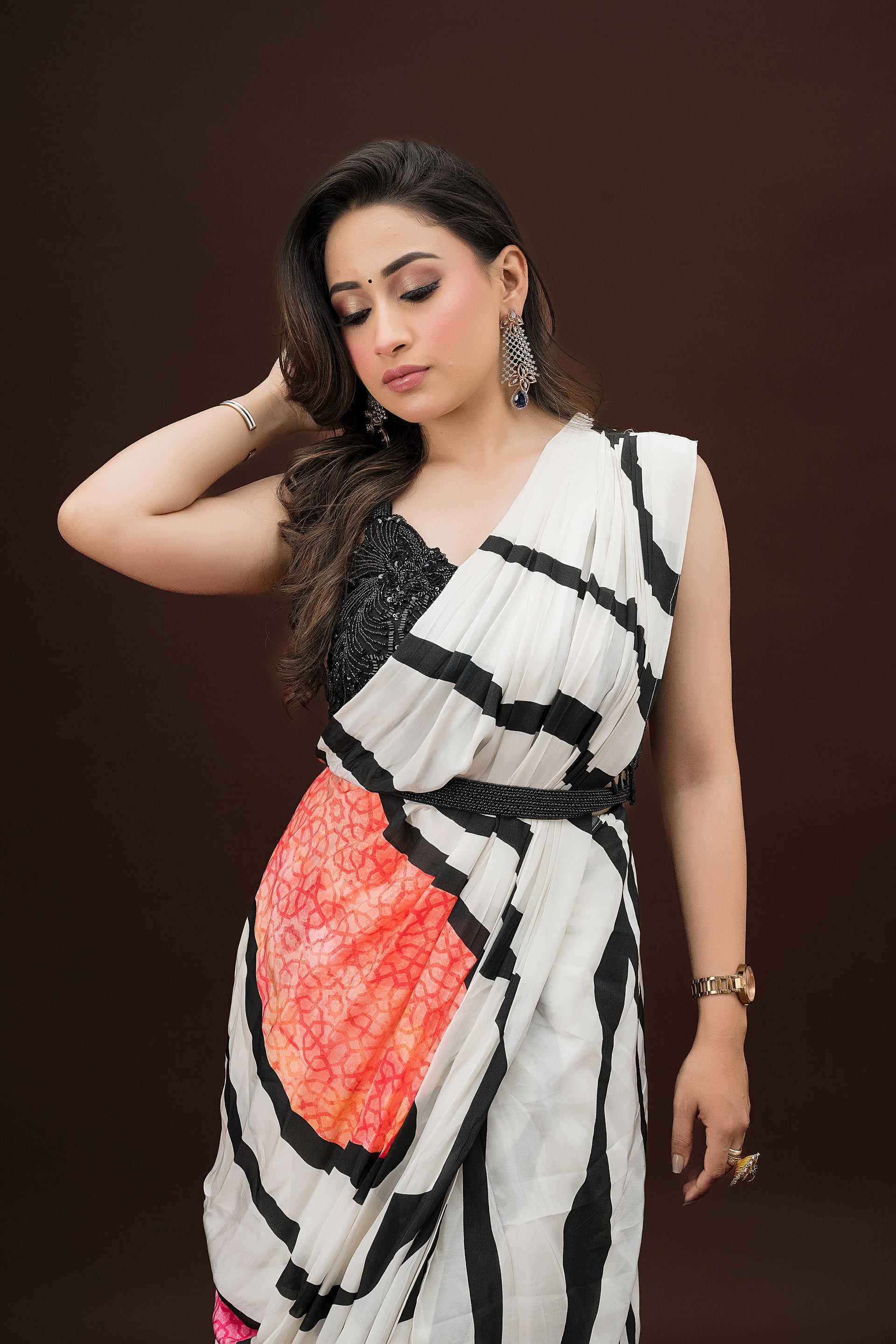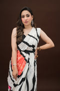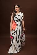 This contemporary white and black striped saree is paired with a vibrant pink and orange border, with a black blousenadorned with montonone sequins handwork adding a bold and modern twist to the traditional silhouette.